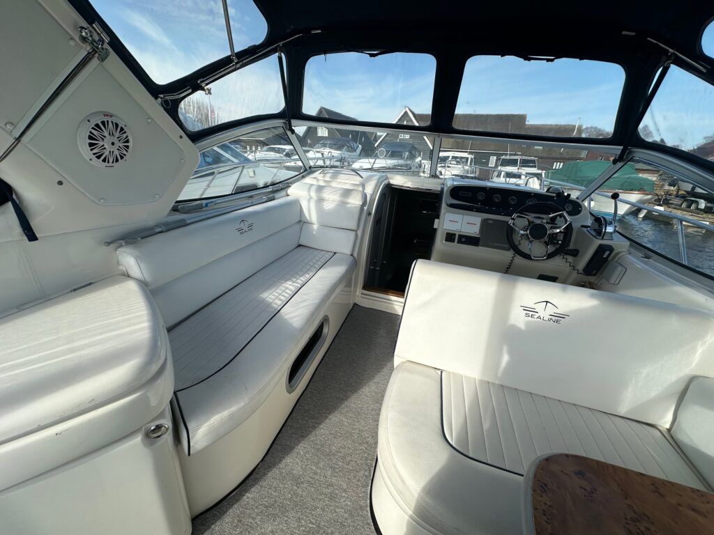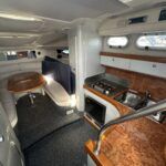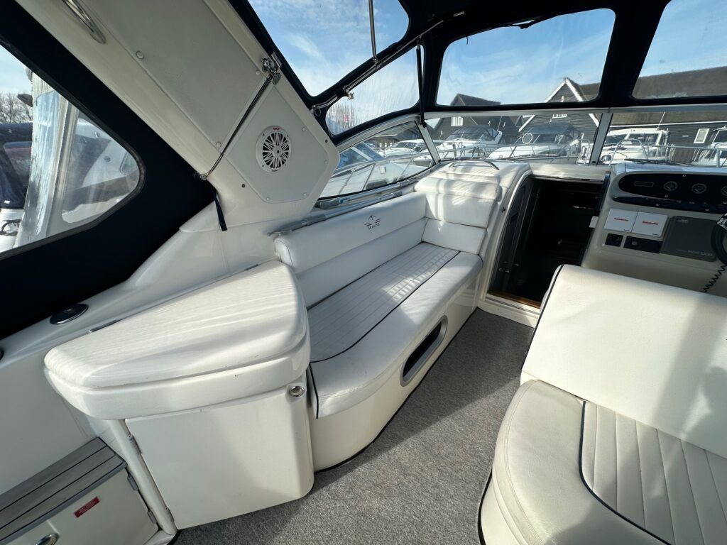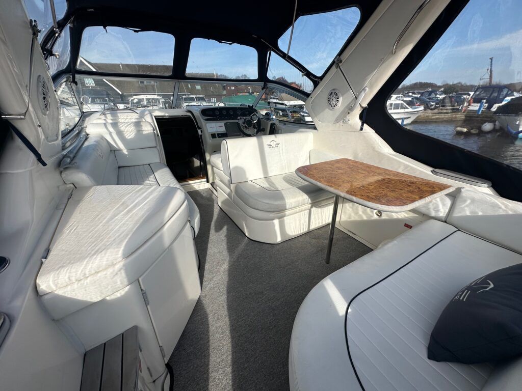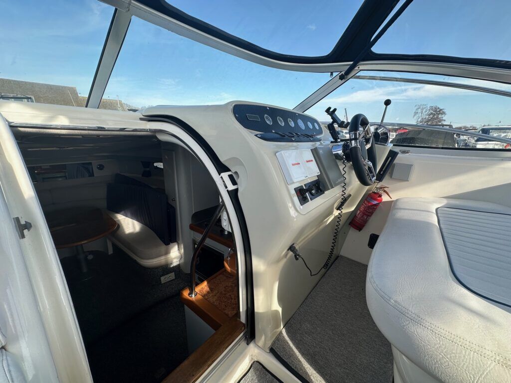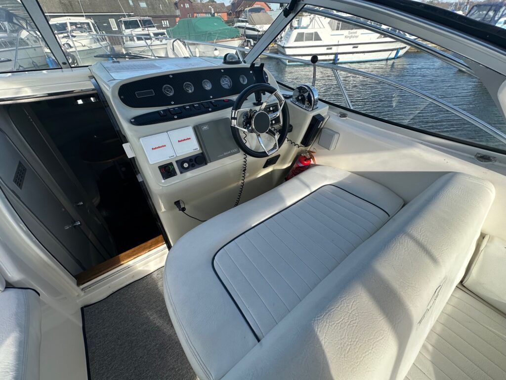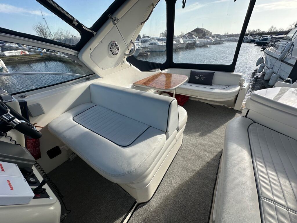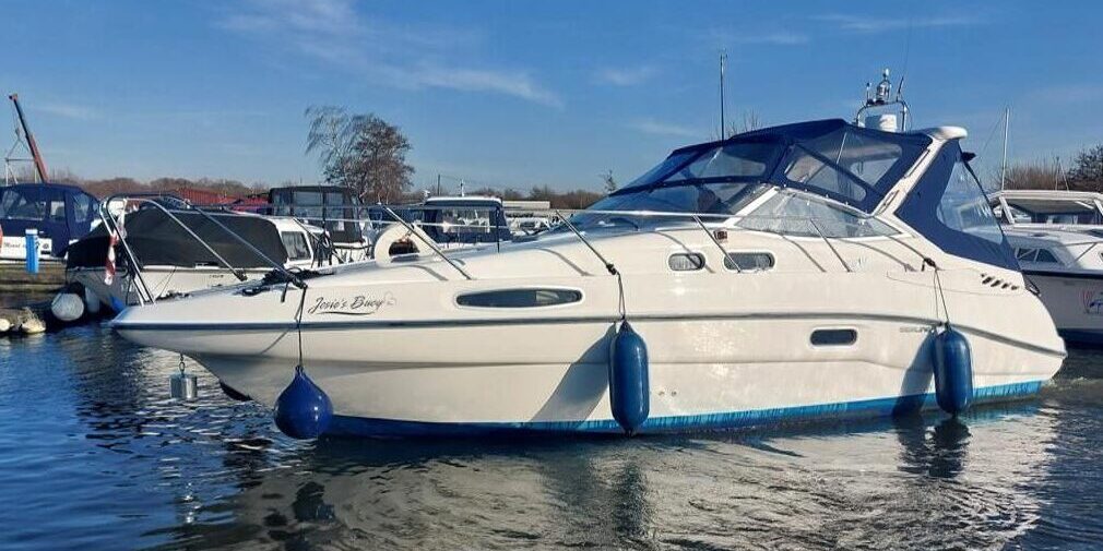 Sealine S28 – 1996 – Single Volvo KAD42 230hp diesel engine through a sterndrive. 4 berth accommodation with a single toilet/shower compartment. Specification to include; bow-thruster, warm air heating, folding radar arch, battery charger, radar, speed and depth logs, fore-deck sun-cushions. “Josie’s Buoy” is a tidy example of these ever popular sports cruisers, and comes with a folding radar arch providing a low air-draft. More pictures to follow.