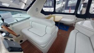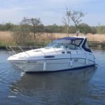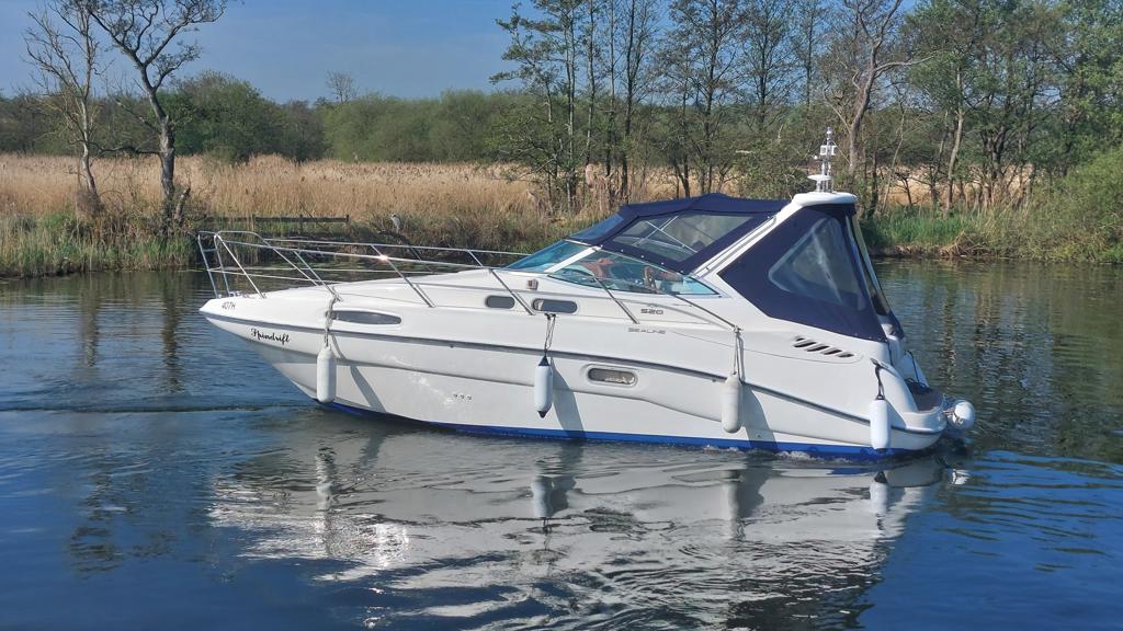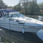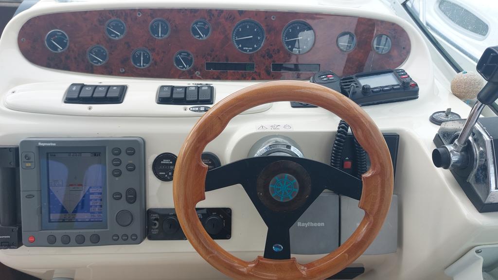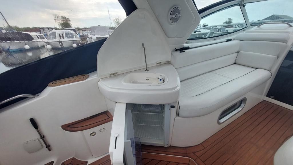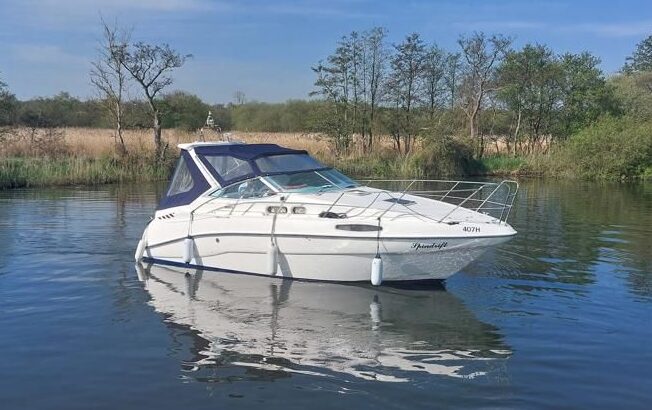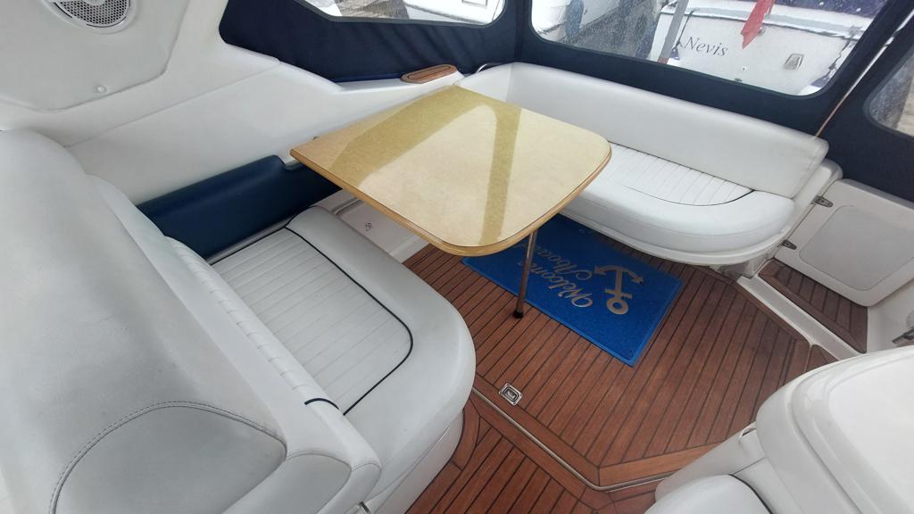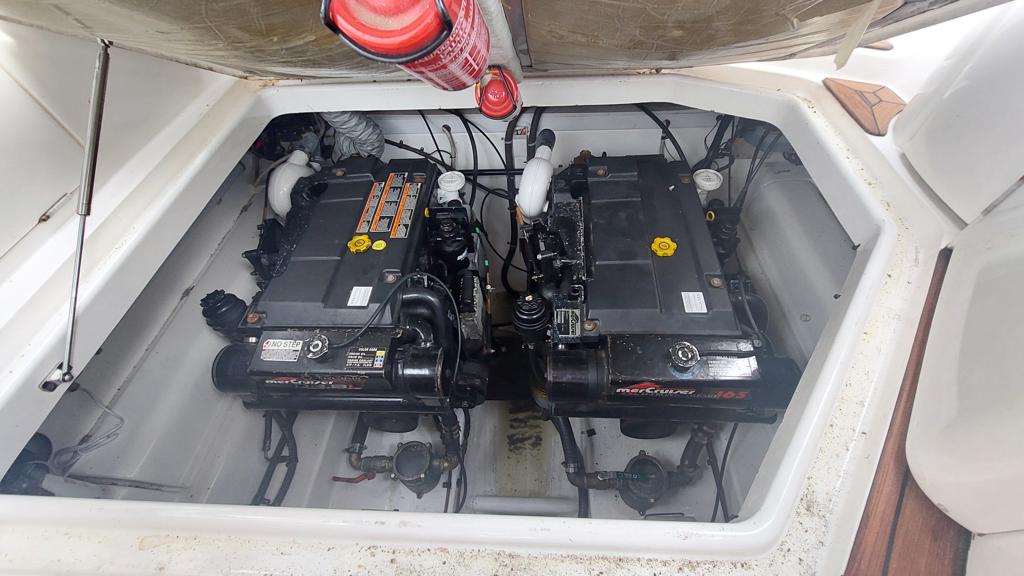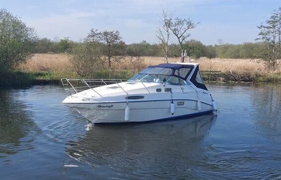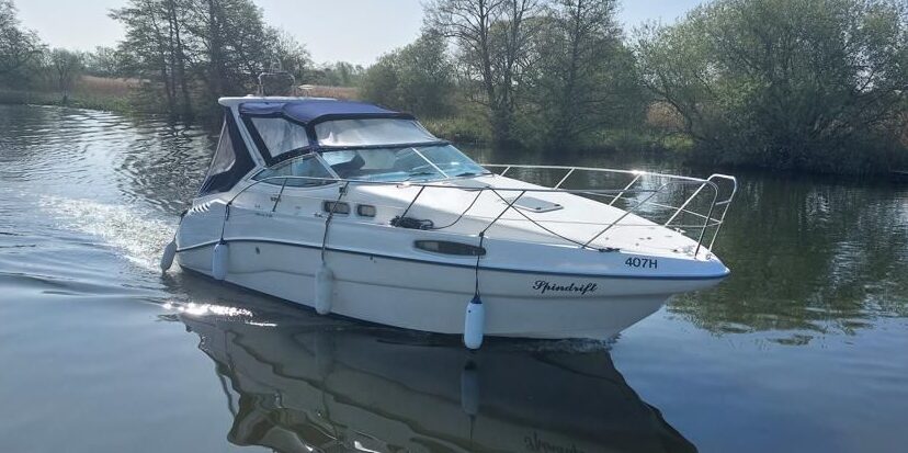 Sealine S28 – 1999 – Twin Mercruiser D2.8l D-Tronic 165hp diesel engines. 4 berth accommodation with large social cockpit. Specification includes; Radar & Plotter, warm air heating, holding tank, battery charger etc. “Spindrift” is a very clean, smart and tidy vessel, the S28 offering a great socialising space together with comfortable accommodation. Engines and drives serviced November 2024, polished and anti-fouled April 2025, BSC 02/03/2027.