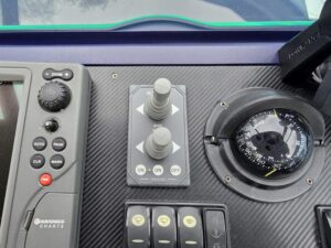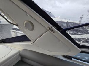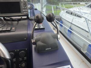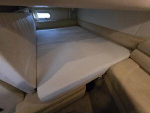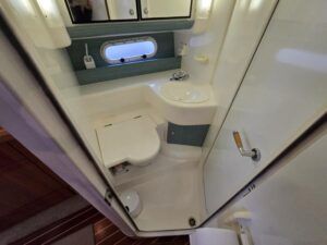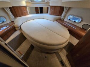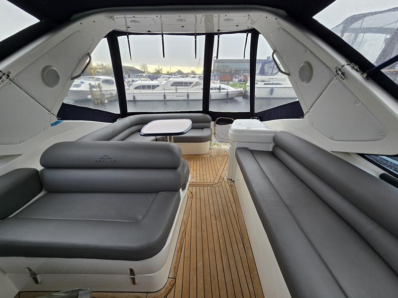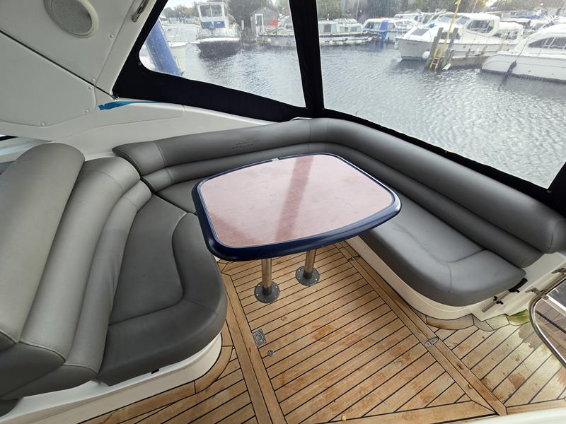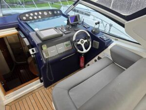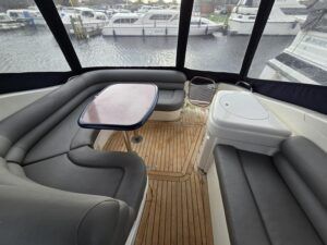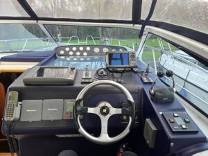 Sealine S34 – 2004 – 2x Volvo KAD44EDC 260hp 6 cylinder turbo diesel engines. 6 berth accommodation with a separate toilet and shower compartment. Well specified including: Bow thruster, stern thruster, warm air heating, Raymarine plotter and autopilot, teak cockpit, leather saloon upholstery, new cockpit upholstery 2019, A lightly used example featuring desirable high-performance KAD44 engines and a practical folding radar arch, offering significantly reduced air draft for inland cruising.