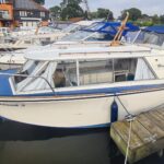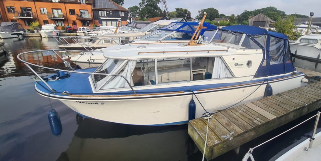 Seamaster 23 – 1975 – Single Perkins 4.108 45hp diesel engine through an Enfield 130 sterndrive. 3 to 4 berth accommodation with a single toilet compartment. Specification to include; folding screens, warm air heating, shore power, holding tank, full instrumentation. “Womack 3” is a tidy example of these very popular Seamaster vessels. She has a bright, airy interior but would benefit from some attention. BSC 25/05/25.