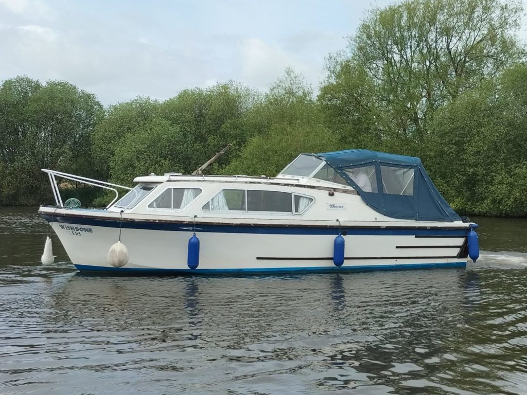 Seamaster 27 – 1970 – Powered by a single Wortham Blake Ford 1600cc 35hp petrol engine through a shaft; Specification to include Super Calor 2 burner gas hob, grill and oven, Dometic fridge, 2.4w solar battery charger. A classic river boat with low air draft allowing access to almost all of the Norfolk Broads. Boat Safety Certificate 4 June 2025