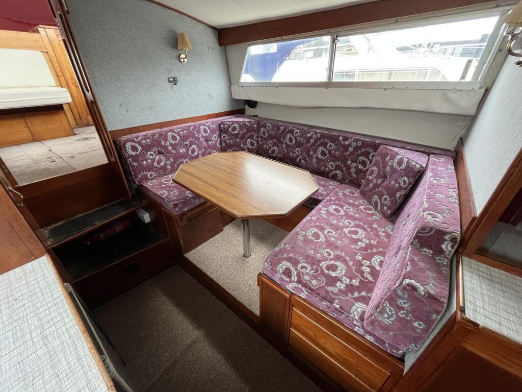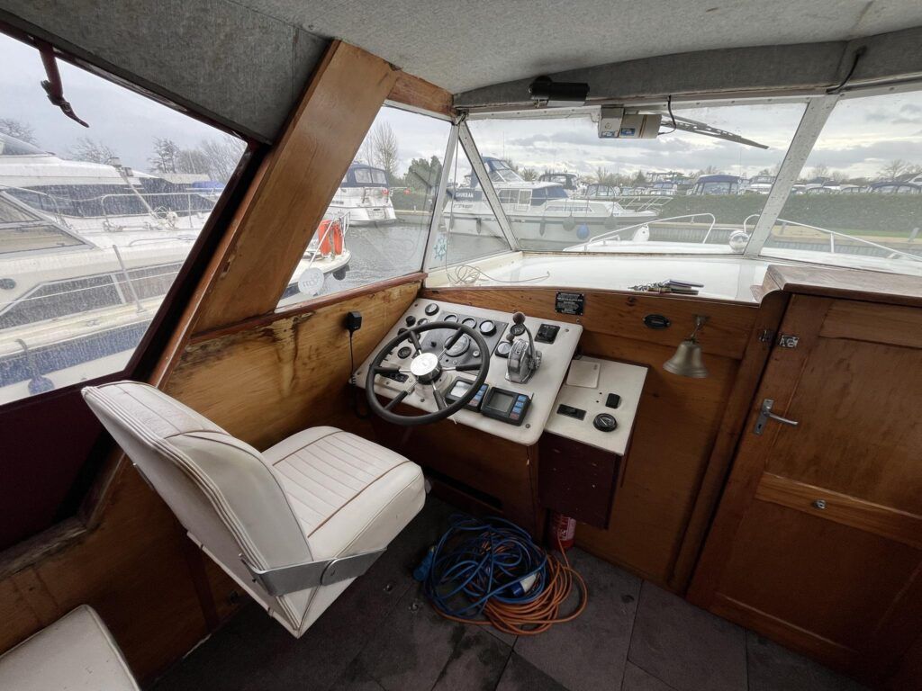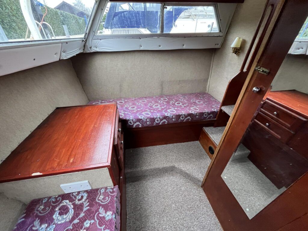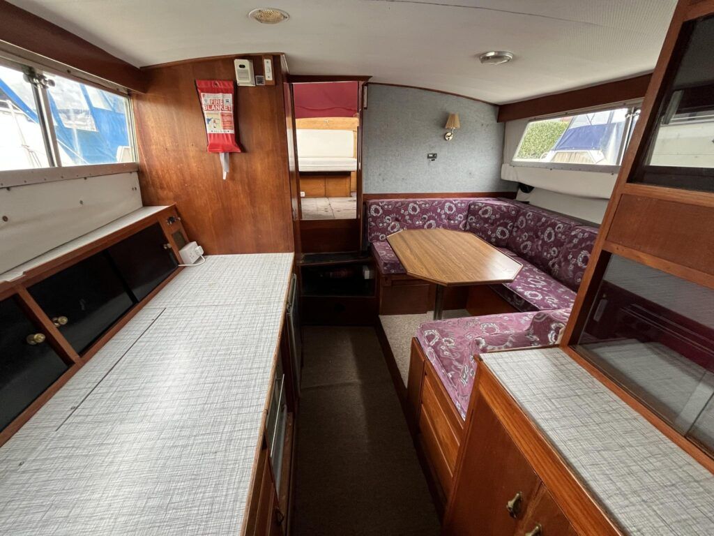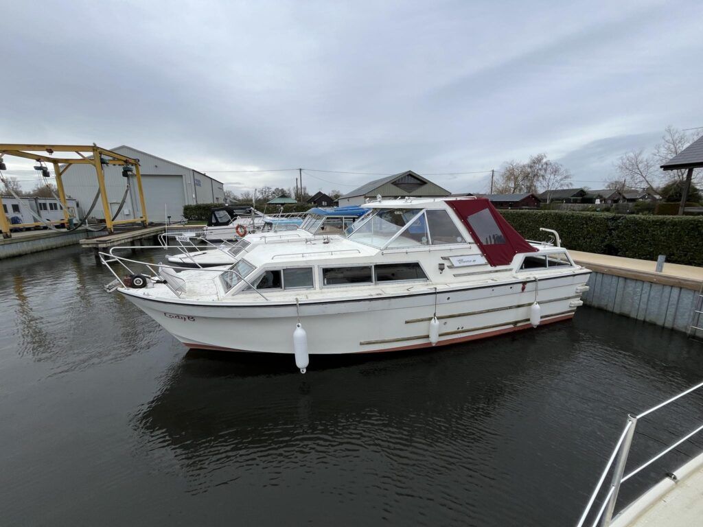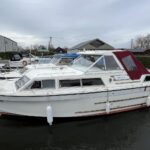 Seamaster 30 – Circa 1980 – Powered by a Perkins diesel engine. 6 berth accommodation, shower, Electrolux fridge, hob oven and grill, hot and cold pressurised water system , anchor winch, davits, Nasa speed and depth, webasto warm air heating, shore power, Sought after diesel and shaft configuration, A spacious family starter boat for exploring the waterways.