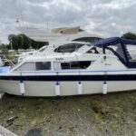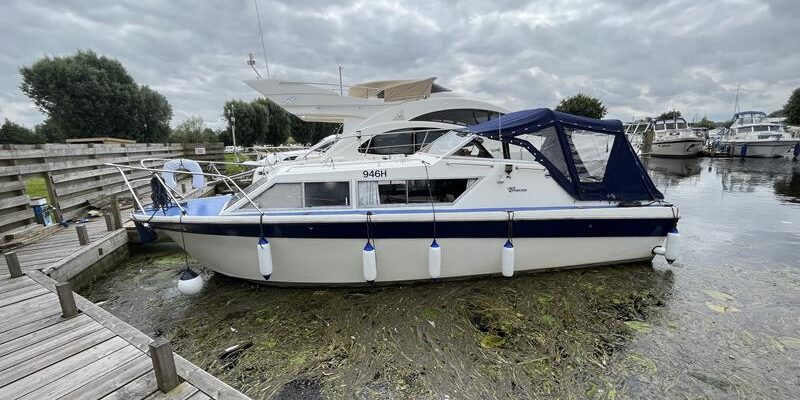 Seamaster 813 – 1979 – Powered by a BMC 1.8 diesel engine on a shaft. 4 berths in 2 cabins with Jabsco electric toilet to holding tank and shower. Specification to include shore power supply, battery charger with 240v sockets, heating, immersion/calorifier, full galley to including 2 burner hob, oven and grill, refrigerator and sink. New batteries 2023. Antifouled and serviced 2023. BSC 2027. A well kept Seamaster 813 ideal for exploring the inland waterways.