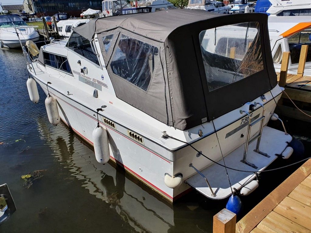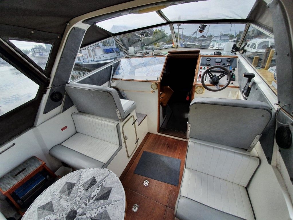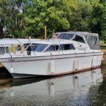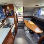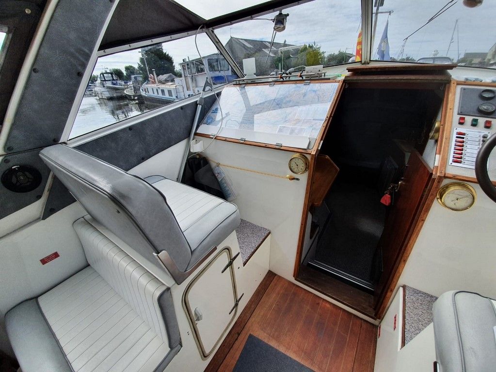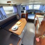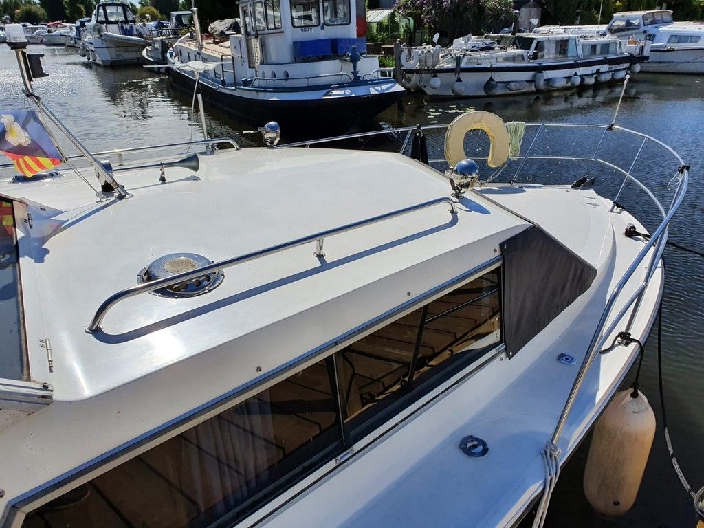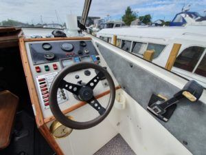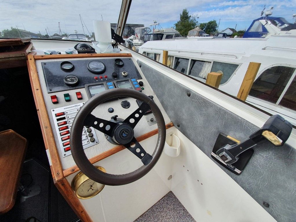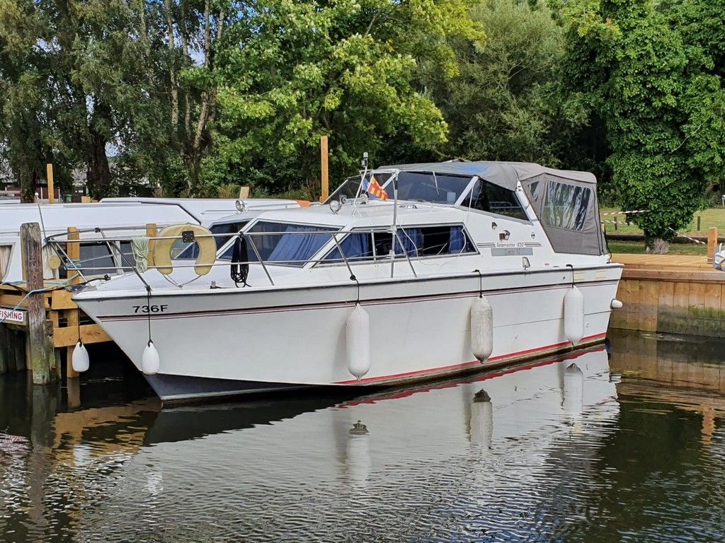 SEAMASTER 820 – 1991 – Powered by a single Beta 43hp diesel through a shaft – 4 berth accommodation with toilet and shower. Specification to include; Warm air heating, holding tank, bowthruster, calorifier, shore power with battery charger. Engine, shaft and propeller replaced 2012. Serviced annually by owner. BSC 09/21. Folding arch and screens. A well equipped river cruiser, sought after diesel economy with shaft configuration. Used to cruise the Broads in current 7 year ownership, a well presented example.