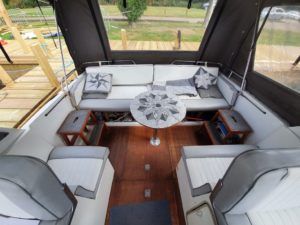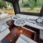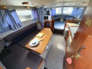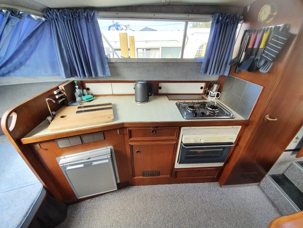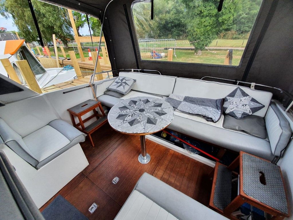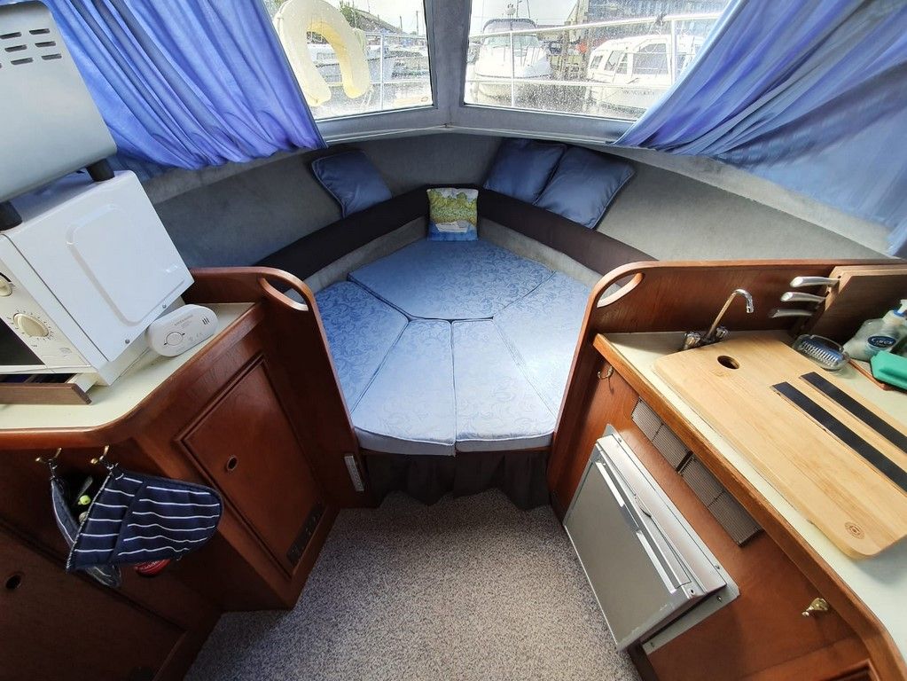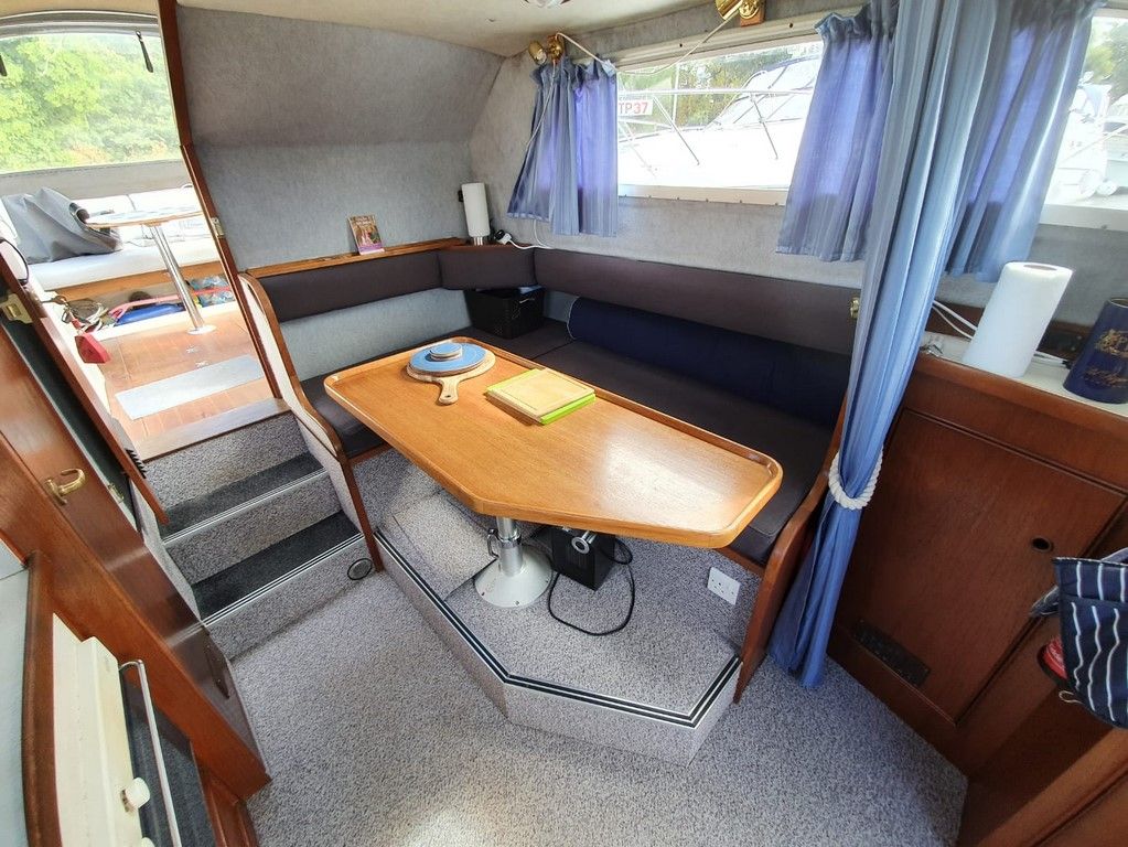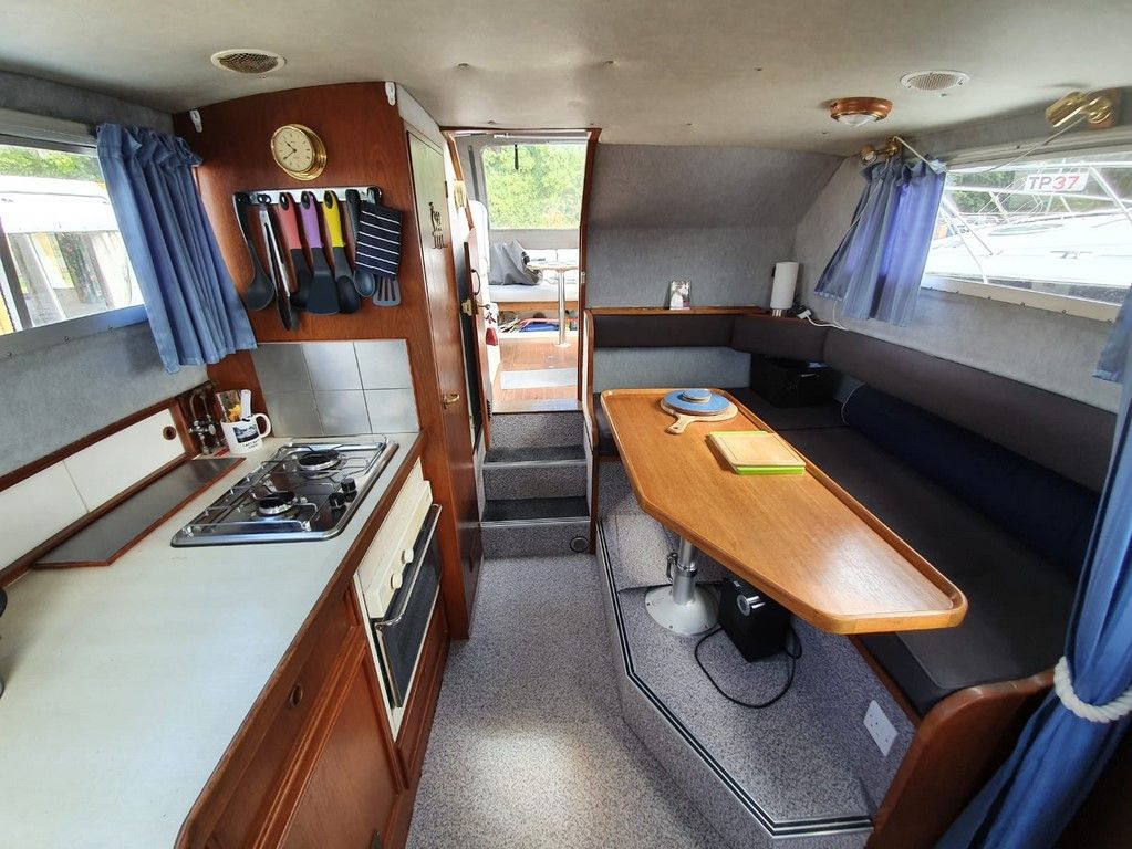 SEAMASTER 820 – 1991 – Powered by a single Beta 43hp diesel through a shaft – 4 berth accommodation with toilet and shower. Specification to include; Warm air heating, holding tank, bowthruster, calorifier, shore power with battery charger. Engine, shaft and propeller replaced 2012. Serviced annually by owner. BSC 09/21. Folding arch and screens. A well equipped river cruiser, sought after diesel economy with shaft configuration. Used to cruise the Broads in current 7 year ownership, a well presented example.