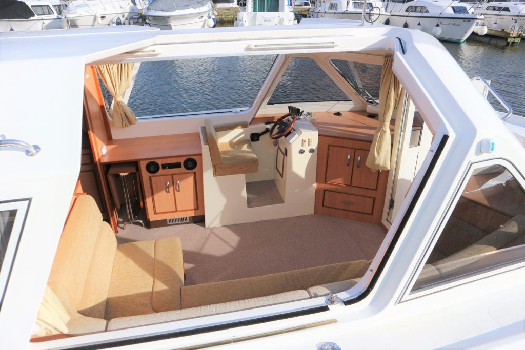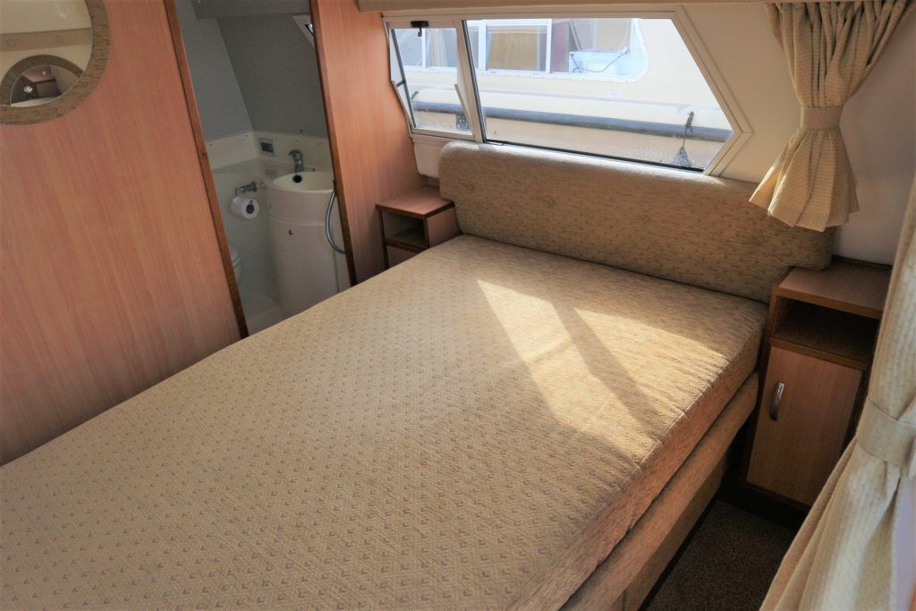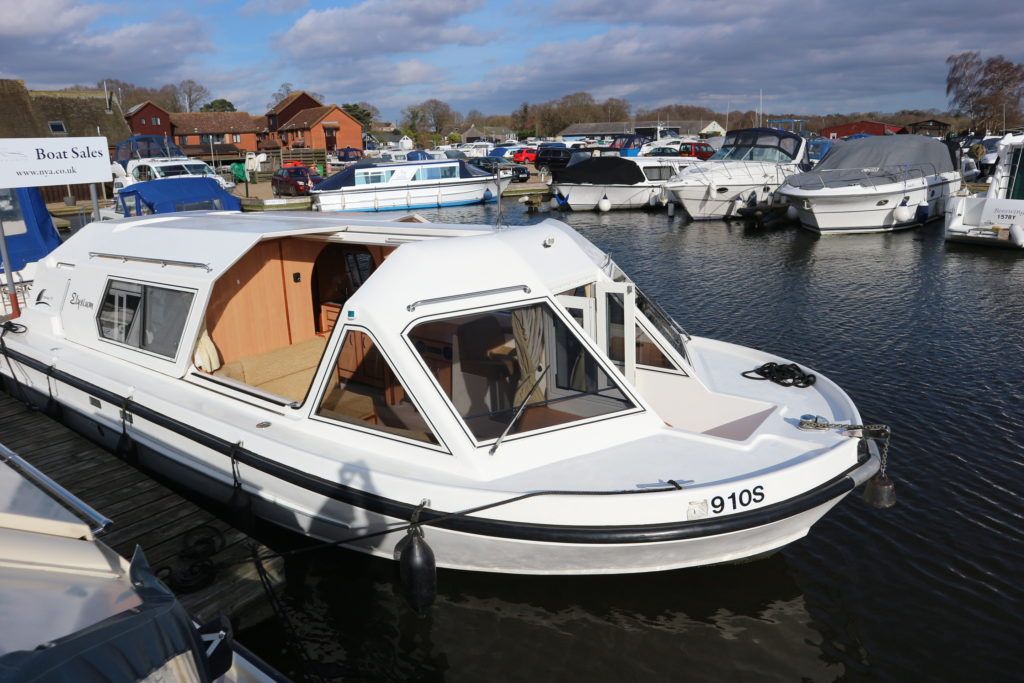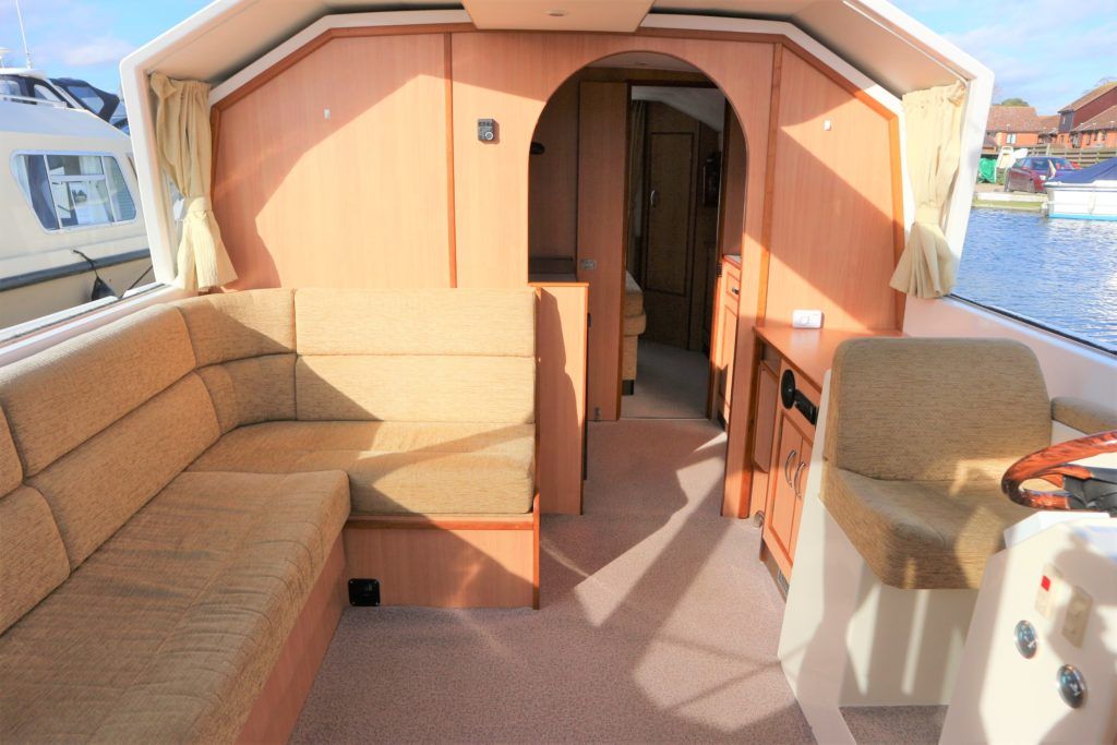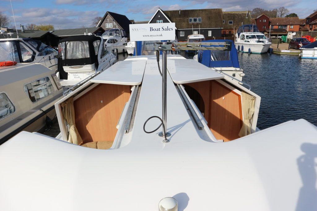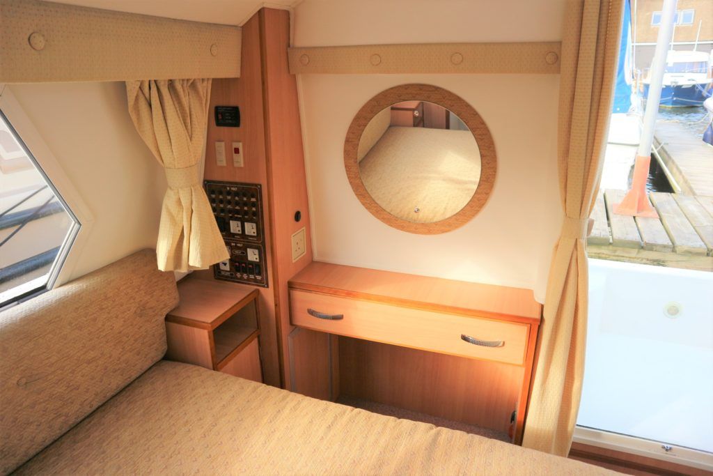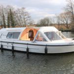 SHADOW/ALPHA 31 – 2010 – Powered by a Beta 30hp diesel engine. 4 berth accommodation in master island double en-suite cabin and saloon. Galley with full cooker, microwave, fridge & sink. High specification including bow thruster, electric windlass, shore power, battery charger, inverter, immersion heater, warm air heating, electric toilet, reversing camera, speed & depth log, split sliding roof over saloon, BSC 10/22. A lovely example of this popular style river cruiser with a high specification and spacious accommodation.