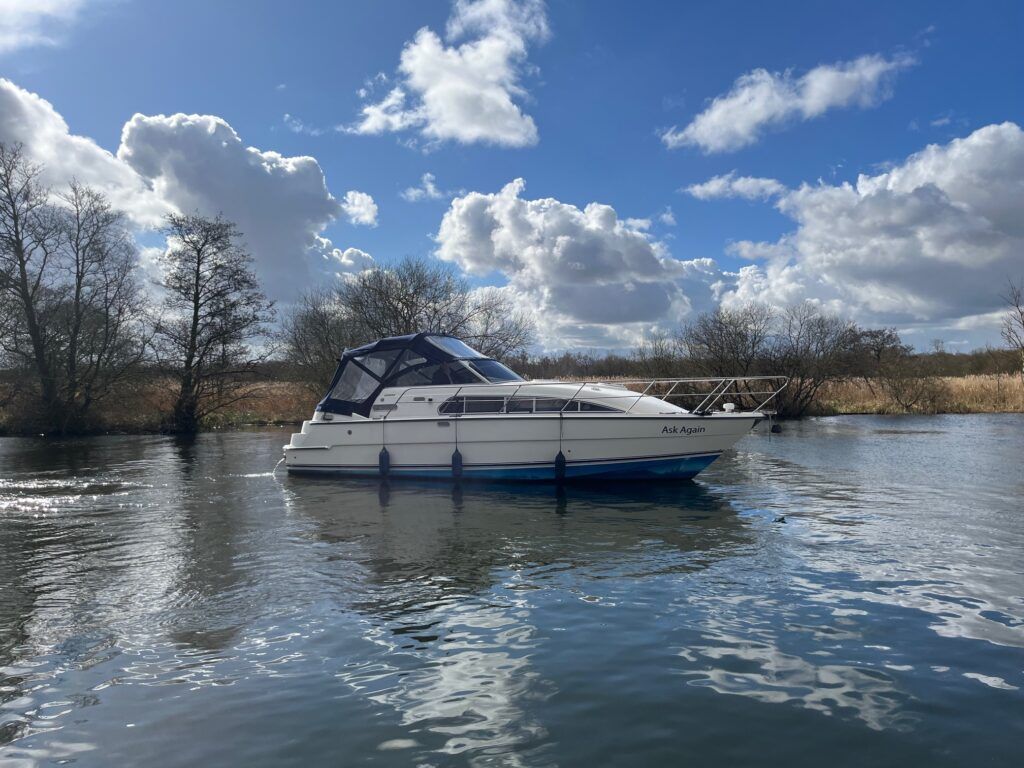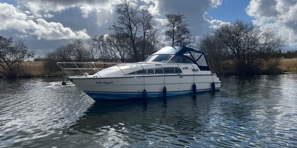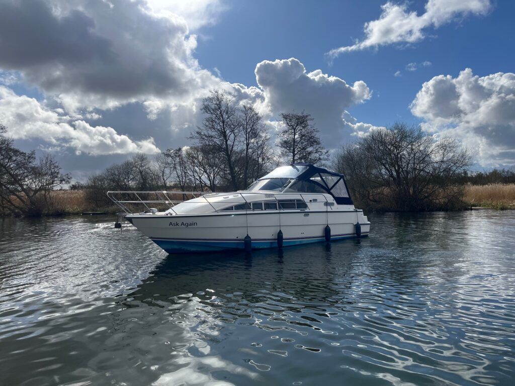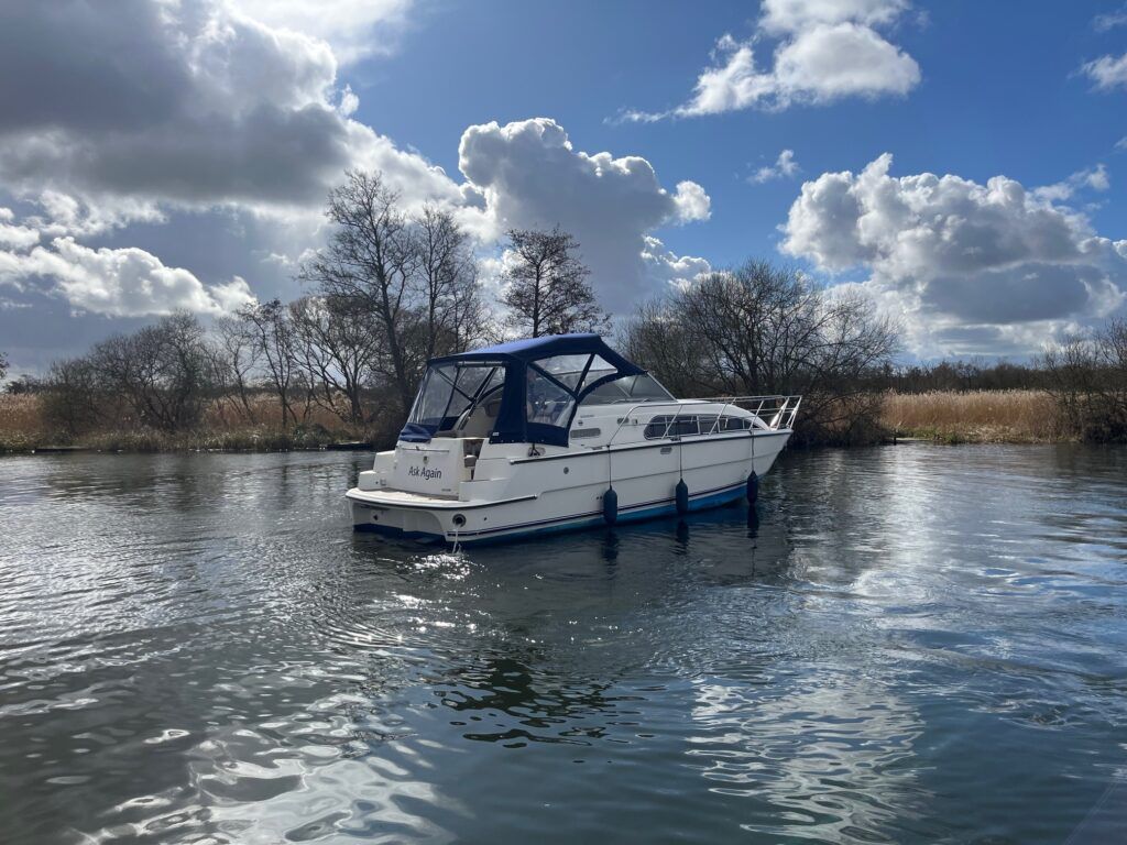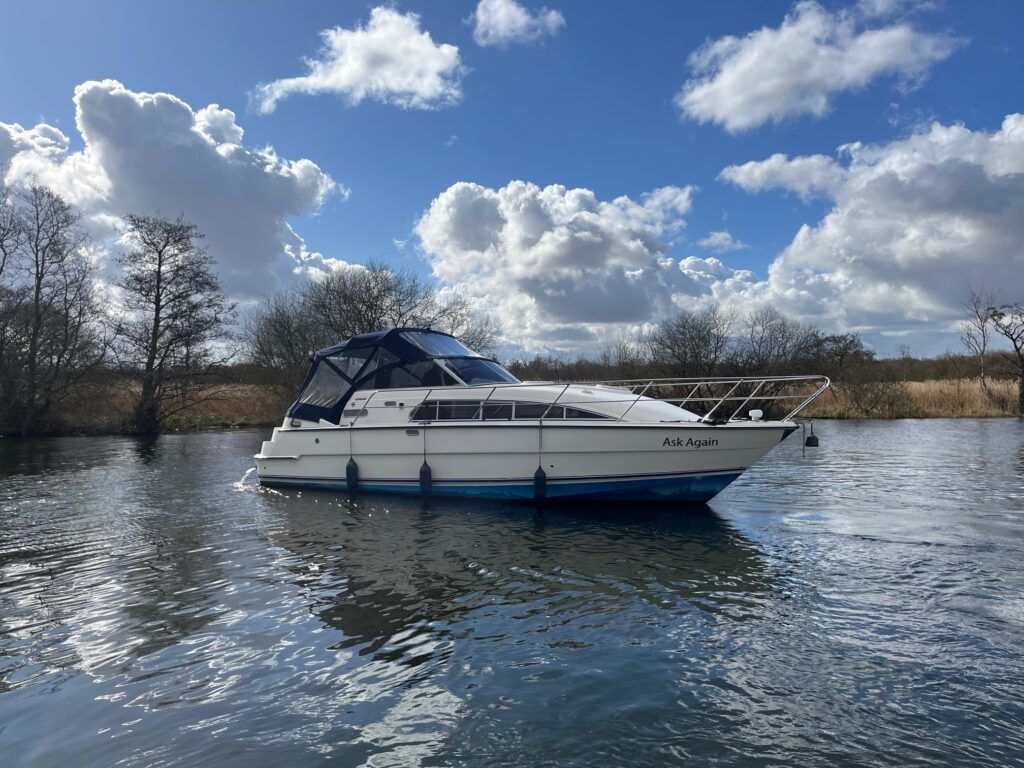 Sheerline 1020 – 2004 – Single Nanni Kubota 130hp diesel engine through a shaft. 4/6 berth accommodation with a single toilet/shower compartment. Specification to include; bow and stern thrusters, 6.5kva Fischer Panda generator, Combi microwave oven, cockpit griddle/barbecue, warm air heating etc, leather saloon upholstery, the list goes on. “Ask Again” has a huge specification and is a very nice example of these sought after craft. BSC 23/05/26