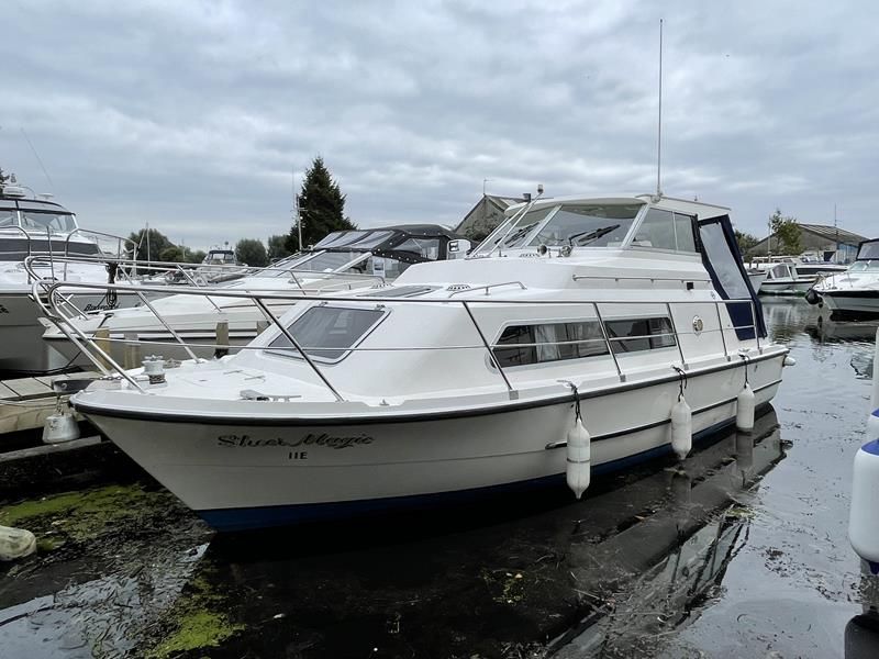 SHEERLINE 740 – 1992 – Powered by a single Volvo MD22 59hp diesel through a shaft – 4 berth accommodation with toilet and shower -Specification to include; bowthruster, electric windlass, warm air heating, holding tank, shore power supply with battery charger, calorifier, hob, oven, grill and refrigerator. NYA stock benefiting from a recent machine polish, antifoul, engine service, new canopy and 3 month major mechanical failure warranty on the engine and gearbox. A turn-key boat in very good order throughout! A well specified, well presented example of these popular river cruisers!