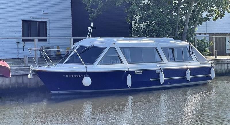 SHEERLINE 740 – 2014 – Powered by a single Nanni 29hp diesel – 4 berth accommodation with toilet and shower – Specification to include; Bow thruster, shore power, electric windlass, holding tank, shore power supply with 240v supply and immersion. New BSC. Striking blue hull and split saloon roof. Air draft under 7ft. 520hrs.  A stunning Sheerline 740, well equipped and in fantastic order throughout! Perfect for exploring the whole Broads network!