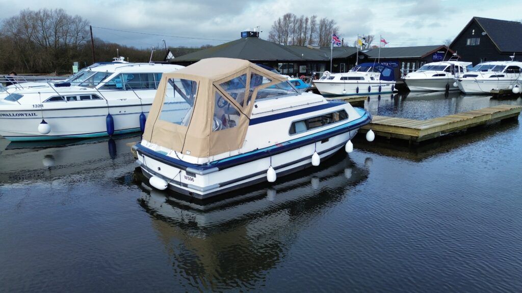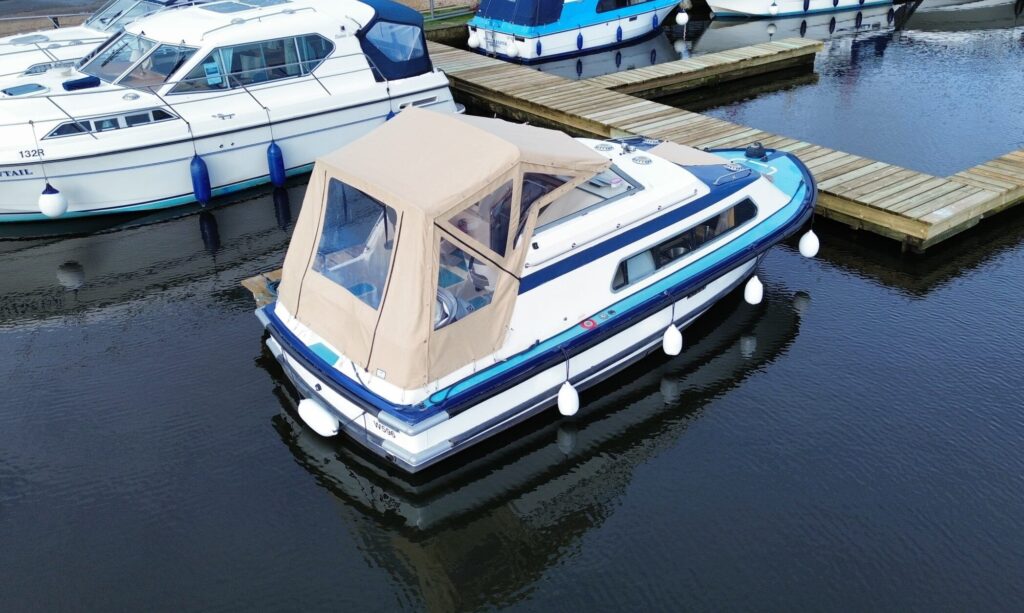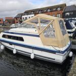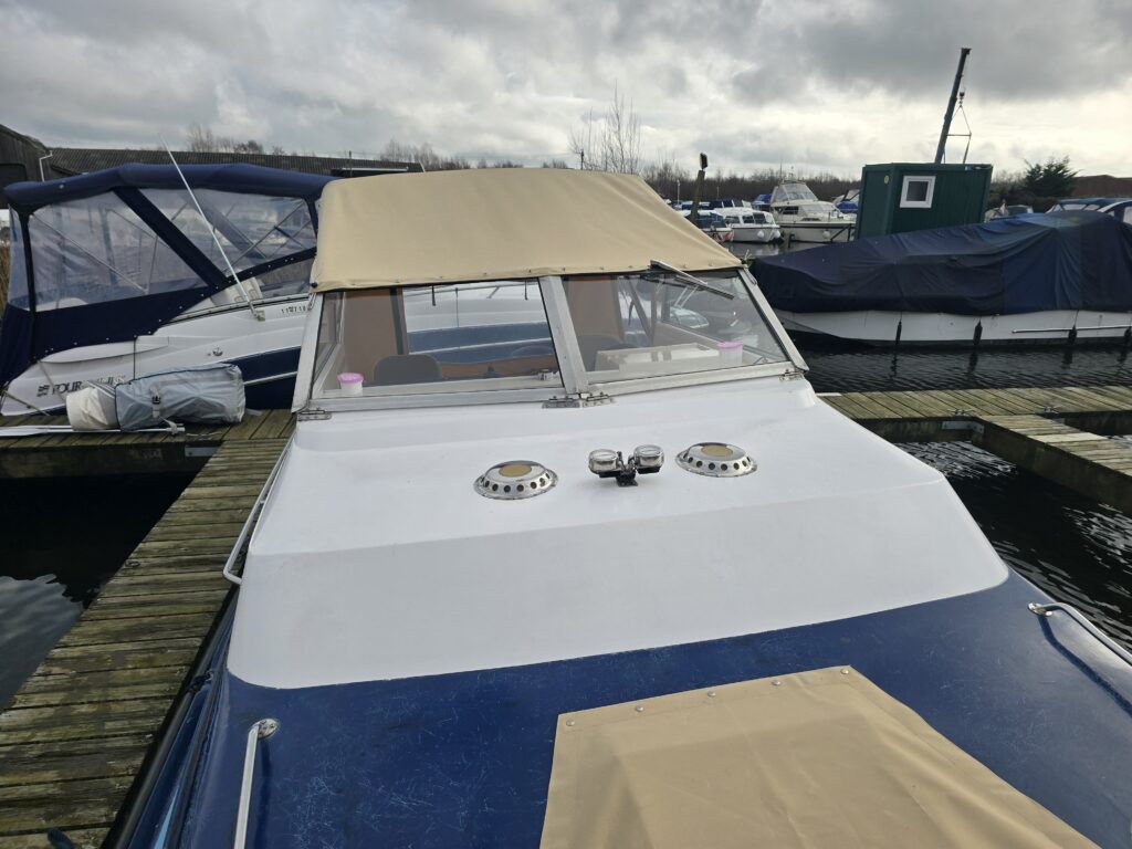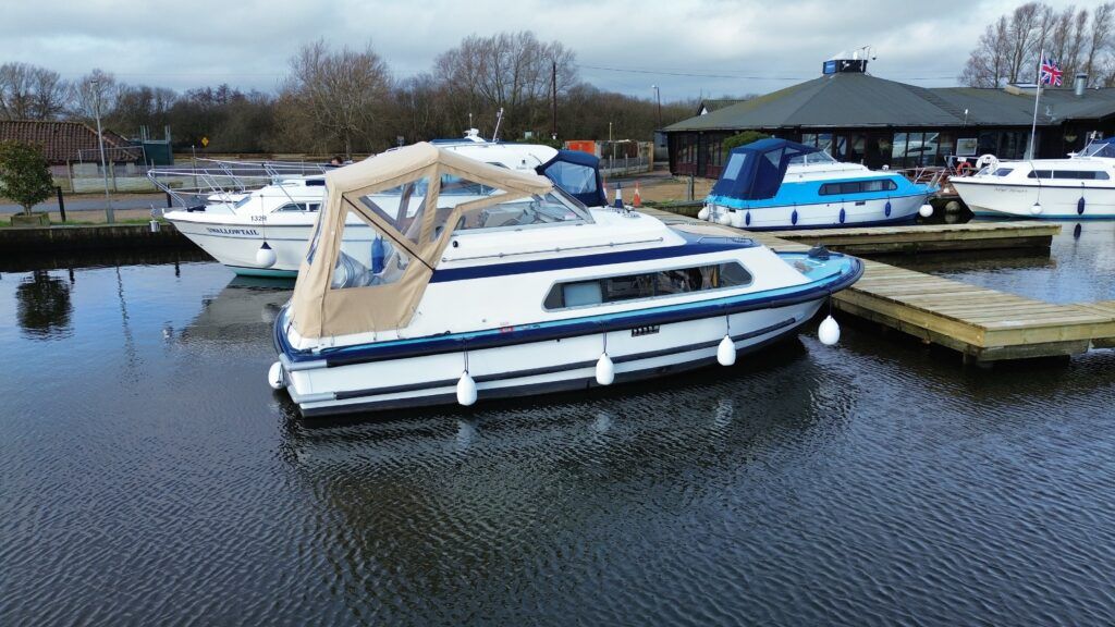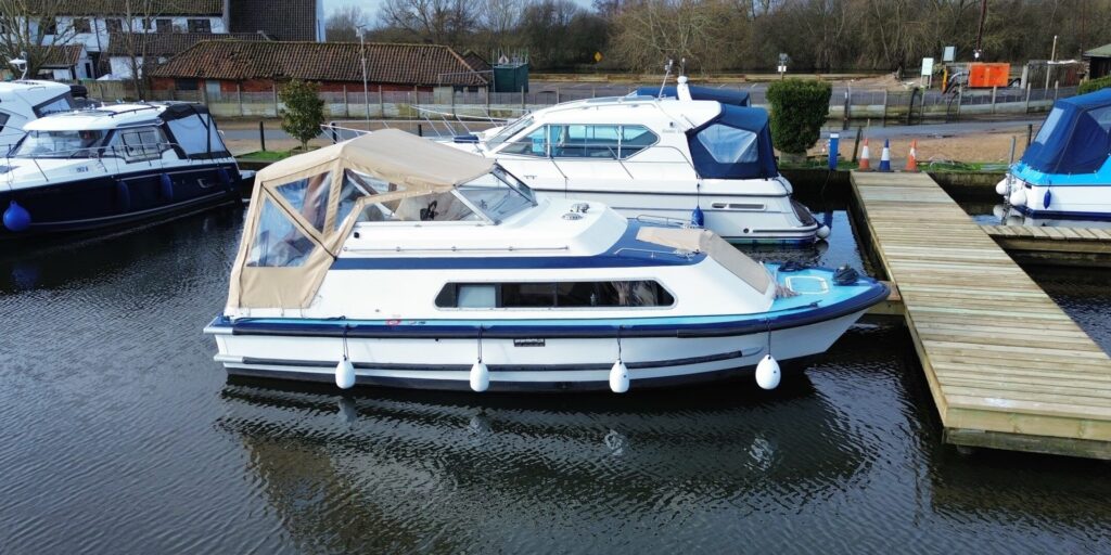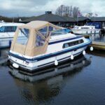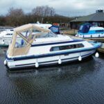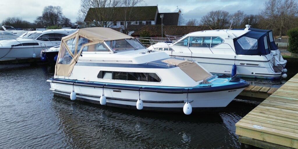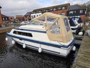 Sheerline 740 Aft cockpit – 1991 – Powered by a Nanni N4.38 through a shaft (fitted 2024). 3 berth accommodation with a separate toilet & shower compartment. Specification to include; warm air heating, folding windscreens, full canopy, holding tank, electric toilet, inflatable dinghy, 12v system with TV, fully equipped galley with 4 burner gas hob and separate cooker. Serviced 2025. Antfouled 2024. A very popular style of boat, featuring a modern Nanni diesel engine and low air draft – an ideal choice for those looking to get started on the inland waterways.