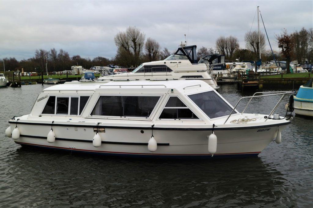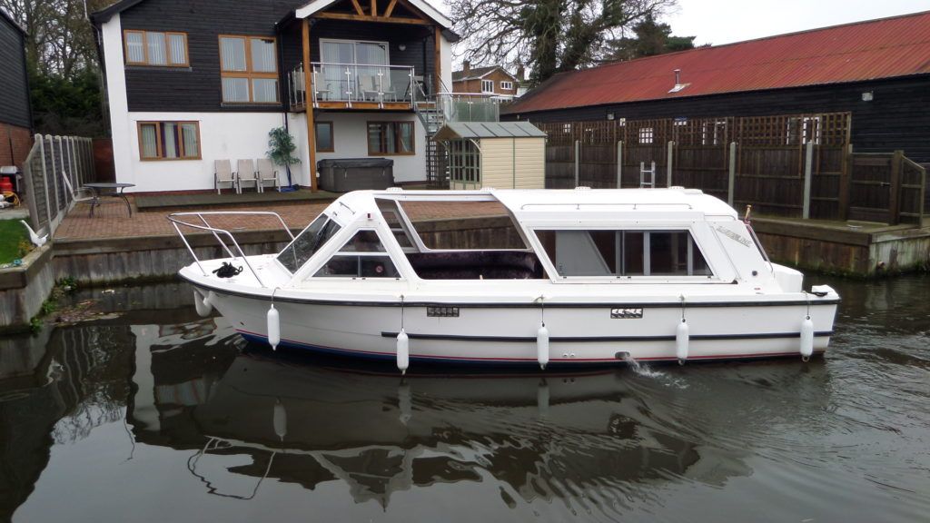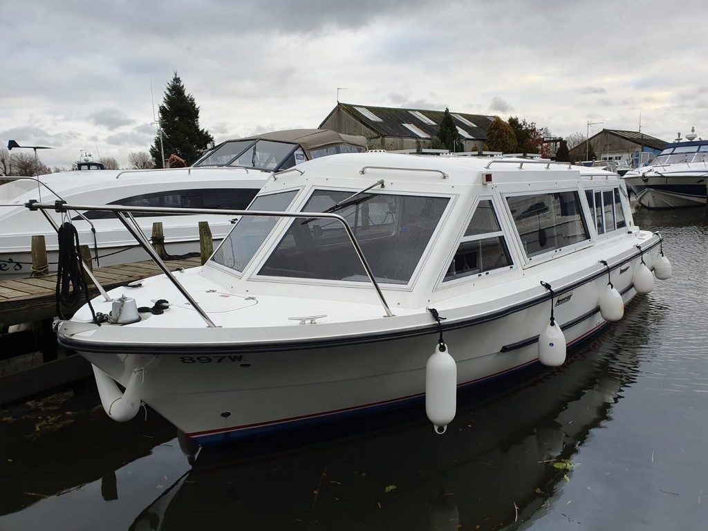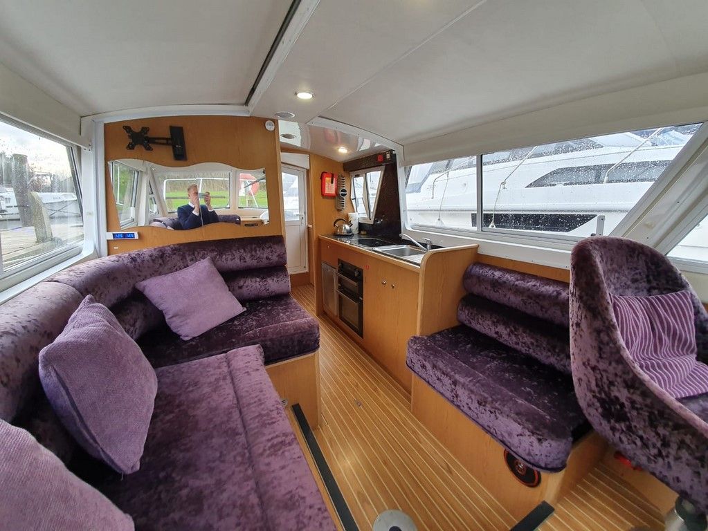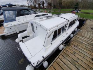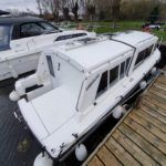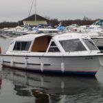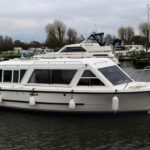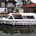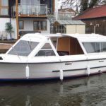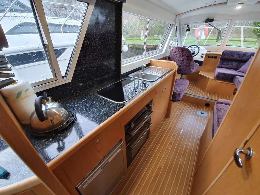 SHEERLINE 740 FINESSE – 2014 – Powered by a single Nanni N3.30 29hp diesel through a shaft. 3 berth accommodation with toilet and shower. Specification to include; Holding tank, Webasto warm air heating, shore power supply with 240v socket, solar panels, full galley facility with 2 burner hob, oven and grill. Split sliding saloon roof with teak and holly flooring throughout. Owner oil and filter change May 19 and antifouled. A very well presented, modern river cruiser with the sought after single diesel economy and shaft configuration, a very low air draft for increased inland access!