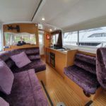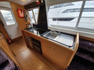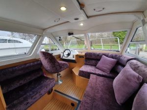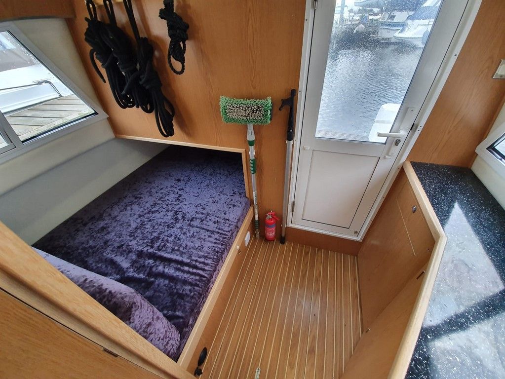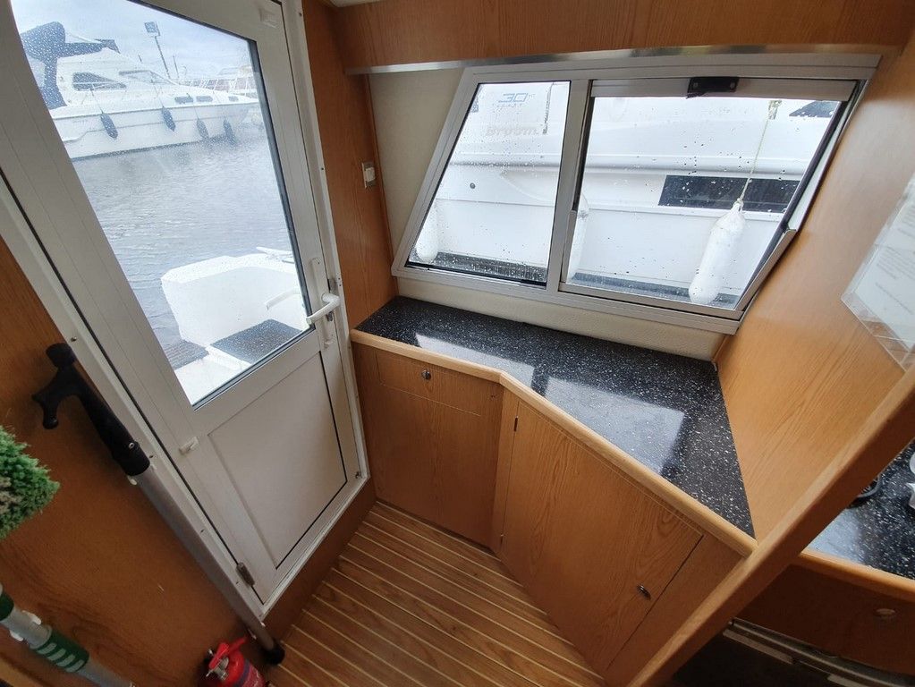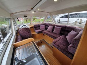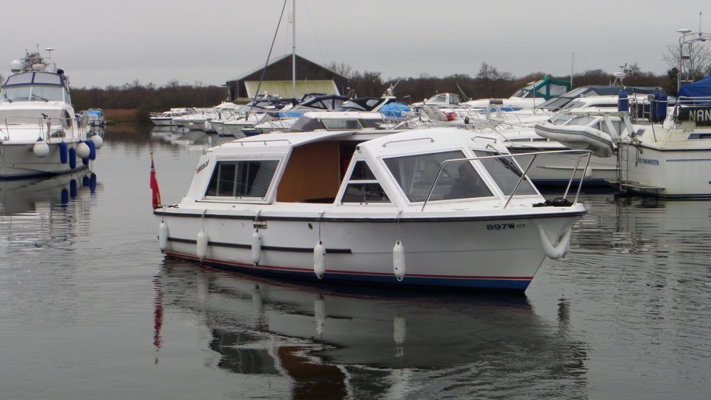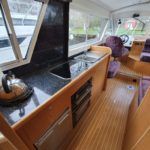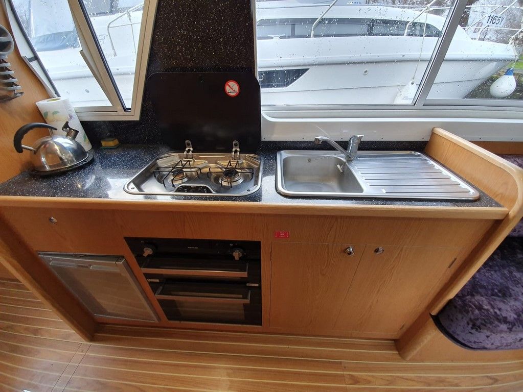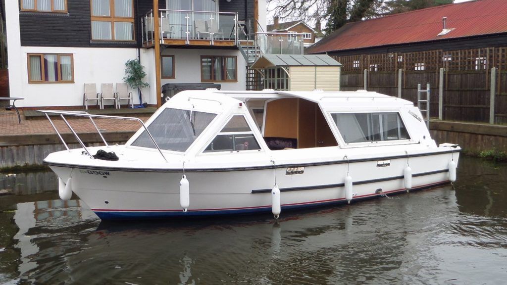 SHEERLINE 740 FINESSE – 2014 – Powered by a single Nanni N3.30 29hp diesel through a shaft. 3 berth accommodation with toilet and shower. Specification to include; Holding tank, Webasto warm air heating, shore power supply with 240v socket, solar panels, full galley facility with 2 burner hob, oven and grill. Split sliding saloon roof with teak and holly flooring throughout. Owner oil and filter change May 19 and antifouled. A very well presented, modern river cruiser with the sought after single diesel economy and shaft configuration, a very low air draft for increased inland access!