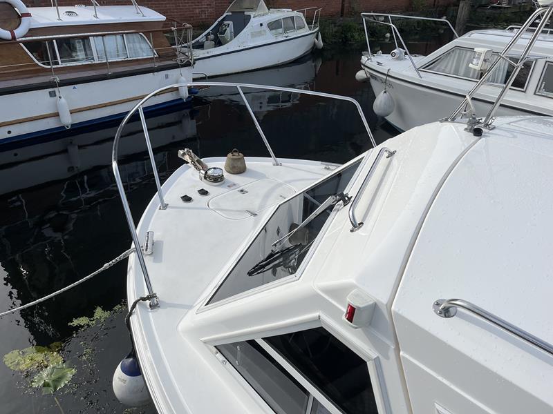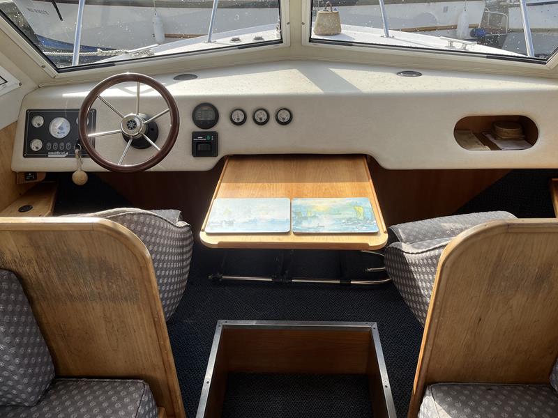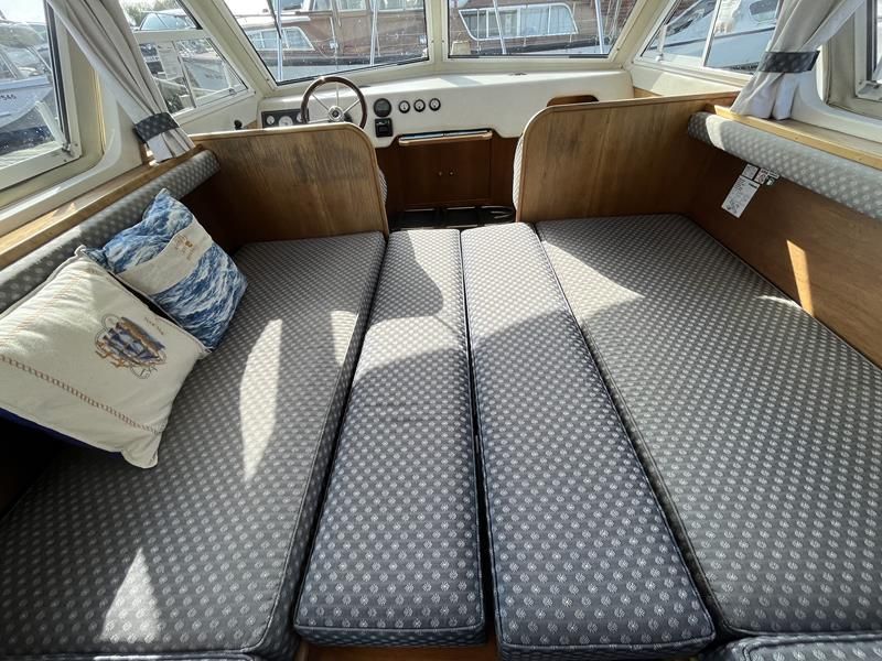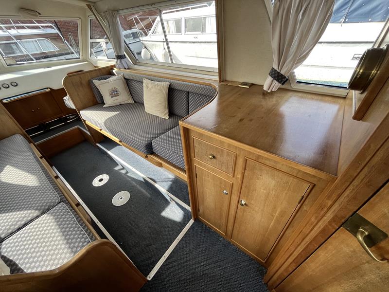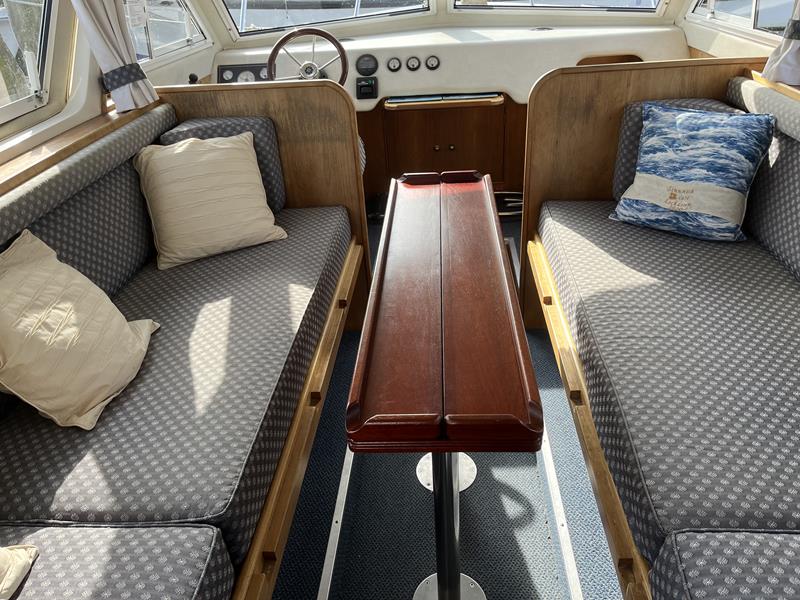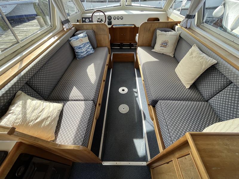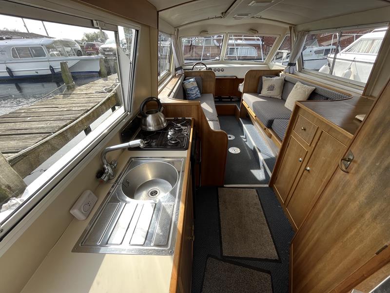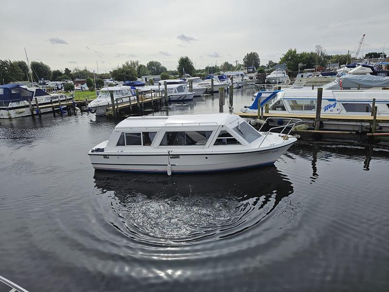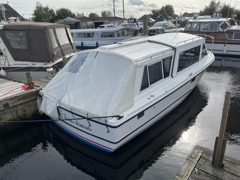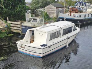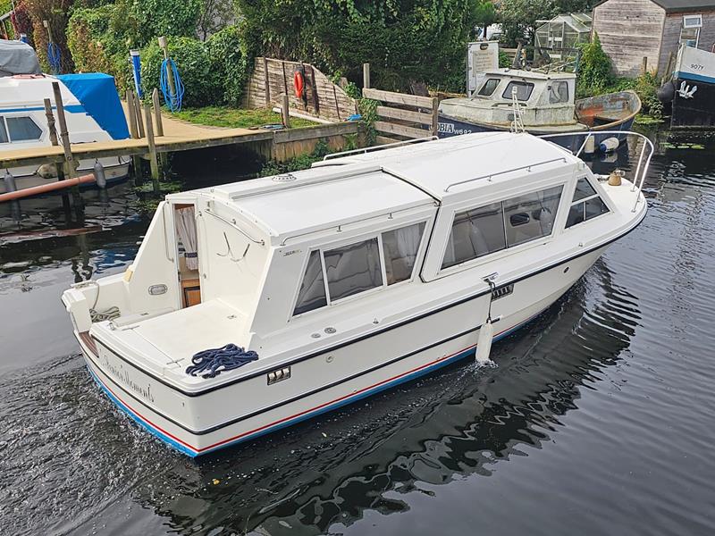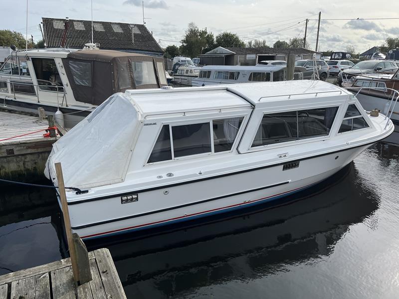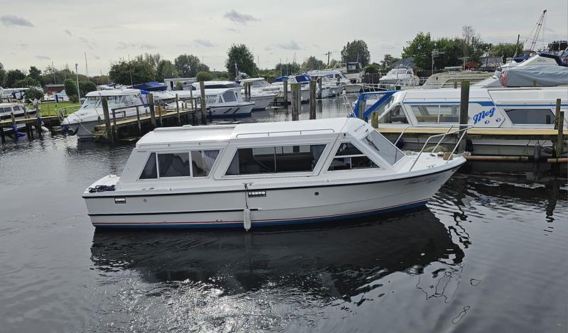 SHEERLINE 740 Flair – 2002 – Powered by a single Nanni 4.150 37hp diesel engine through a hydraulic drive. 2 berth accommodation with a toilet & shower compartment. Specification to include; holding tank, Vetus bow thruster, Webasto warm air heating, shore power, battery charger, electric anchor winch, split sliding roof, full winter cover, and fully equipped galley. BSC Expires Oct 2025. Antifouled, compounded & polished Oct 2023. A highly desirable river cruiser, tailor-made for river cruising with single-level accommodation, a low air draft for the Broadland bridges and single diesel fuel economy!