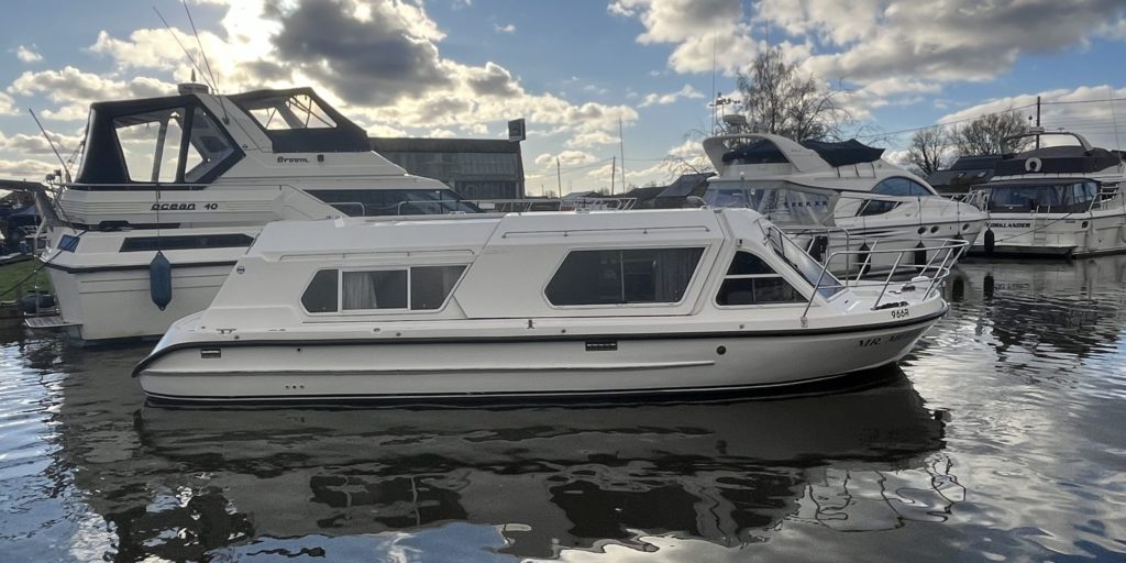 Sheerline A30 – 2008 – 1x Nanni 40hp diesel engine on hydraulic shaft. 4 berth accommodation with a toilet & shower compartment. Well specified to inc; Bow & stern thrusters, inverter/charger, warm air heating, electric windlass, air con unit, hydraulic steering, shore power, oak interior and split sliding roof. A very sought-after inland cruiser – Early viewing is recommended!