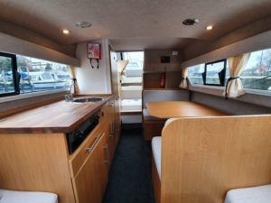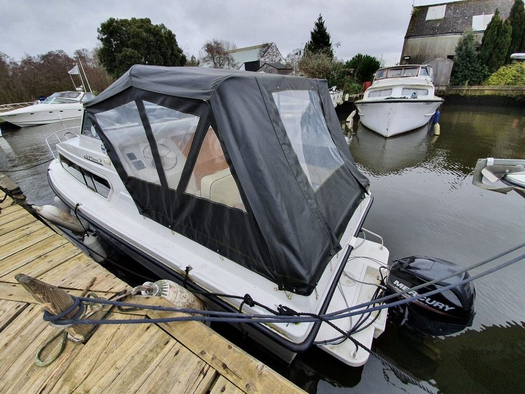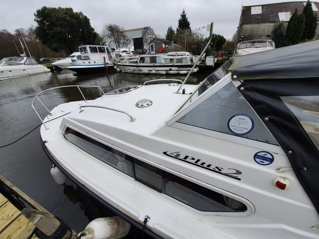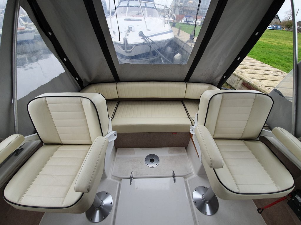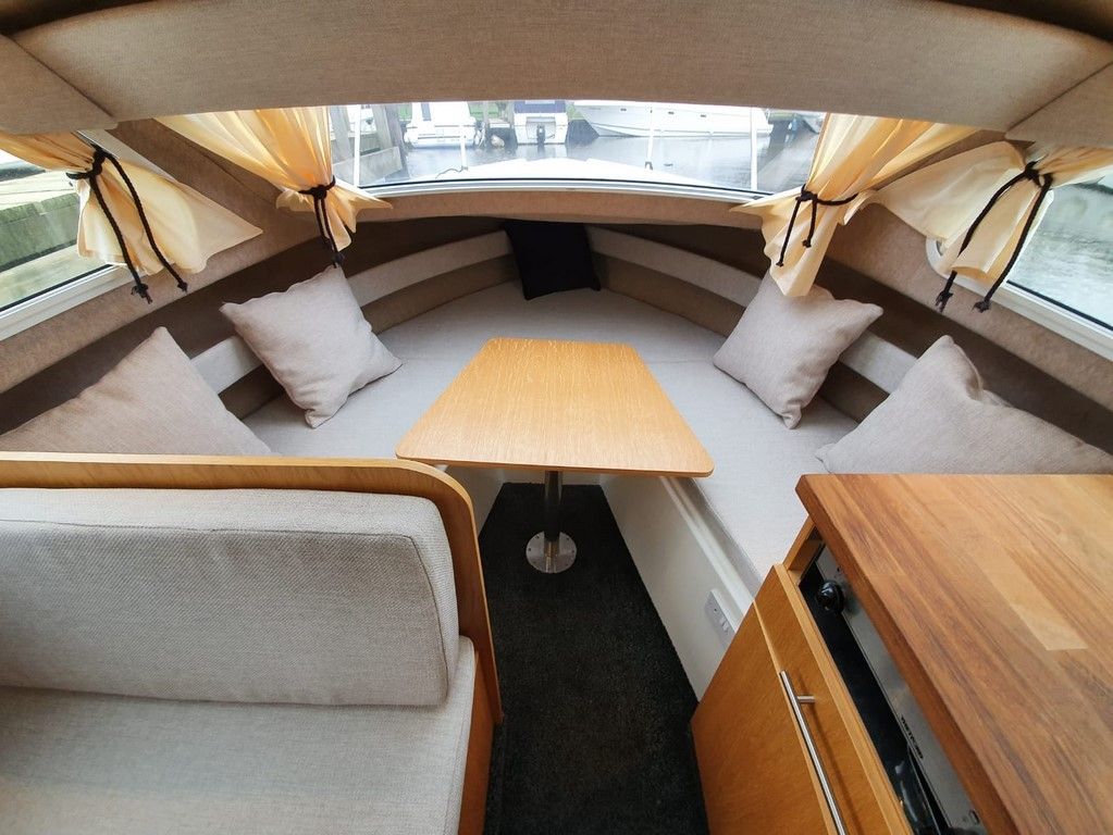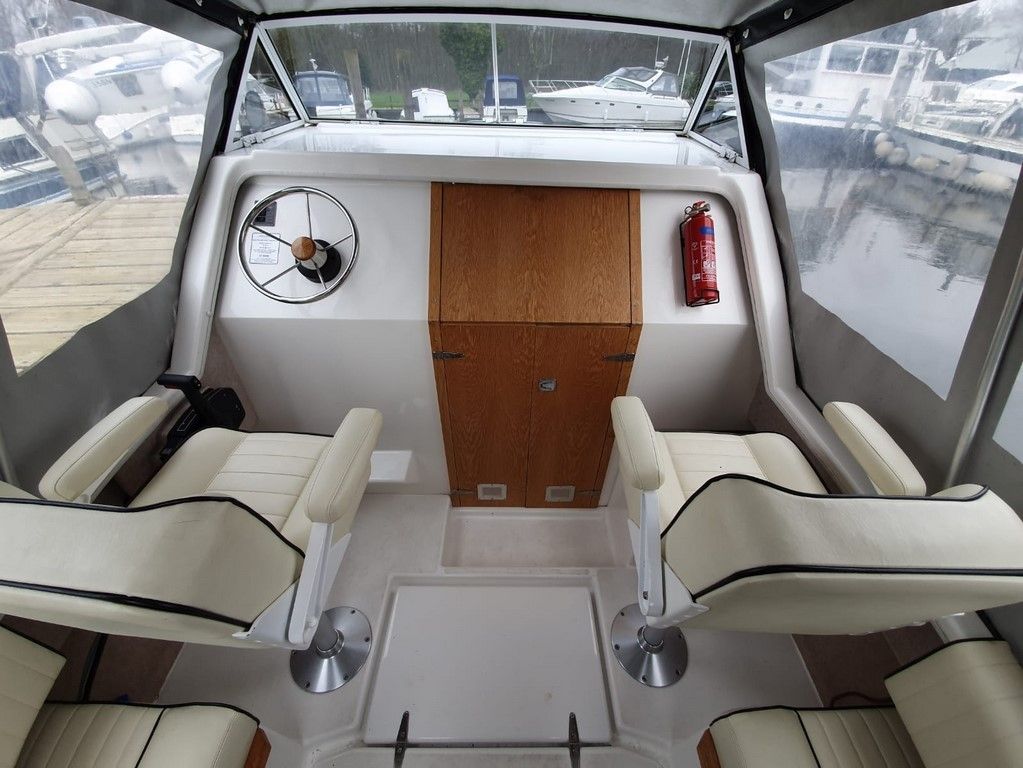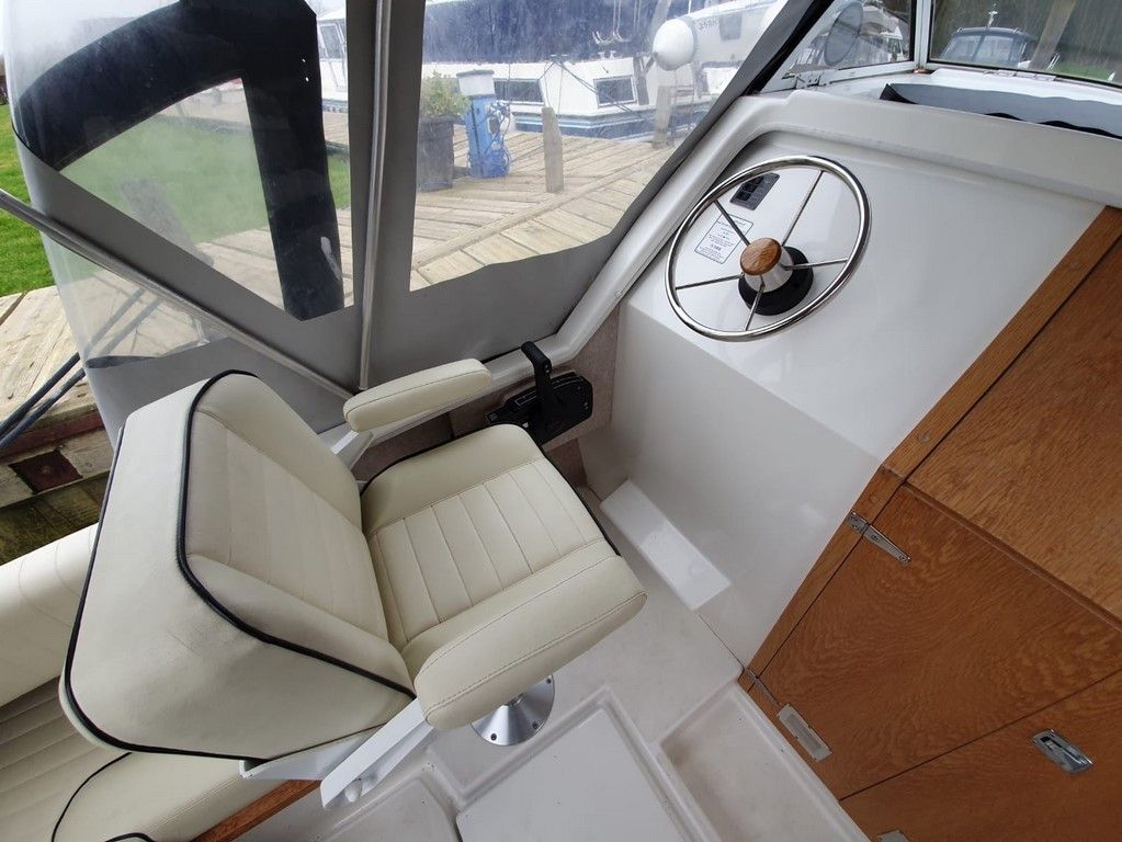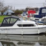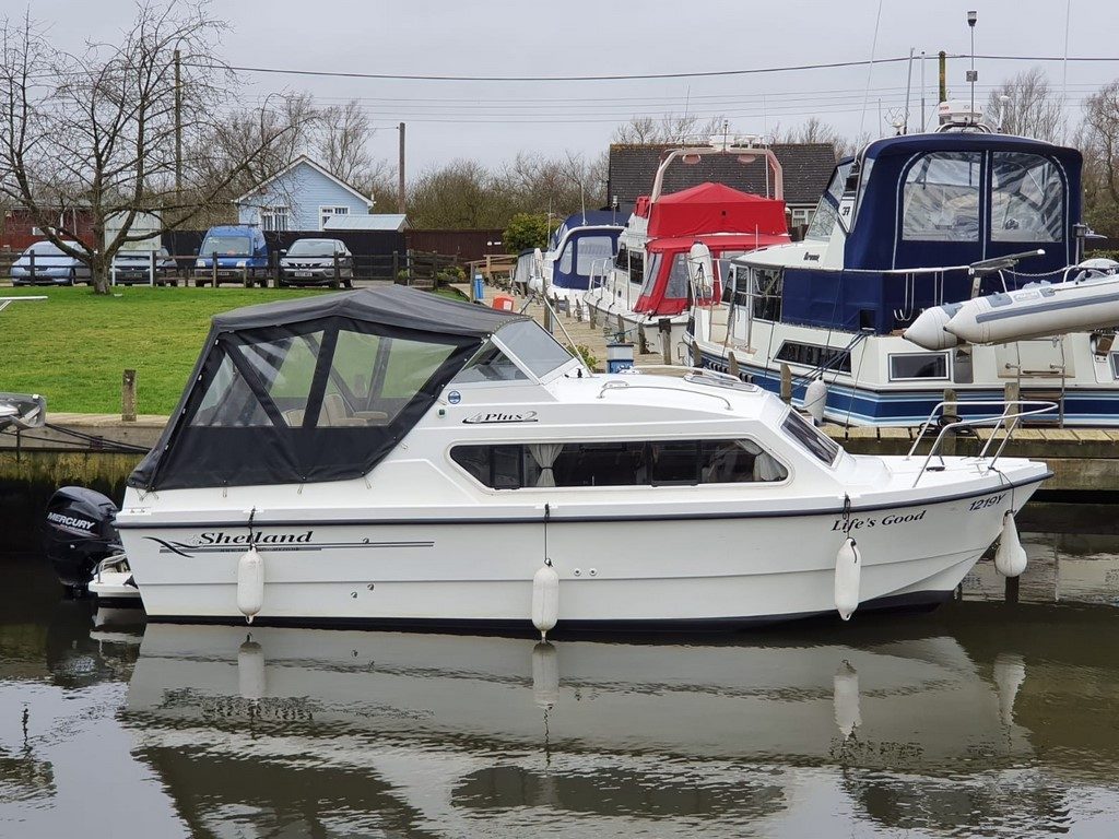 SHETLAND 4+2 – 2013 – Powered by a 30hp Mercury outboard. 4 berth accommodation (with extra 2 in the cockpit) toilet and shower. Specification to include; shore power, battery charger, 240v sockets, water heater, 2 burner hob, refrigerator, electric start and drive tilt. Folding canopy and screens. Used to cruise the broads in current ownership, a very low air draft for extended inland access, a modern cruiser presented in good order.