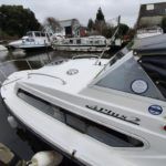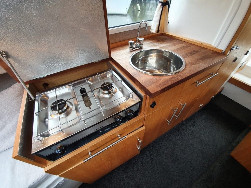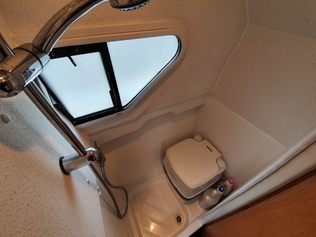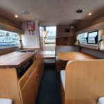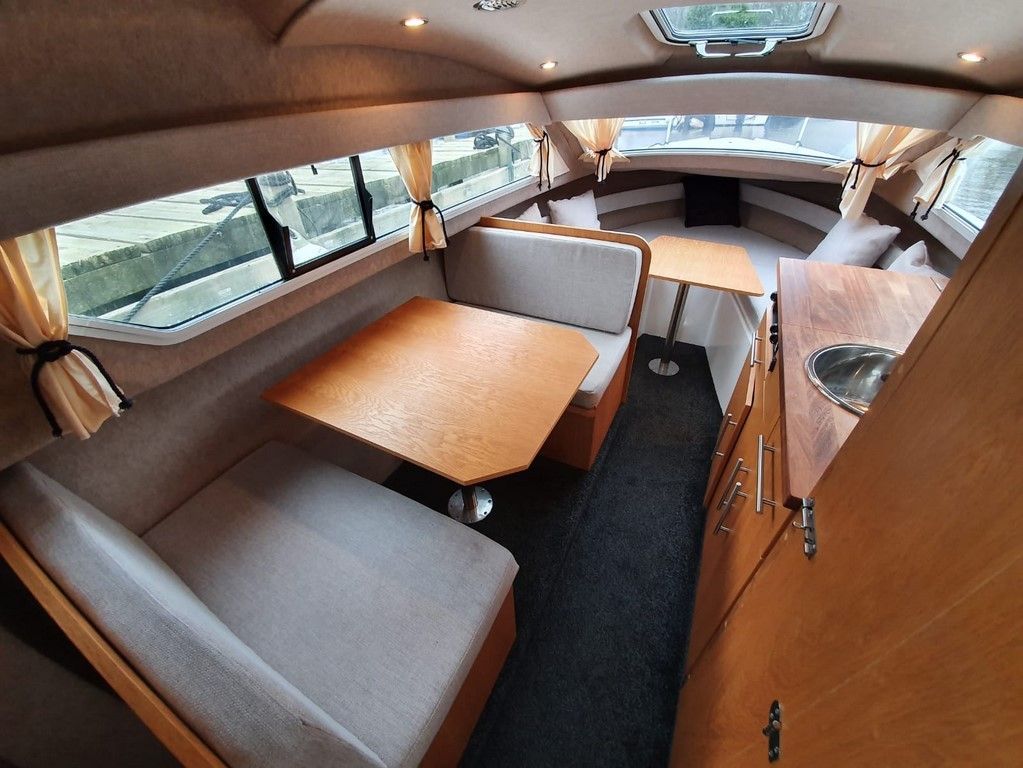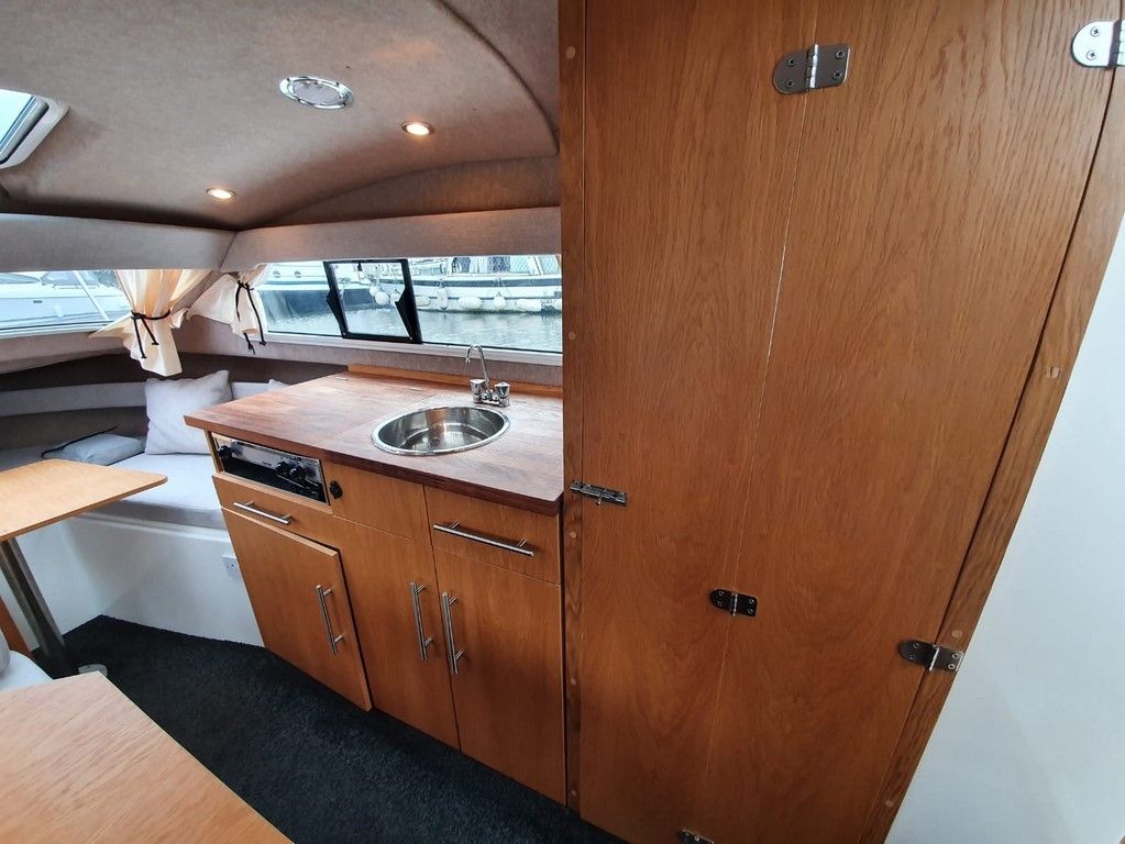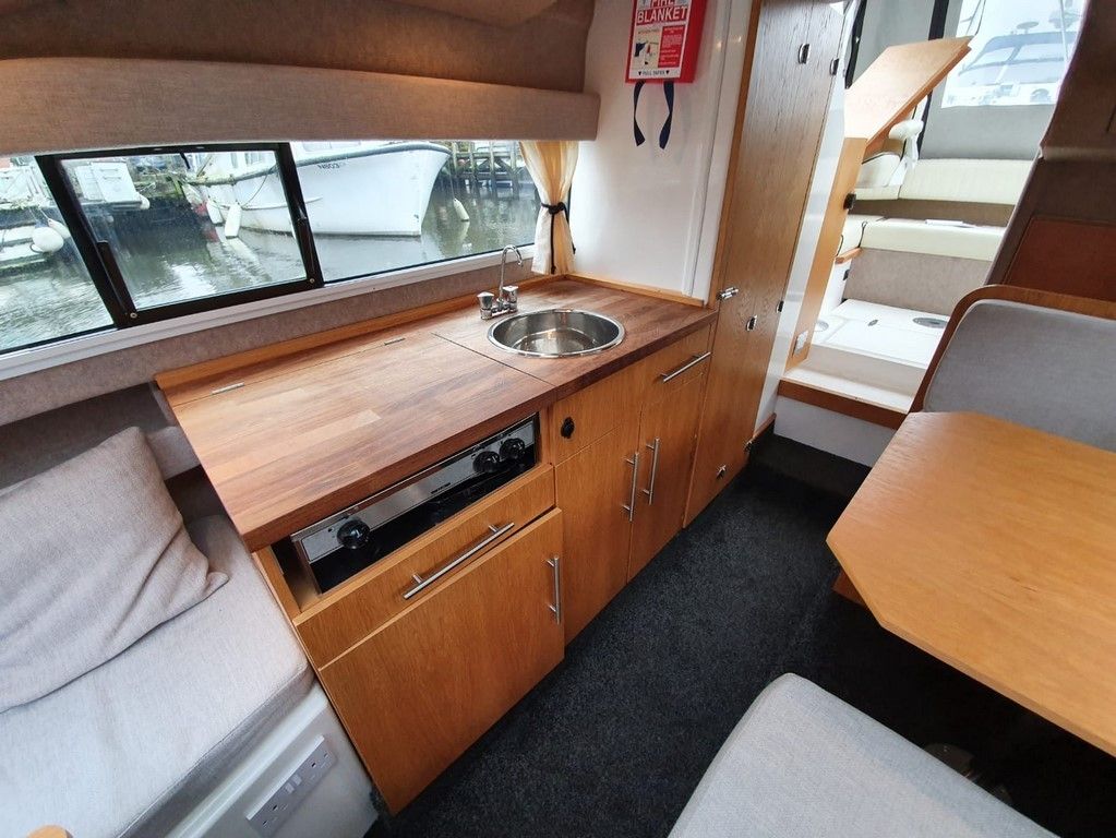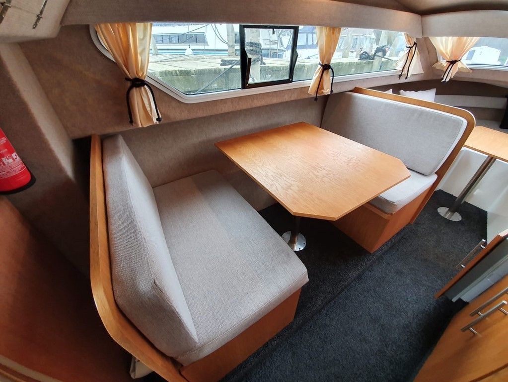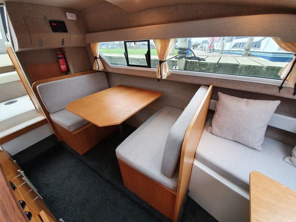 SHETLAND 4+2 – 2013 – Powered by a 30hp Mercury outboard. 4 berth accommodation (with extra 2 in the cockpit) toilet and shower. Specification to include; shore power, battery charger, 240v sockets, water heater, 2 burner hob, refrigerator, electric start and drive tilt. Folding canopy and screens. Used to cruise the broads in current ownership, a very low air draft for extended inland access, a modern cruiser presented in good order.