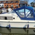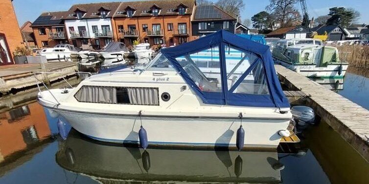 Shetland 4+2 – 1990 – Single Yamaha F25GETL 25hp four stroke outboard engine with electric start. 4/6 berths with a single toilet compartment. Specification to include; battery charger, folding windscreerns, speed and depth gauges, fish finder, spare winter canopies, crockery and cutlery. “Fester’s Girl” is a very well maintained example of these ever popular river cruisers and her overall condition belies her age extremely well. With a low air draft, this is a perfect introduction to boating on the Broads or other inland waterways. Includes 2025/26 tolls.