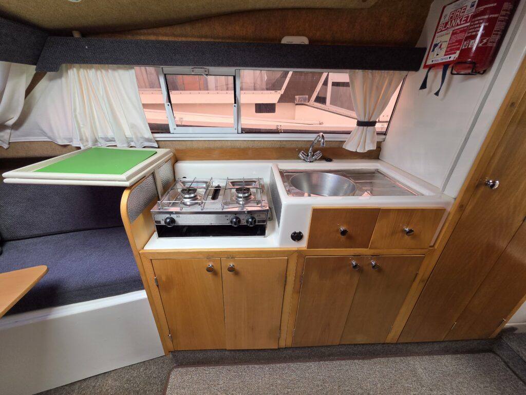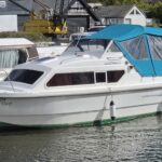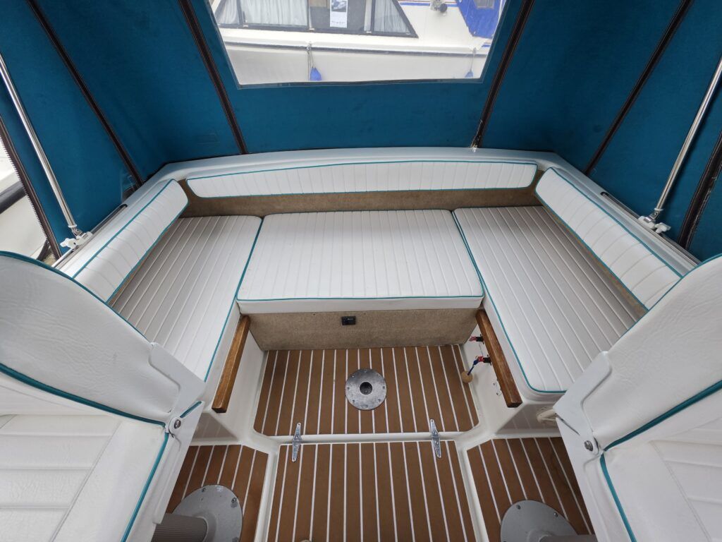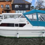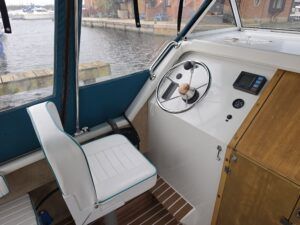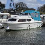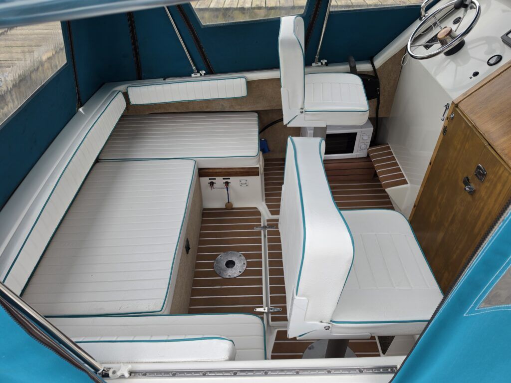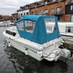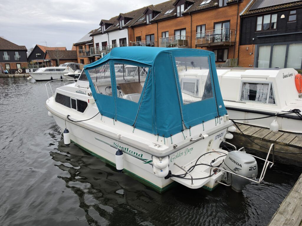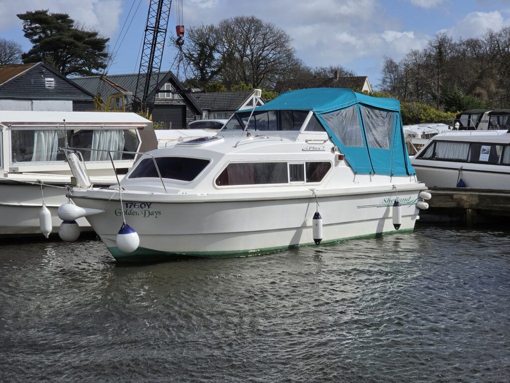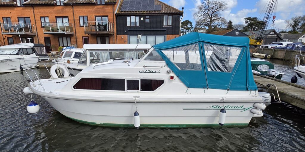 Shetland 4+2 – 2010 – Powered by a 20hp Honda outboard engine. Up to 6 berth accommodation with a separate toilet and shower compartment. Specification to include; Shore power, battery charger, water heater, depth log, 2x batteries, stereo, refrigerator, gas hob, navigation lights, microwave, 12v sockets and more. BSC Dec 2029. Engine serviced 2025. A clean, well kept cruiser offering easy and enjoyable inland boating.