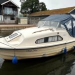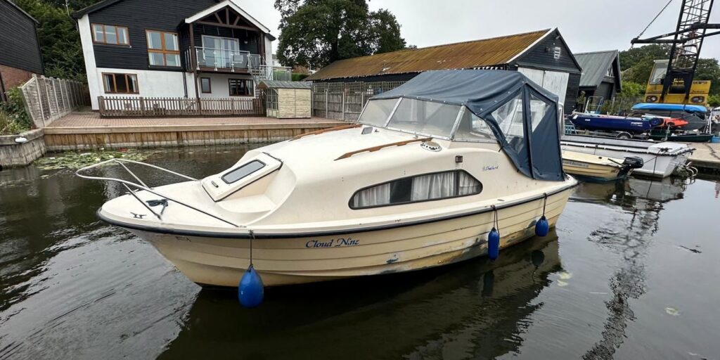 SHETLAND 610 – 1980 – Tohatsu 15hp outboard petrol engine (New 2021). 2 berth accommodation with 1 x porta loo. BSC March 2025, Low air draft and spacious cabin for her size with V berth and dinette arrangement. A great starter boat with overnight capabilities. NYA Stock as Traded in