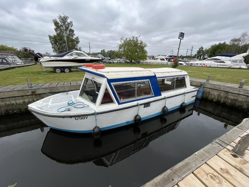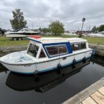 SIESTA 20 – Circa 1980 – Powered by a single Vetus 3 cylinder 11hp diesel engine through shaft. Specification to include; 2 burner gas hob, sink with hot water supply through a calorifier, 12v electric LED lights, full sliding roof, Jabsco toilet to holding tank, horn. Repainted and antifouled 2020. Re-conditioned gearbox 2020. BSS Exp April 2026. A low air draft river cruiser, ideal for those wishing to access and explore all of the river network through the lower bridges.