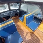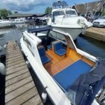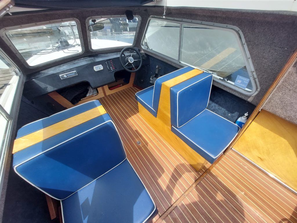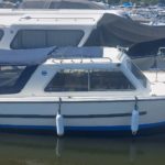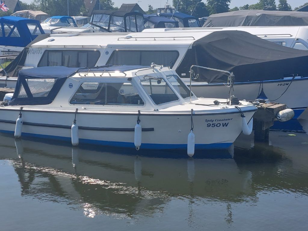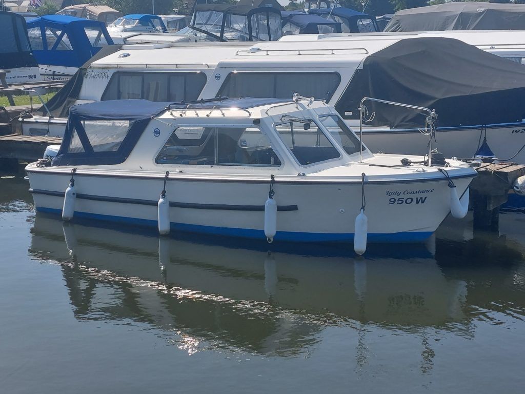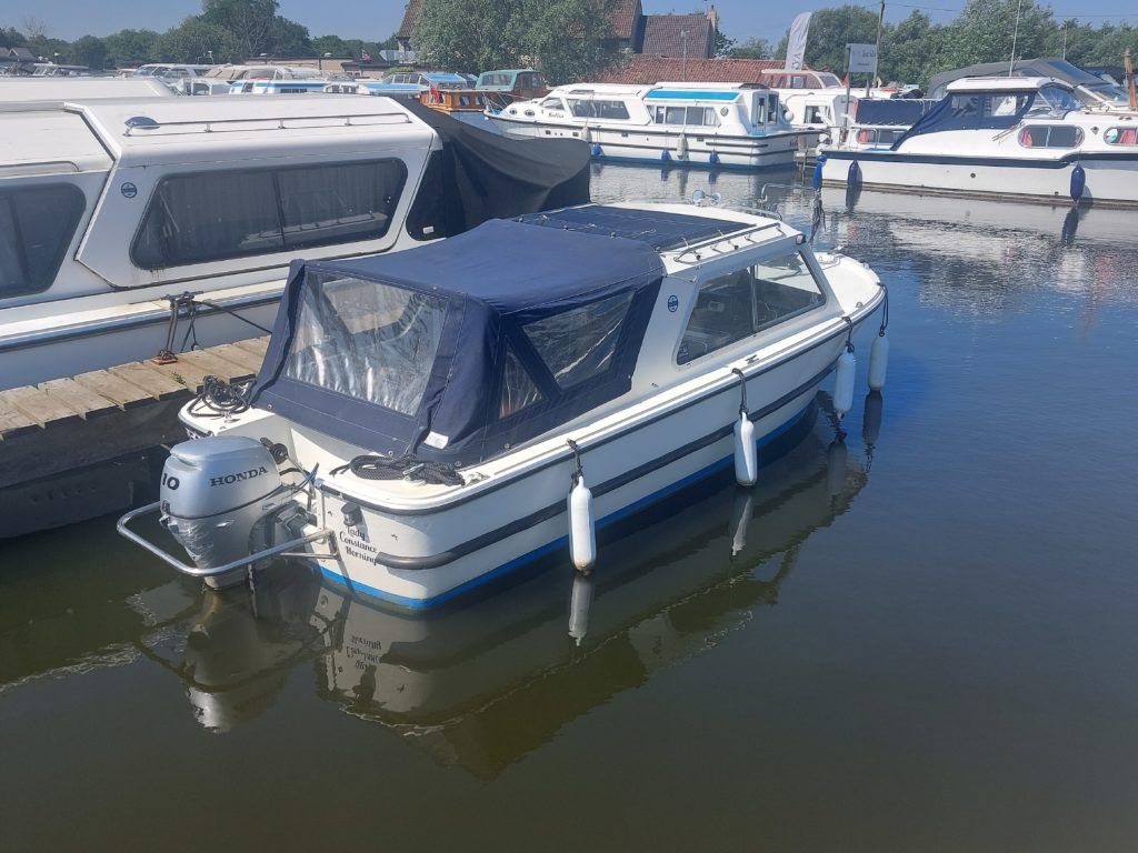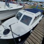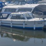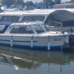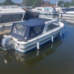 Sovereign 17 – Circa 1985 – Single Honda 10hp Electric start outboard engine. Generous cushioned seating for 6 people. Full canopy and slatted folding roof. Teak and holly flooring and removable table on pole. Shore power, battery monitor, navigation lights, BSC 16/05/2025. A well kept and well maintained day cruiser, perfect for exploring the inland waterways
