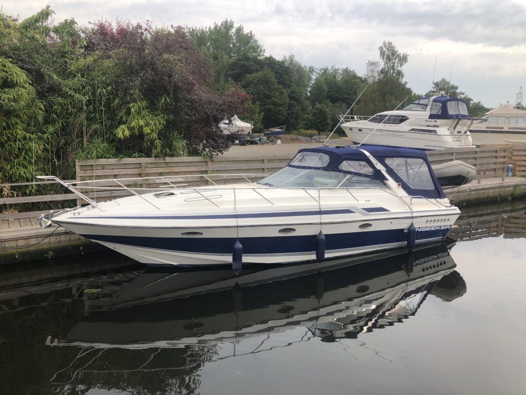 Sunseeker Martinque 36 – 1991 – Powered by twin Mercruiser D4.2L 300hp diesel engines though Bravo II outdrives. 4 berth accommodation over two cabins with 1 x toilet/shower compartment. Galley with 2 ring hob, fridge, microwave and sink. Specification including bow thruster, electric windlass, warm air heating, shore power, battery charger, immersion heater, Synthetic teak cockpit and bathing platform, a host of navigation equipment, new cockpit canopy on order. A striking sports cruiser with a generous cockpit for entertaining and comfortable accommodation.