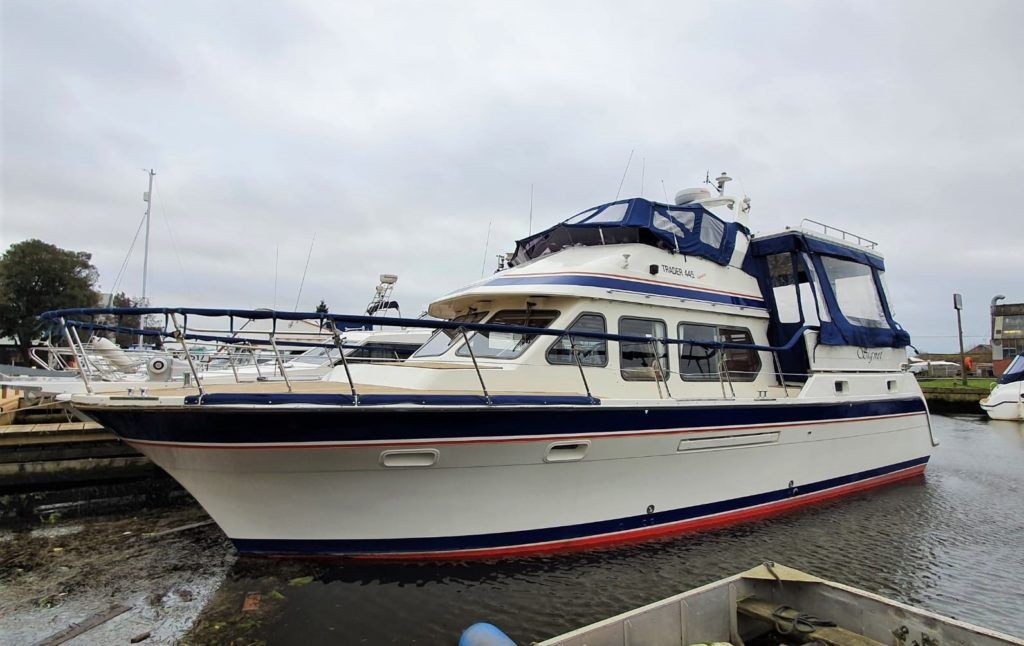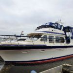 TRADER 445 SIGNATURE – 1998 – twin Volvo TAMD63P 370hp diesels through shafts – 6 berth accommodation across 3 cabins with 2 toilets and 2 showers. Specification to include; Bowthruster, trim tabs, holding tank, 6kw HFL generator, Eberspacher Airtronic warm air heating, eletric windlass with helm and deck controls, shore power with battery charger. Full teak laid decks and complete set of canopies to flybridge and aft deck! NYA Stock fully prepared by our Service Centre to include; Full engine service, Antifoul and machine compound and polish to hull and superstructure! The Trader 445 is built to a beautifully high standard, this motor cruiser oozes class and quality. This particular 445 is a fantastic example presented in great order throughout and benefits from having the larger more desireable engine option. Viewing highly recommended!