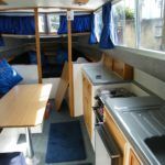 TRIDENT 244 – Built in 1992, powered by a single Honda 45Hp four stroke petrol outboard engine, 3 berths in 1 open plan cabin, 1 x toilet & shower, gas hot water heating system, holding tank, Boat Safety Certificate, shore power, 2 x batteries, folding windscreens, new upholstery, new lighting. In brilliant condition for a boat of this age. An ideal starter boat for a family.