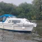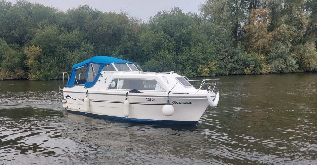 Viking 20 – 2008 – Powered by a Honda 15hp 4 stroke outboard petrol engine. 4 berth accommodation with a single toilet and shower compartment. Specification to include; purpose built bathing/board platform, navigators seat, navigation lights, warm air heating, full galley, GPS speedometer, new canopy in 2021. “Gemima” benefits from having easy access to the boat from the transom and a purpose built navigators seat. A great starter boat, ideally suited to explore the Norfolk Broads BSC 05/08/24