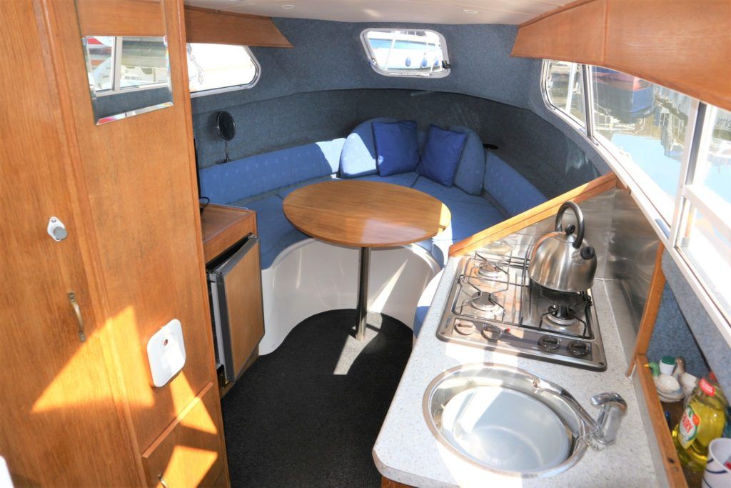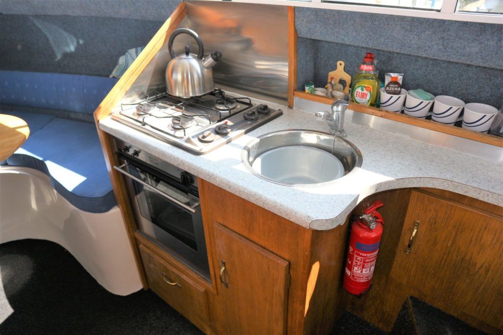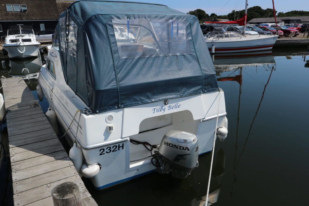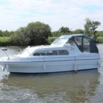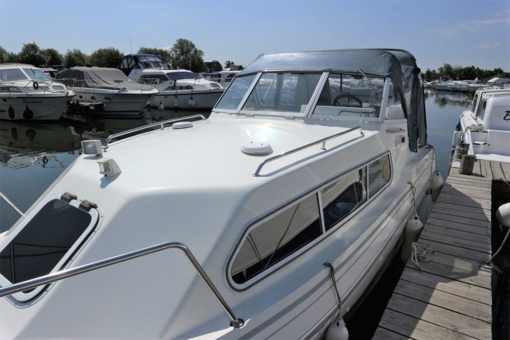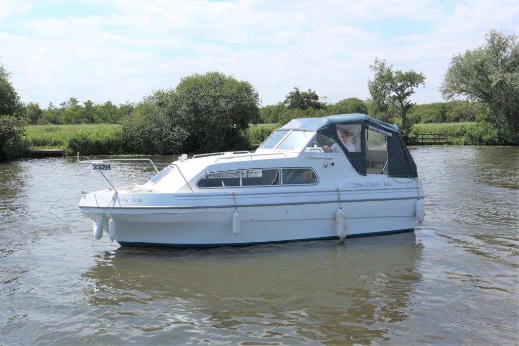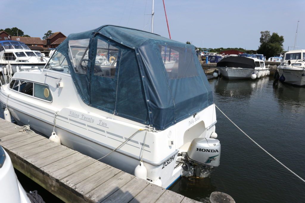 VIKING 22 WIDE BEAM – 2004 – Honda 30hp Outboard Petrol engine. 4 berth accommodation with 1 x cassette toilet/ shower compartment. Galley with four burner hob, oven & electric fridge. Spec including water heater, shore power, speed and depth log, solar panel charger, electric cabin heater, folding canopy and screens. BSC 07/19. A good example of this modern Viking model with the benefit of a lower air draft for cruising further afield.