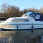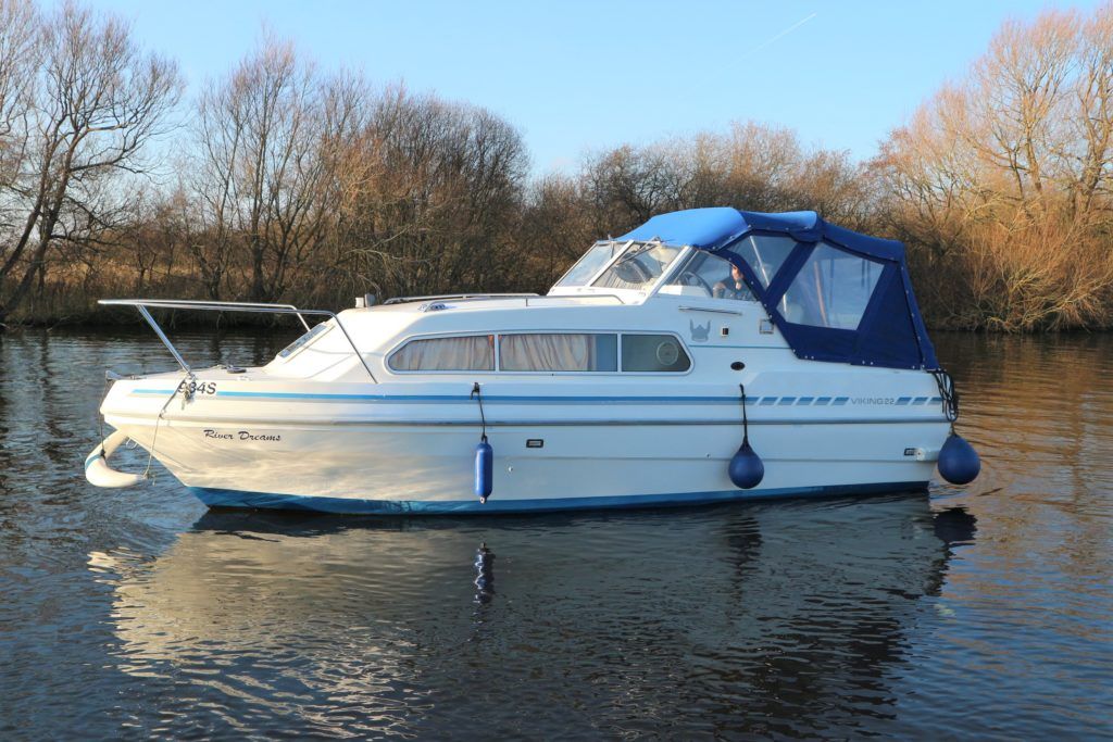 VIKING 22 WIDE BEAM – 2000 – Powered by a Honda BF20 20hp outboard petrol engine (new 2012). 4 berth accommodation with 1 x porta loo/shower compartment. Galley with full size cooker, new fridge, sink with hot & cold water. Spec including shore power, battery charger, inverter, hot water heater, folding screens & canopy, BSC 11/22. A popular model with comfortable accommodation for her size and good inland waterway access with a low air draft.