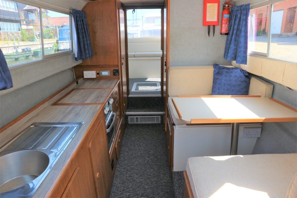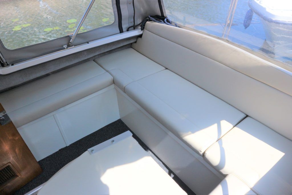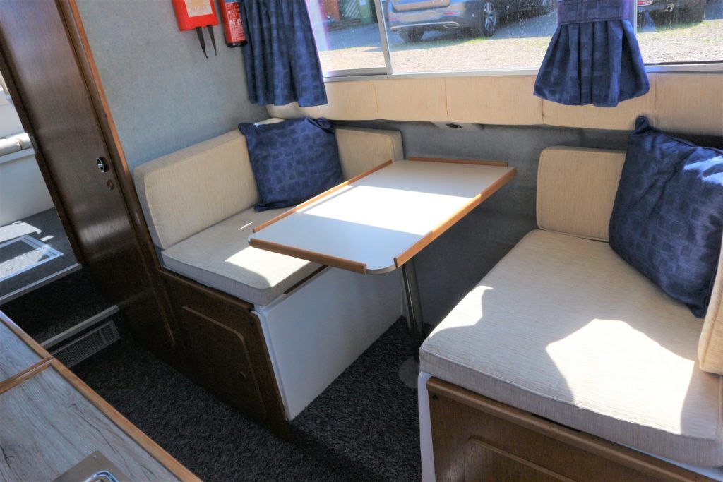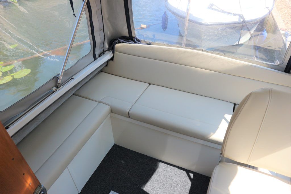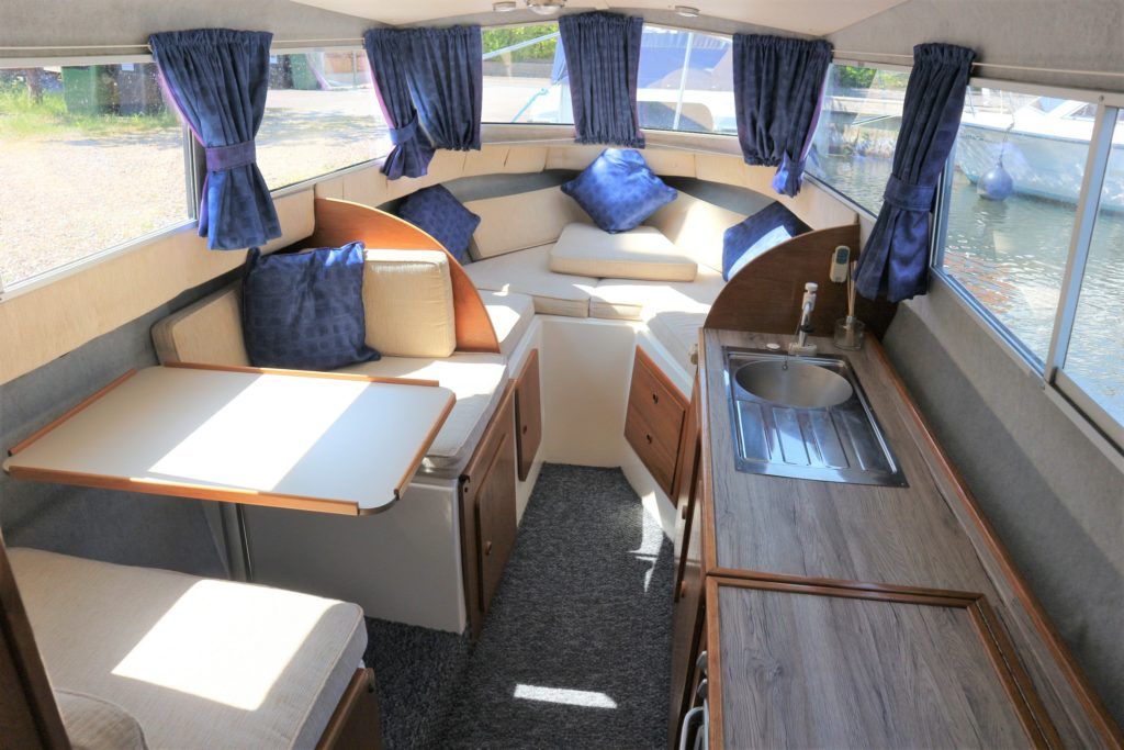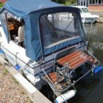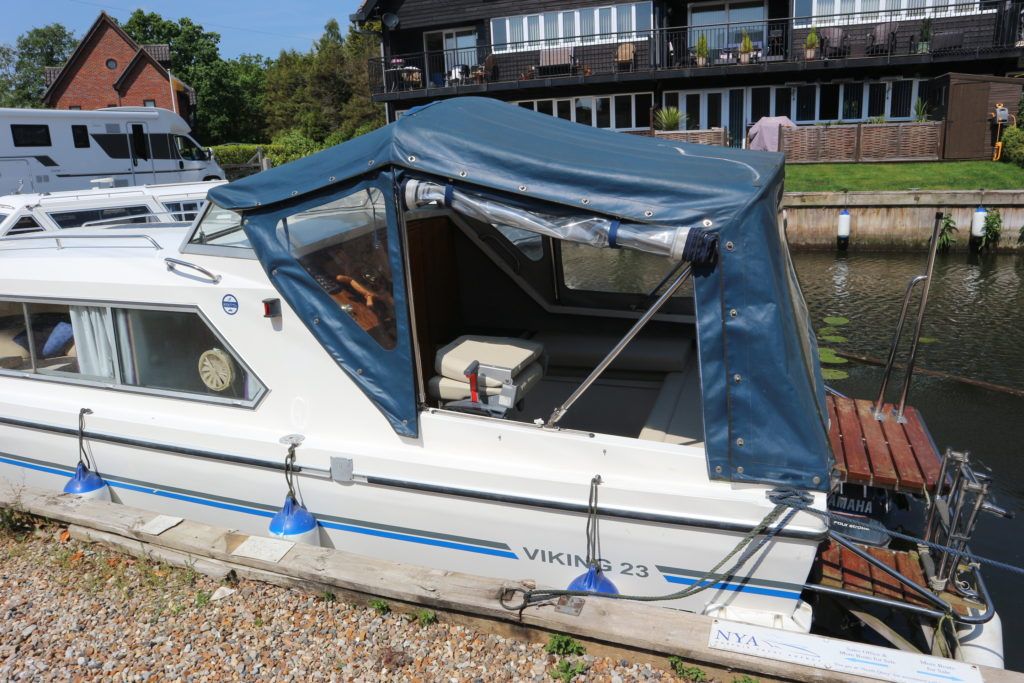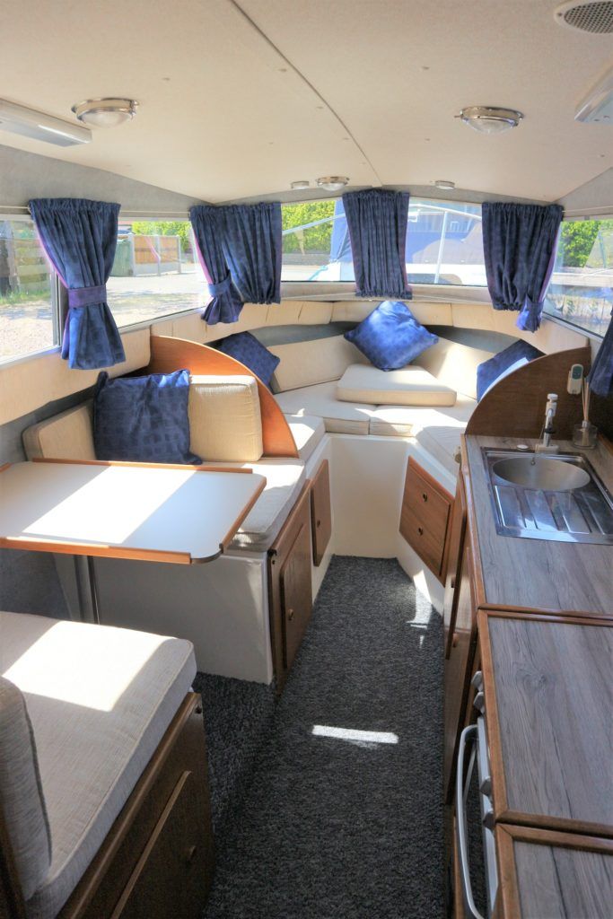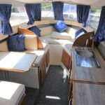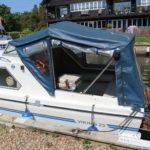 VIKING 23 – 1991 – 15HP Yamaha outboard (new 2009). 4 berth accommodation with toilet to holding tank. Galley with sink, two burner hob, oven and grill, warm air heating system, shore power, folding and removable windscreens, solar panel charger, full canopy, new water tank 2018, new cockpit upholstery & galley surfaces in 2020. A well presented family cruiser with a low air draft and spacious accommodation for her size. NYA stock with 3 month engine & gearbox warranty.