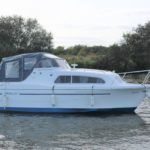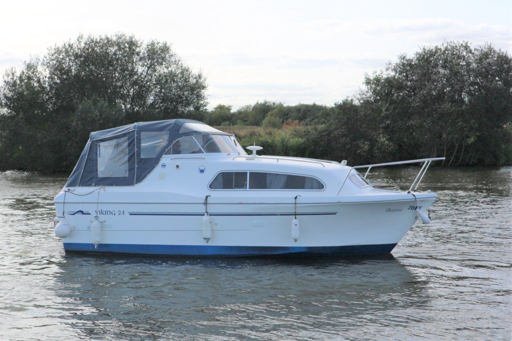 VIKING 24 WIDEBEAM – 2014 – Honda 20HP outboard petrol engine. 4 berth accommodation with 1 x cassette toilet/shower compartment. Galley with 3 burner gas hob, oven with grill, sink & fridge. BSC 07/22. Spec including shore power, immersion heater, teak cockpit flooring, fully folding canopy and removable screens allowing for greater inland access and passage beneath lower bridges.