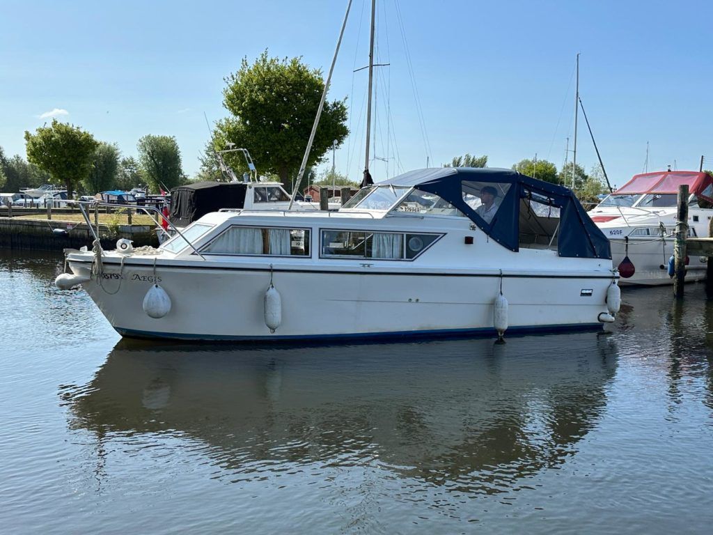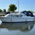 VIKING 26 WIDEBEAM – 1996 – Fitted with a single Ford 1.8L diesel engine & Sonic outdrive. 6 berth accommodation with 3 doubles and a toilet/shower compartment. Specification to include; Shore power, Propex heating, Paloma water heater, folding screens, navigation lights, Lofrans anchor winch. Canopy and screen covers fitted in 2021. BSC Expires Aug 2027. A unique example of the sought-after Viking 26 wide beam fitted with a diesel engine – a perfect choice for exploring the inland waterways!
