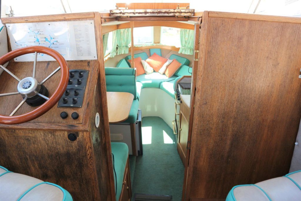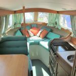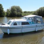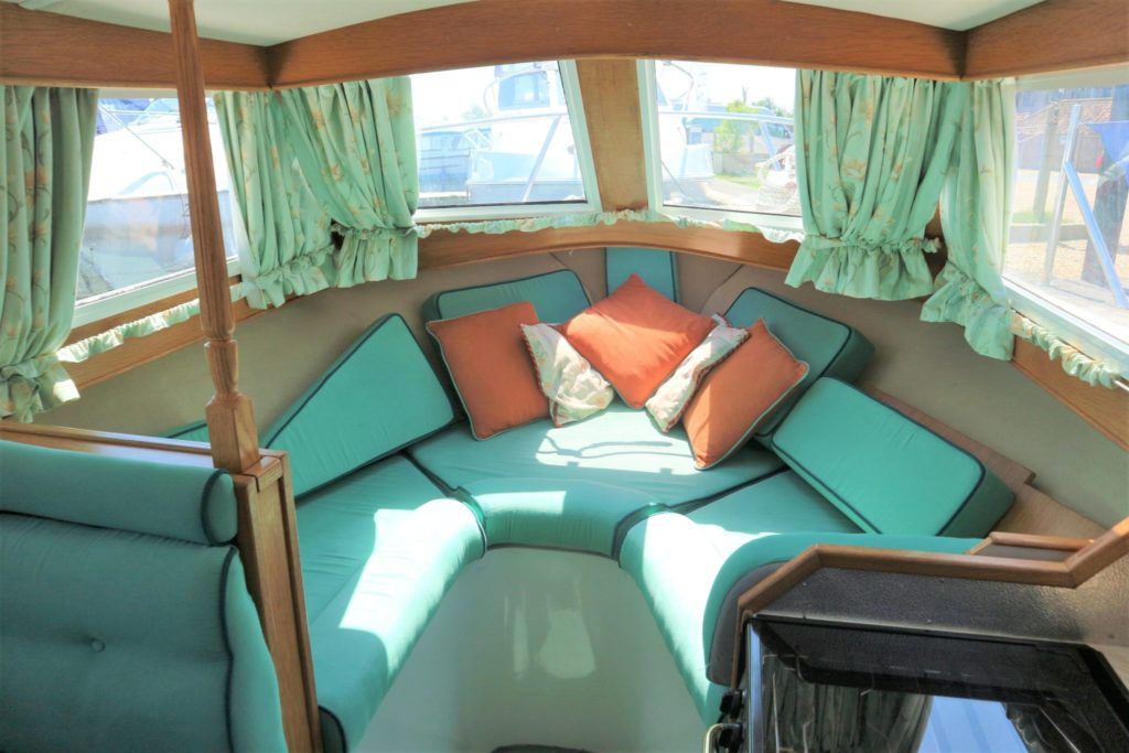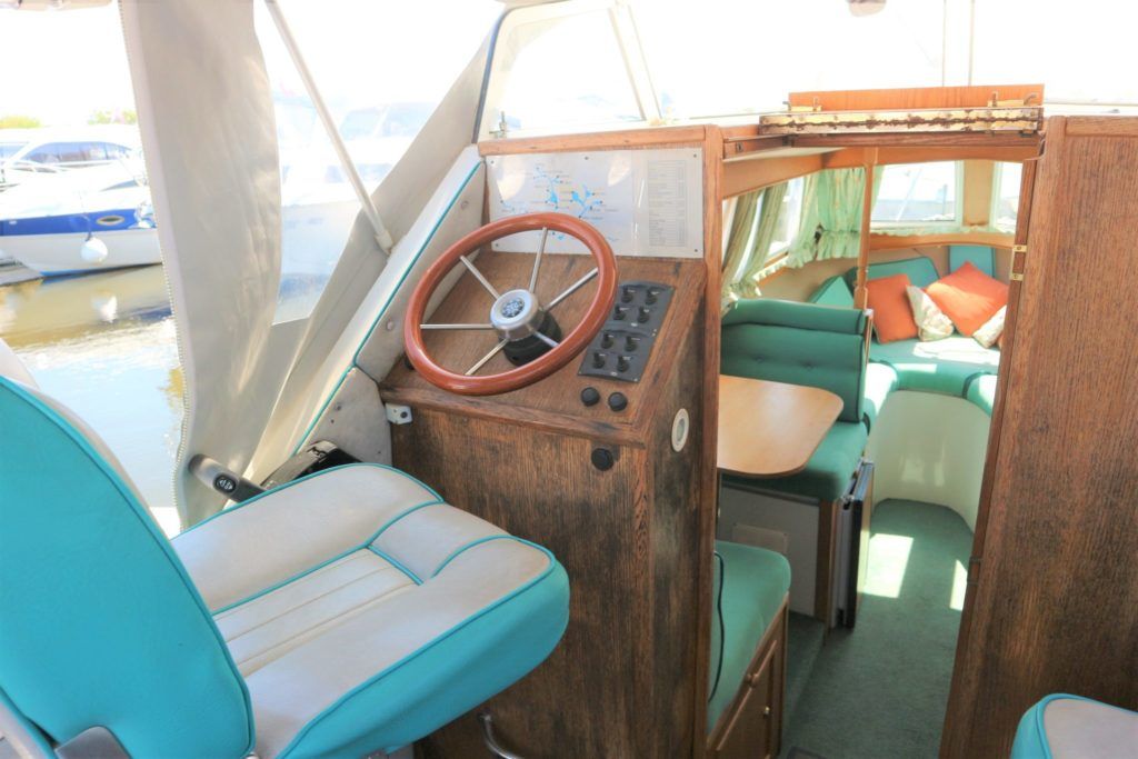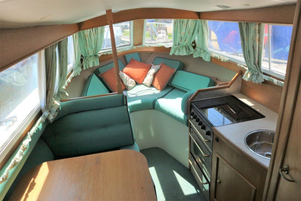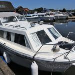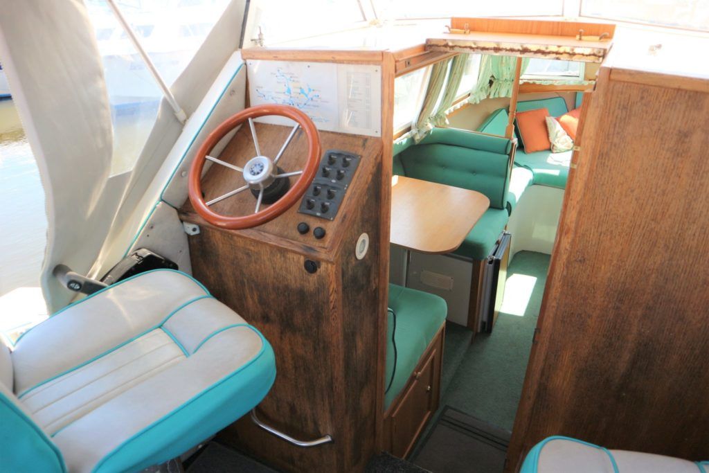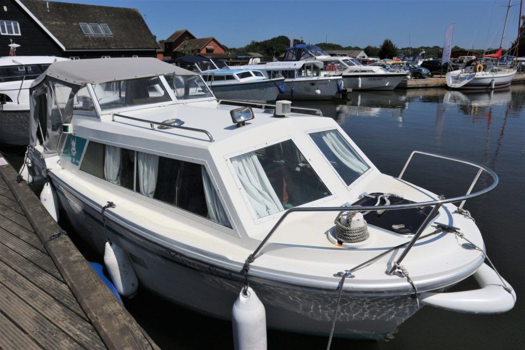 VIKING JUBILEE 20 – 1999 – 1 x Honda 20hp outboard engine (fitted 2013). 4 berth accommodation with 1 x portaloo & shower compartment. Galley with full size gas cooker & electric fridge. Spec including Propex warm air heating, water heater, folding windscreens for access through lower bridges, BSC 09/19. An ideal starter boat offering spacious & versatile accommodation with a sociable cockpit.
