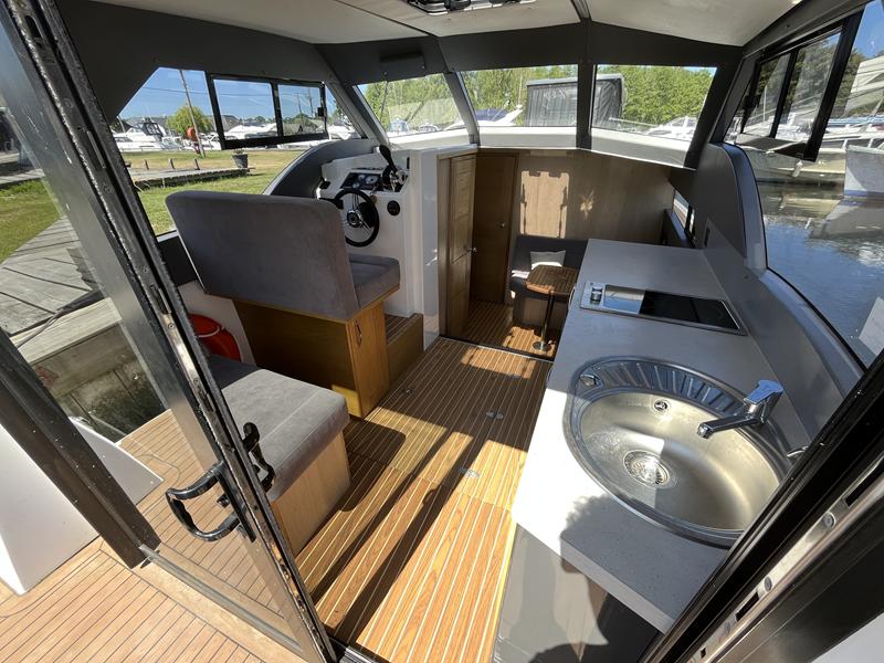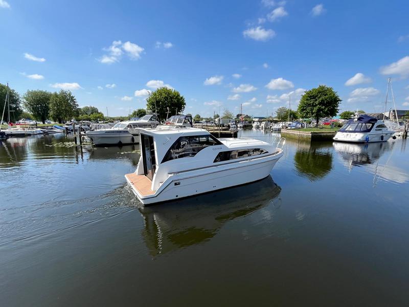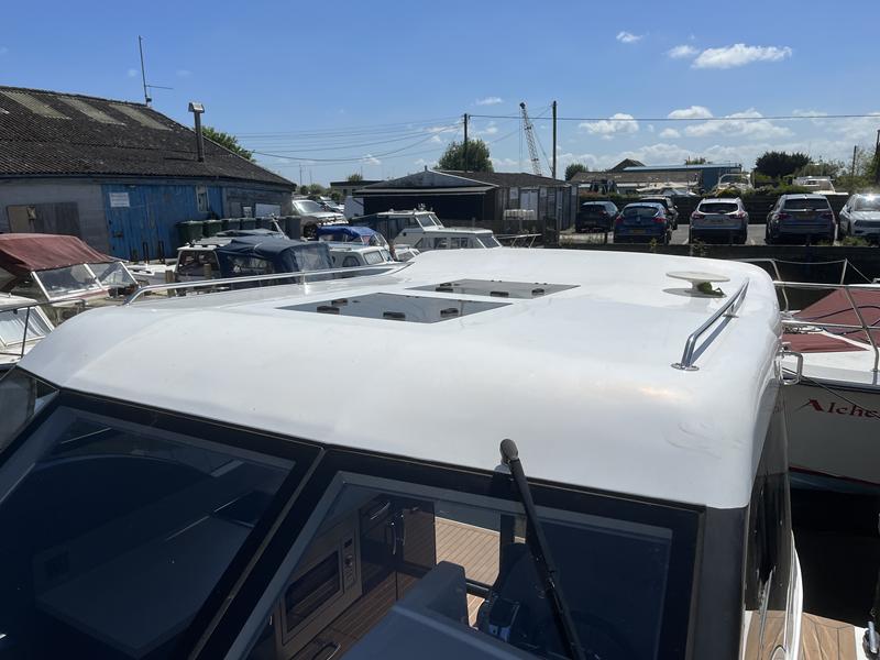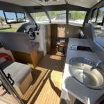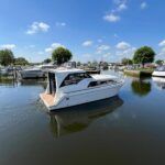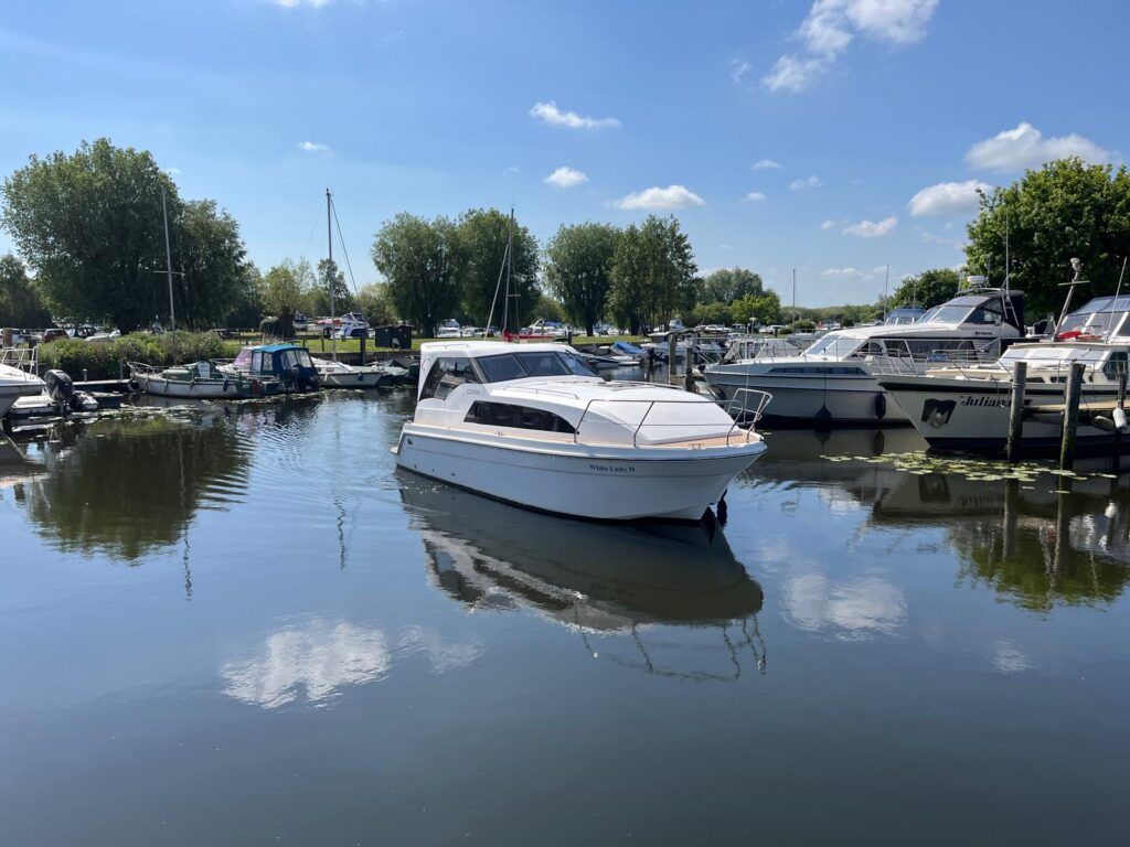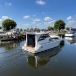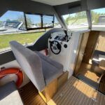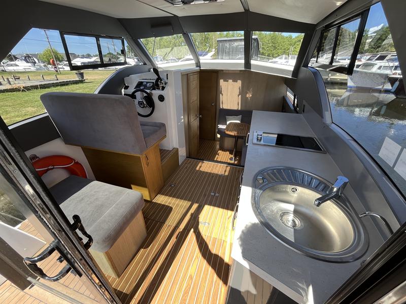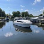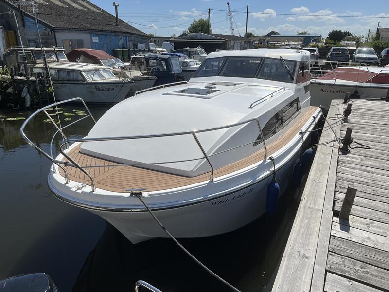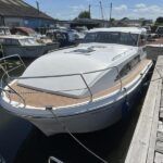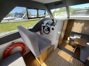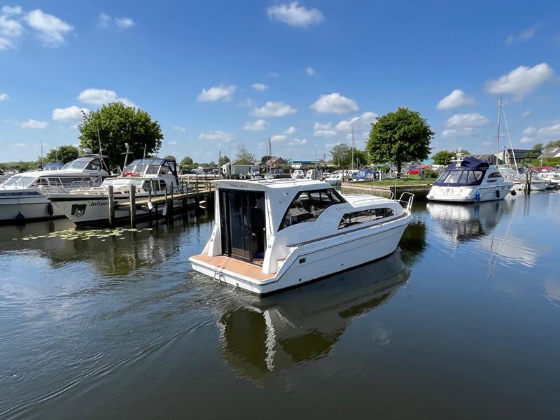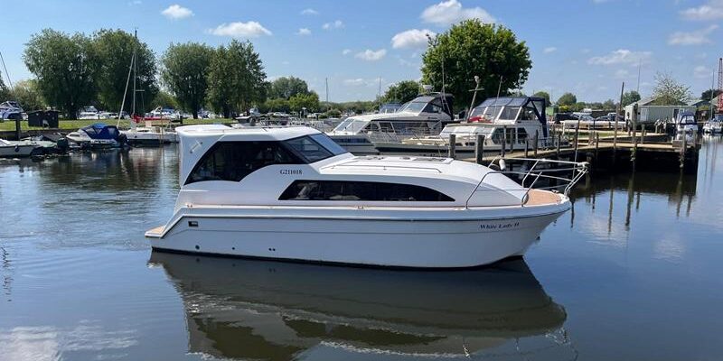 Vogue 27 – 2019 – Powered by a Nanni N4.38 (38hp) diesel engine. Up to 3 berth accommodation with island double berth master cabin & 1 x electric toilet/shower compartment. Specification to include; Bow thruster, shore power, battery charger, immersion heater, 2 x 3000w Victron inverters, Warm air heating, speedometer, synthetic teak decking, hydraulic steering and more. BSC 2027. Serviced and antifouled 2024. A unique sedan-style river cruiser offering a modern, contemporary interior and luxurious accommodation for its size.