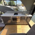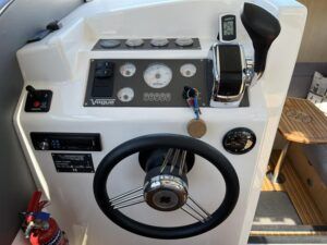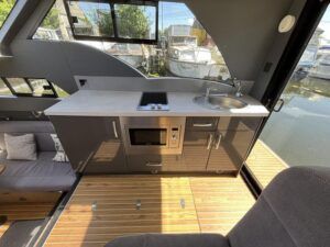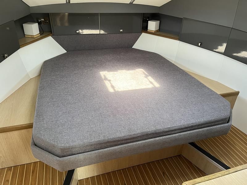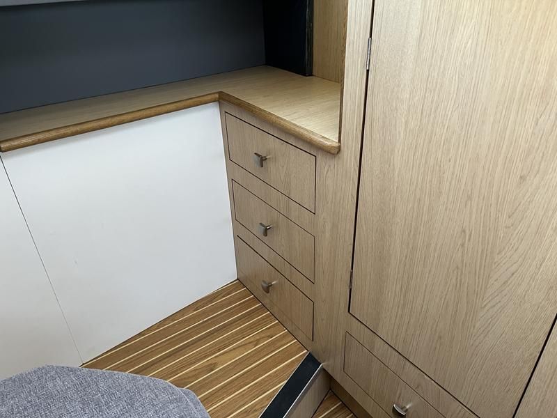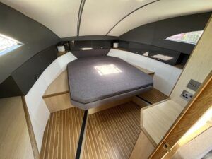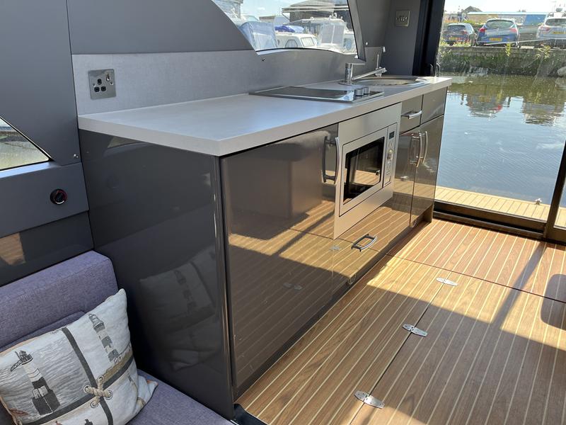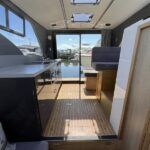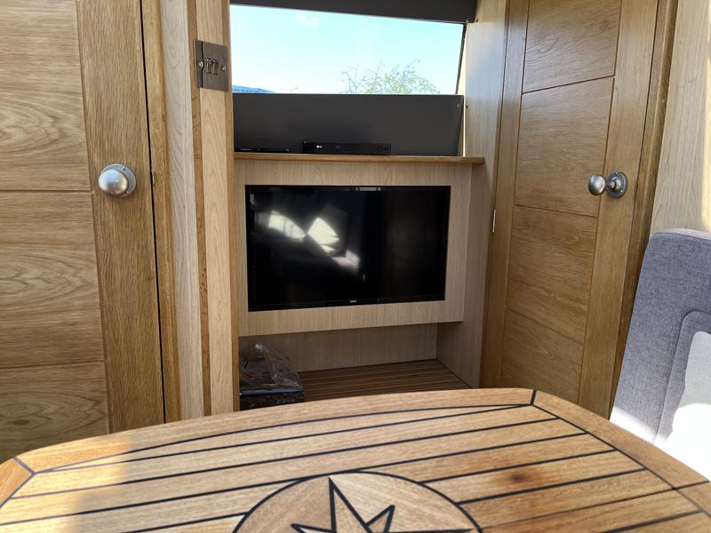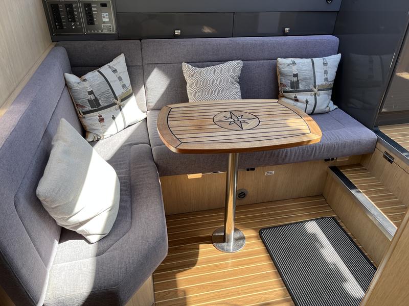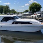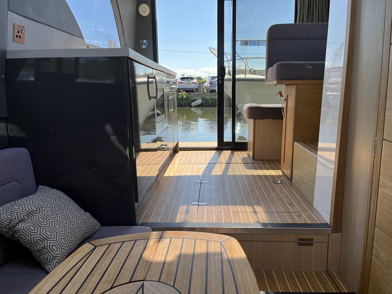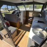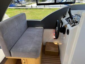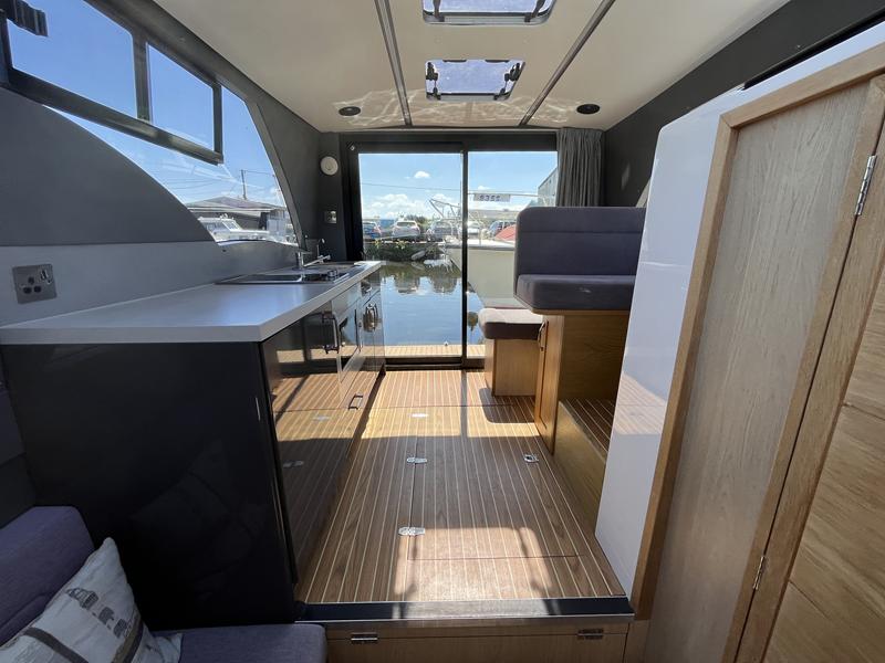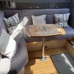 Vogue 27 – 2019 – Powered by a Nanni N4.38 (38hp) diesel engine. Up to 3 berth accommodation with island double berth master cabin & 1 x electric toilet/shower compartment. Specification to include; Bow thruster, shore power, battery charger, immersion heater, 2 x 3000w Victron inverters, Warm air heating, speedometer, synthetic teak decking, hydraulic steering and more. BSC 2027. Serviced and antifouled 2024. A unique sedan-style river cruiser offering a modern, contemporary interior and luxurious accommodation for its size.