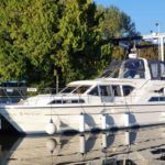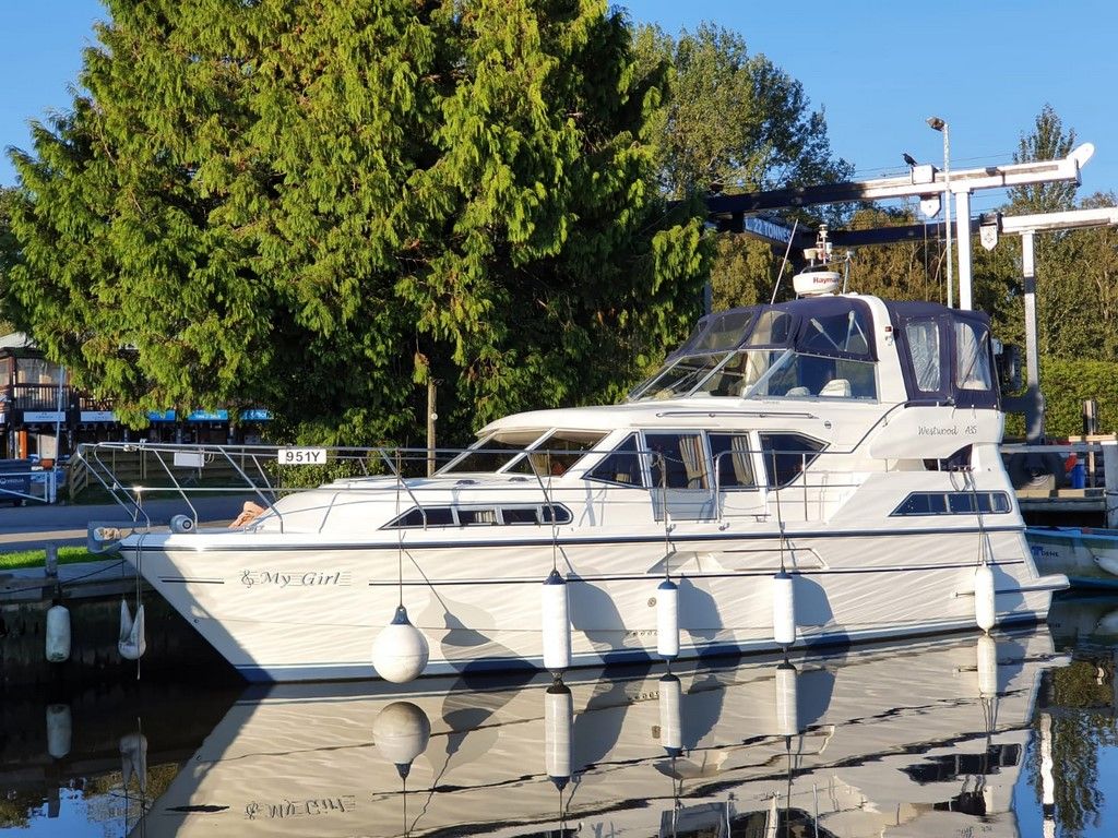 WESTWOOD A35 – 2007, single Yanmar 220hp diesel engine, 6 berth accommodation, 2 x toilet/ showers. Specifiation to include; bow thruster, Eberspacher warm air heating, Victron Multiplus battery charger and 2000w inverter, holding tank, shore power with 240v ring main and immersion, Raymarine C80 plotter, Raymarine VHF. Folding arch and screens for increased inland access. Teak laid bathing platform. Engine service, antifoul and hull machine polish July 2020! A fine example of these versatile cruisers, clearly well kept by current owners!