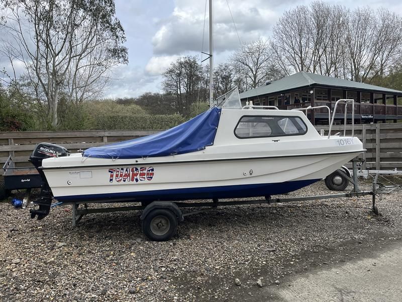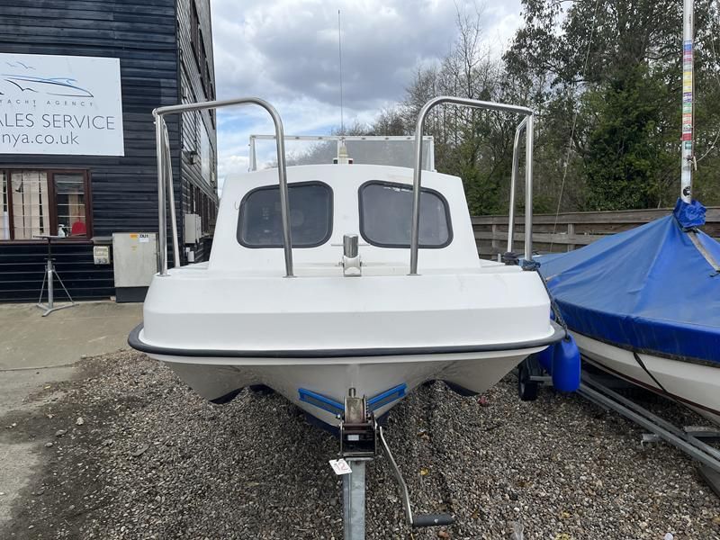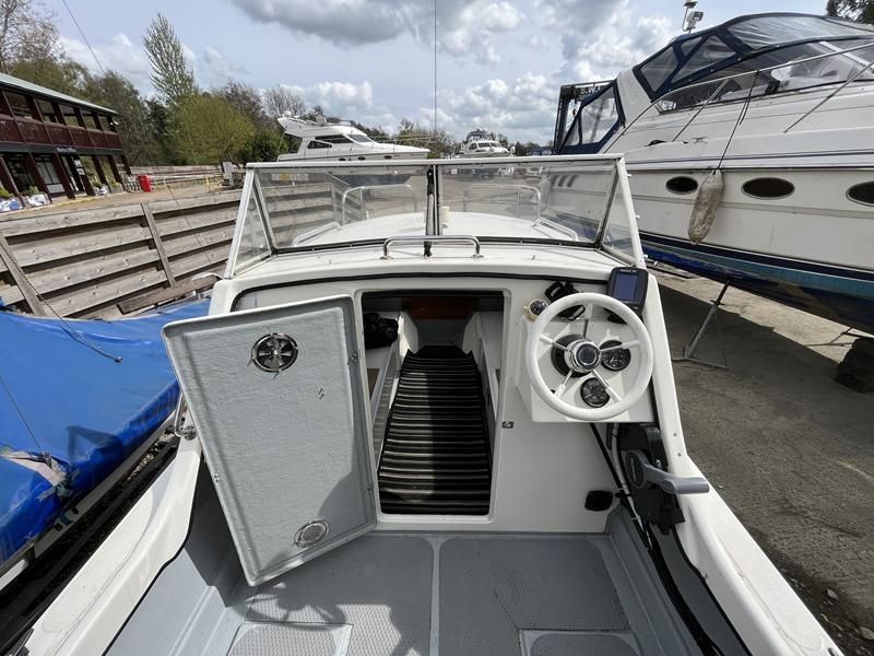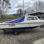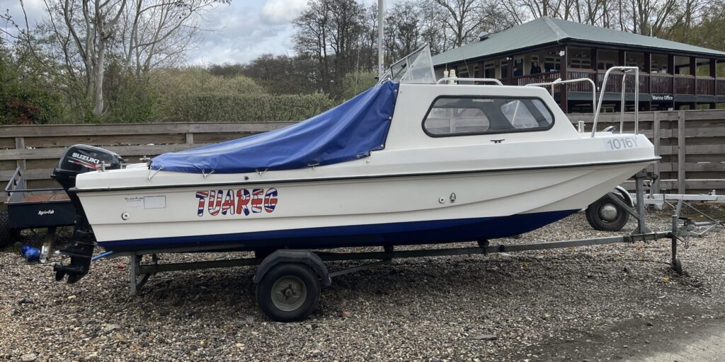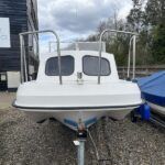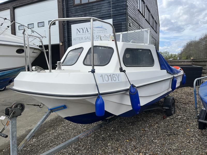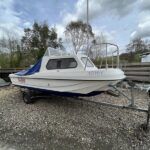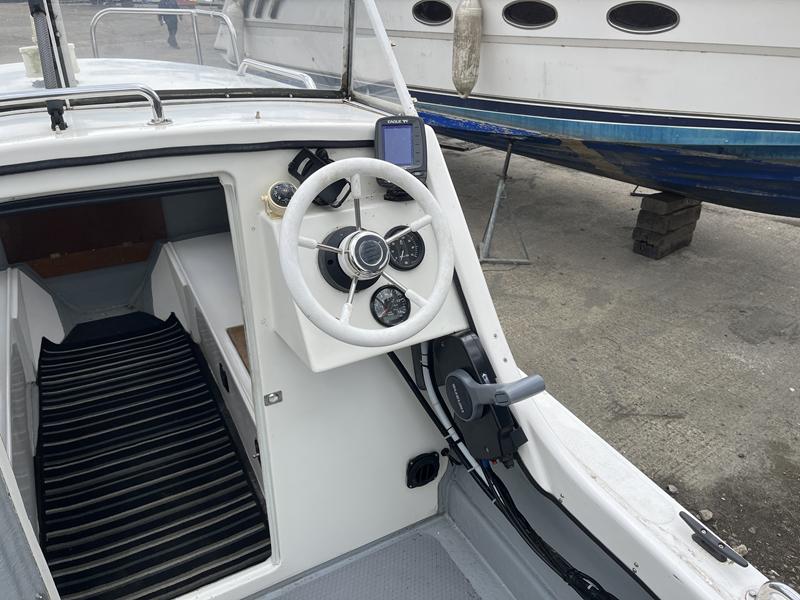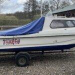 Wilson Flyer- 2010 – Powered by a Suzuki 15hp four stroke outboard engine. Spacious deck with a cabin, making it ideal for fishing. Specification to include; Propex hot air heating, navigation lights, Eagle fishfinder, VHF radio, compass, 12v sockets and more. Engine service 2024. Antifouled 2025. Comes with the road trailer and full canopy. Solid and stable, ideal platform for fishing.