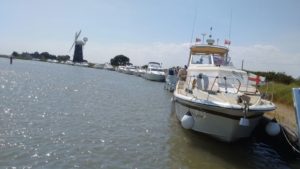 The passage under Acle Bridge was uneventful with a clearance of plus 12’ some boats didn’t really need to lower much in the way of canopies and arches. The larger air draft vessels using the opportunity to practice their drills in readiness for the Vauxhall Bridges in Great Yarmouth. As we approached Great Yarmouth the Cruise Leader called ahead to the Yacht Station in order to check the bridge clearance. All was well and the Flotilla successful made their way through and onto Breydon Water.
