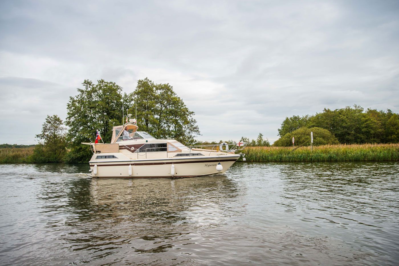 After a couple of years, Graham and Debbie needed something a little bigger to cater for friends wanting to stay over and to satisfy Graham’s desire for something that looks more like a “boat boat”. Again, NYA had the perfect boat in stock, a 1985 Broom 10-70 they christened Hyperion – the mythical Sun God – after a battleship in an Alexander Kent (AKA Douglass Reeman) historical novel, Form Line of Battle! “We couldn’t easily have people stay over, and this was so well looked after and gave us the accommodation we needed, sleeping four to six comfortably,” says Graham. “It was lovely because it meant I didn’t have to make beds every day,” adds Debbie. “The Wild Rover was one big cabin so every day I had to make the bed up. I was really excited about getting a bigger boat. It’s so quiet you can hear the wash on the water – travelling at river speeds the boat is very, very tranquil. I love the space, and this is our home from home.”