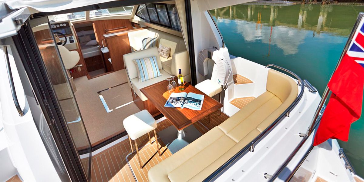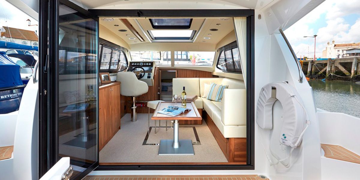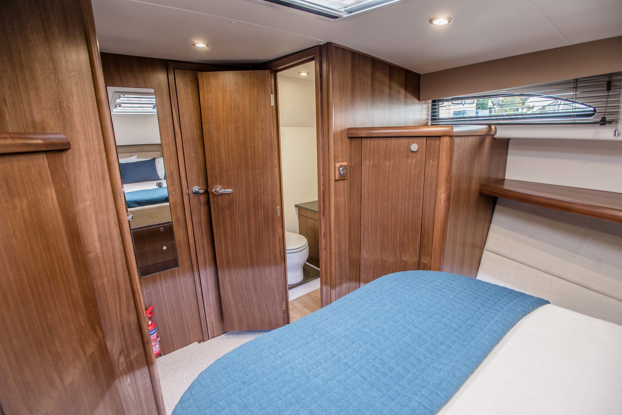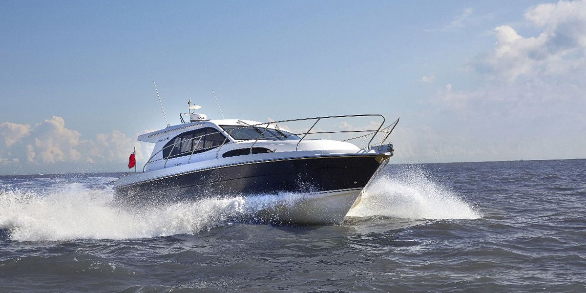 With a full offshore planing hull designed by renowned designer Andrew Wolstenholme, delivers a comfortable performance at low to intermediate planing speeds. Offered with a range of single or twin engine options and Haines unquestionable build quality. Light and airy throughout, with full opening ‘slide and stack’ patio doors connecting the saloon to the aft deck area. The large island double en-suite cabin forward and generous galley provides excellent accommodation for those longer stays onboard.