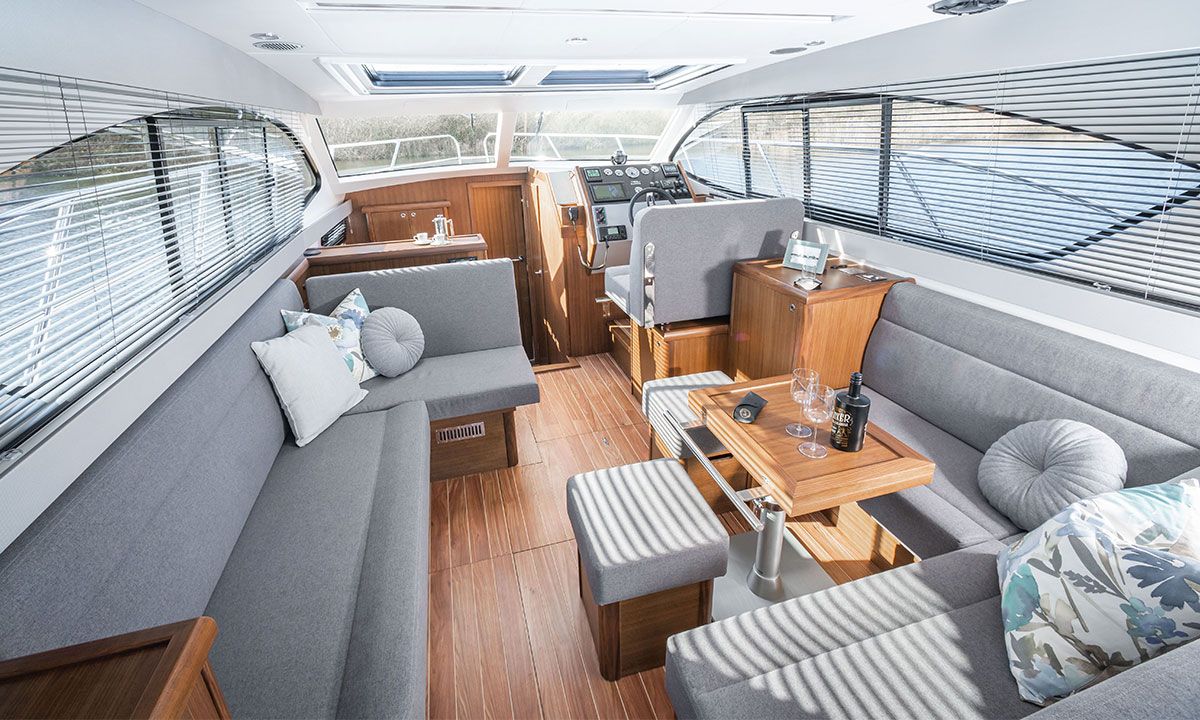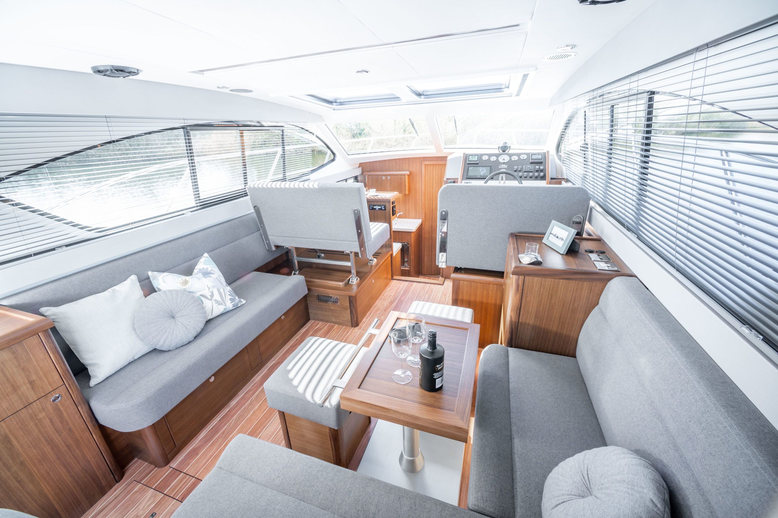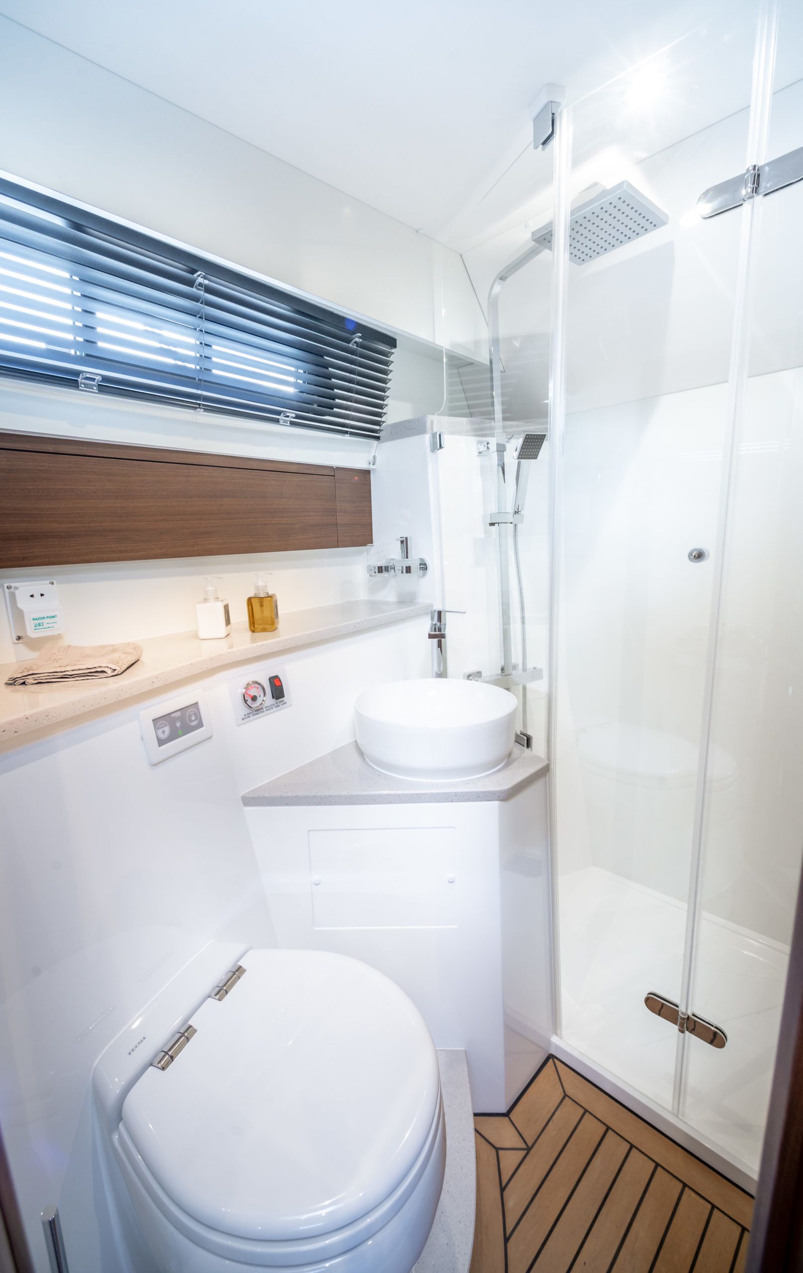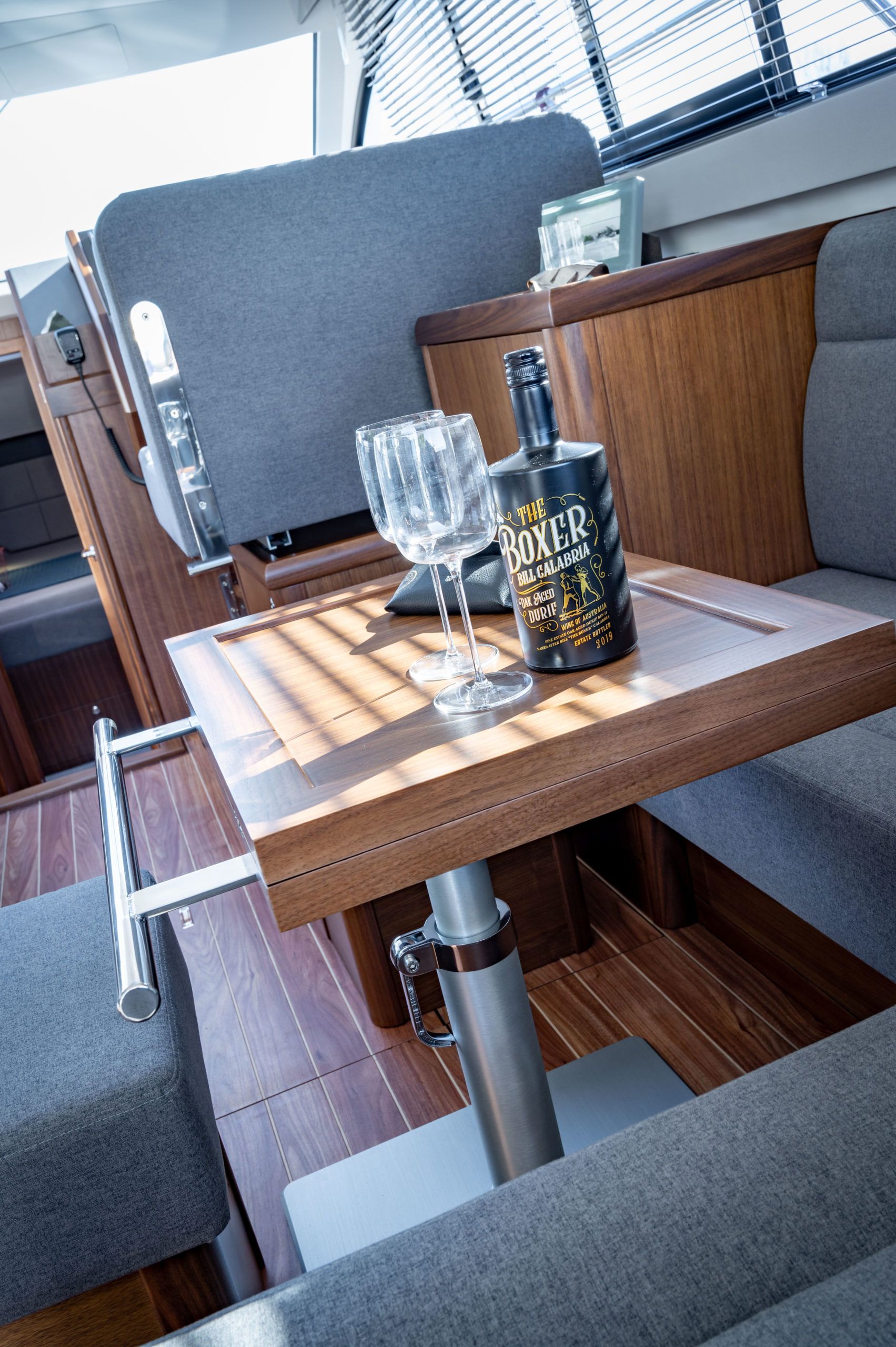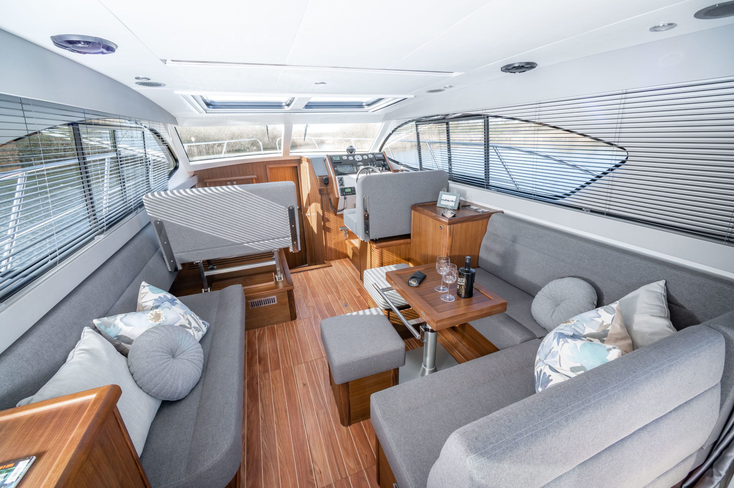 Light and airy throughout, with full opening ‘slide and stack’ patio doors connecting the saloon to the aft deck area. The large island double en-suite cabin forward and the generous open-plan saloon and galley space provides excellent accommodation for those longer stays onboard. The mid cabin option gives extended accommodation for guests, along with a converting saloon settee which provides further additional berths.