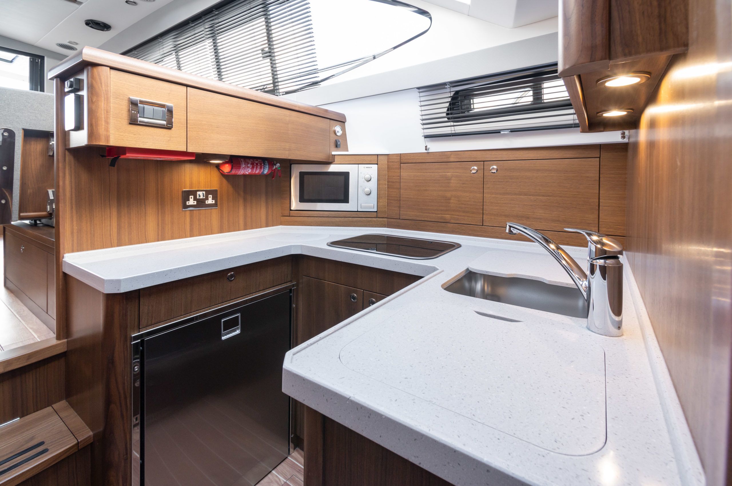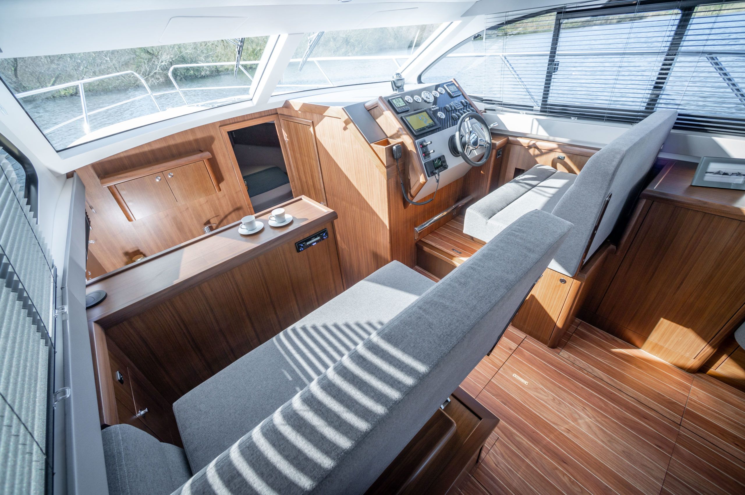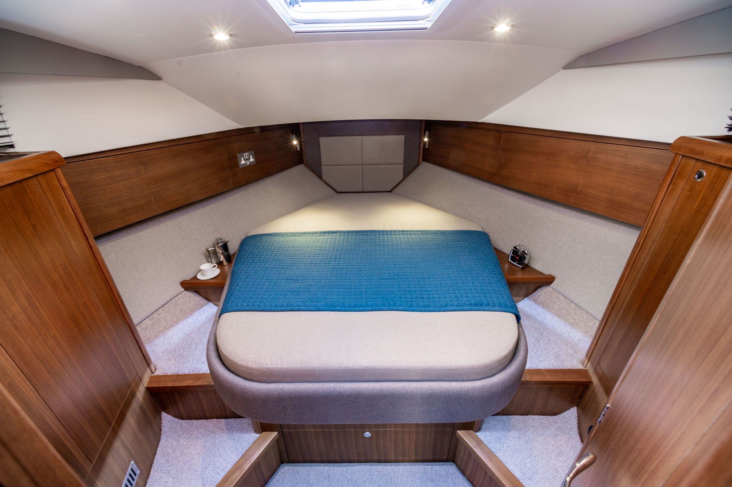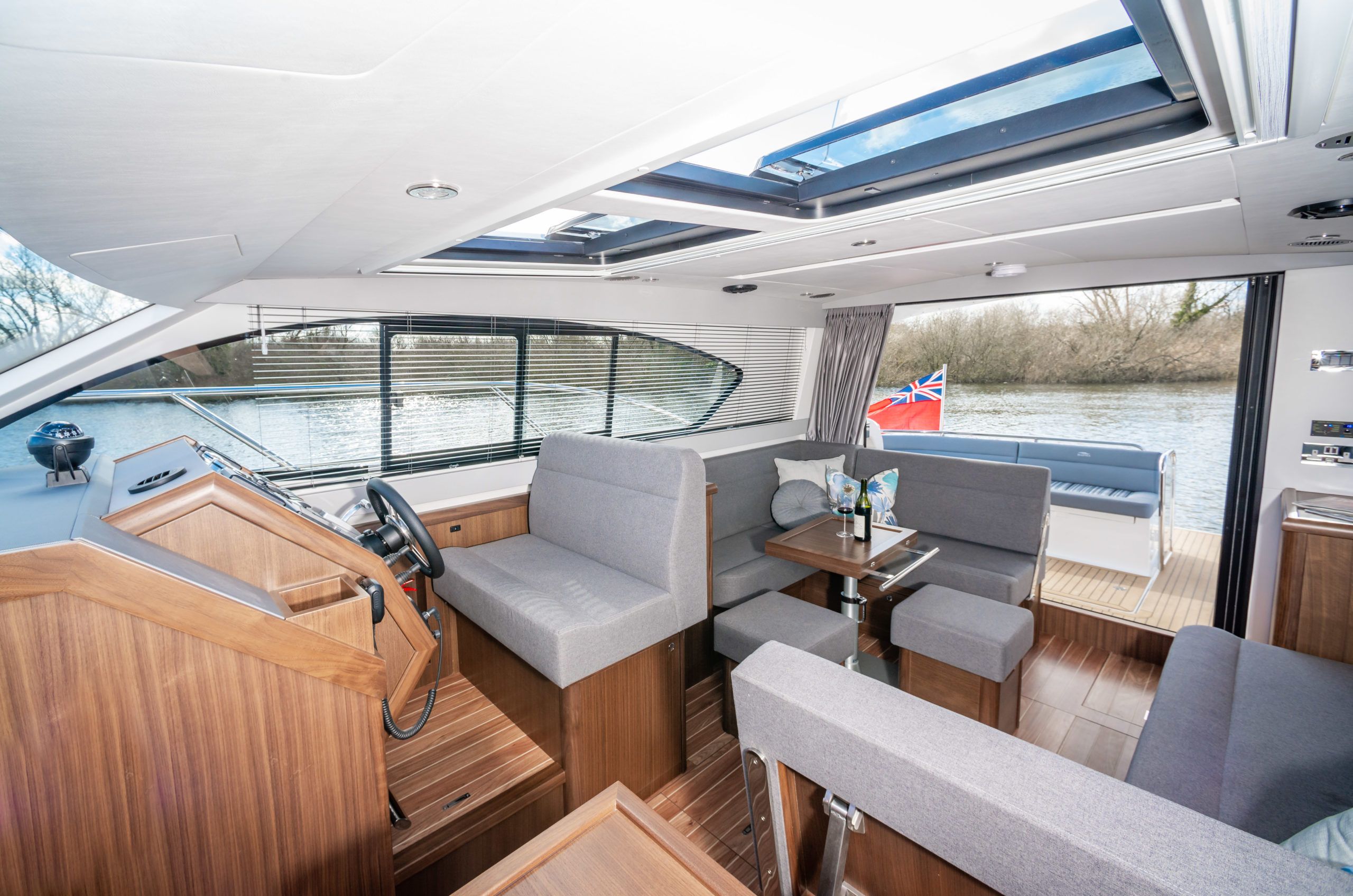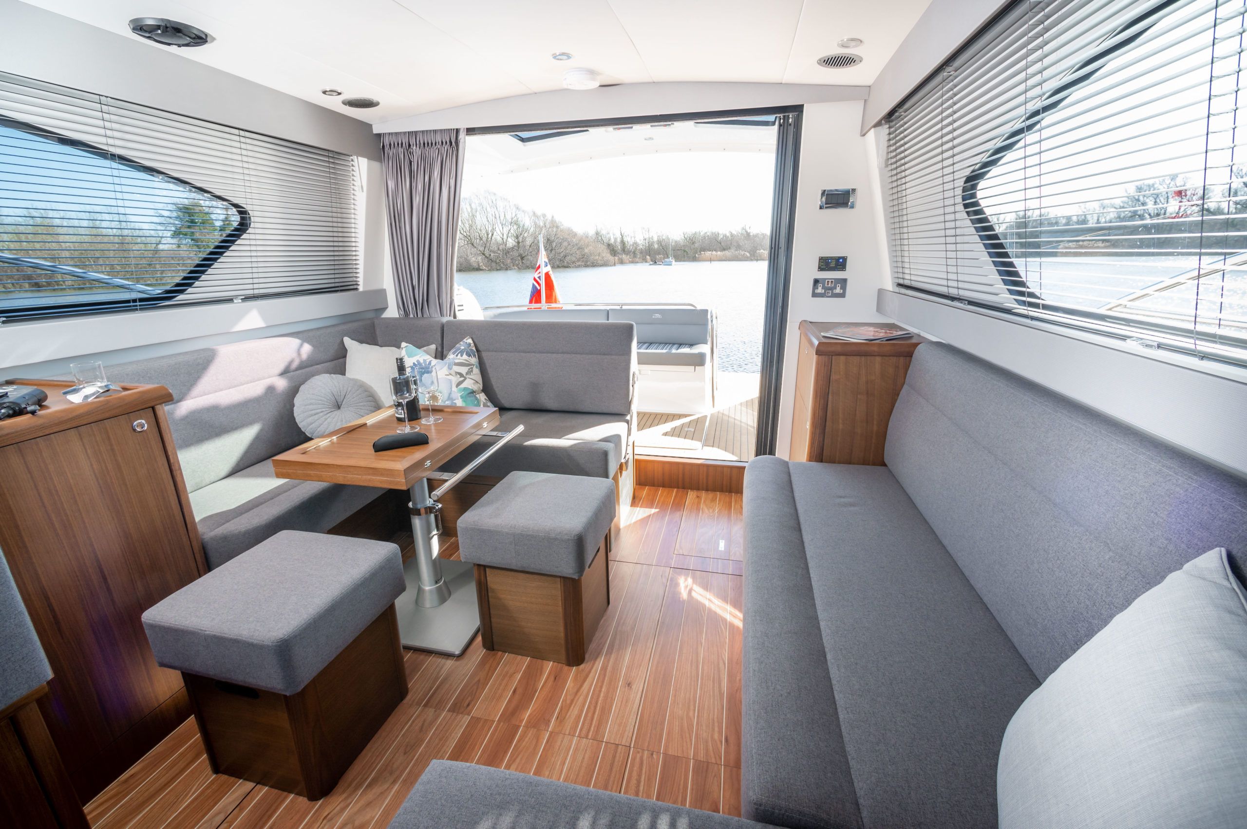 Light and airy throughout, with full opening ‘slide and stack’ patio doors connecting the saloon to the aft deck area. The large island double en-suite cabin forward and the generous open-plan saloon and galley space provides excellent accommodation for those longer stays onboard. The mid cabin option gives extended accommodation for guests, along with a converting saloon settee which provides further additional berths.