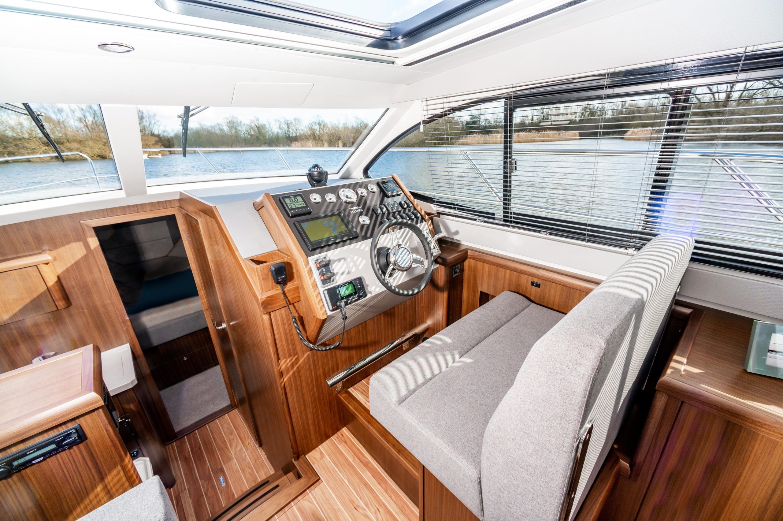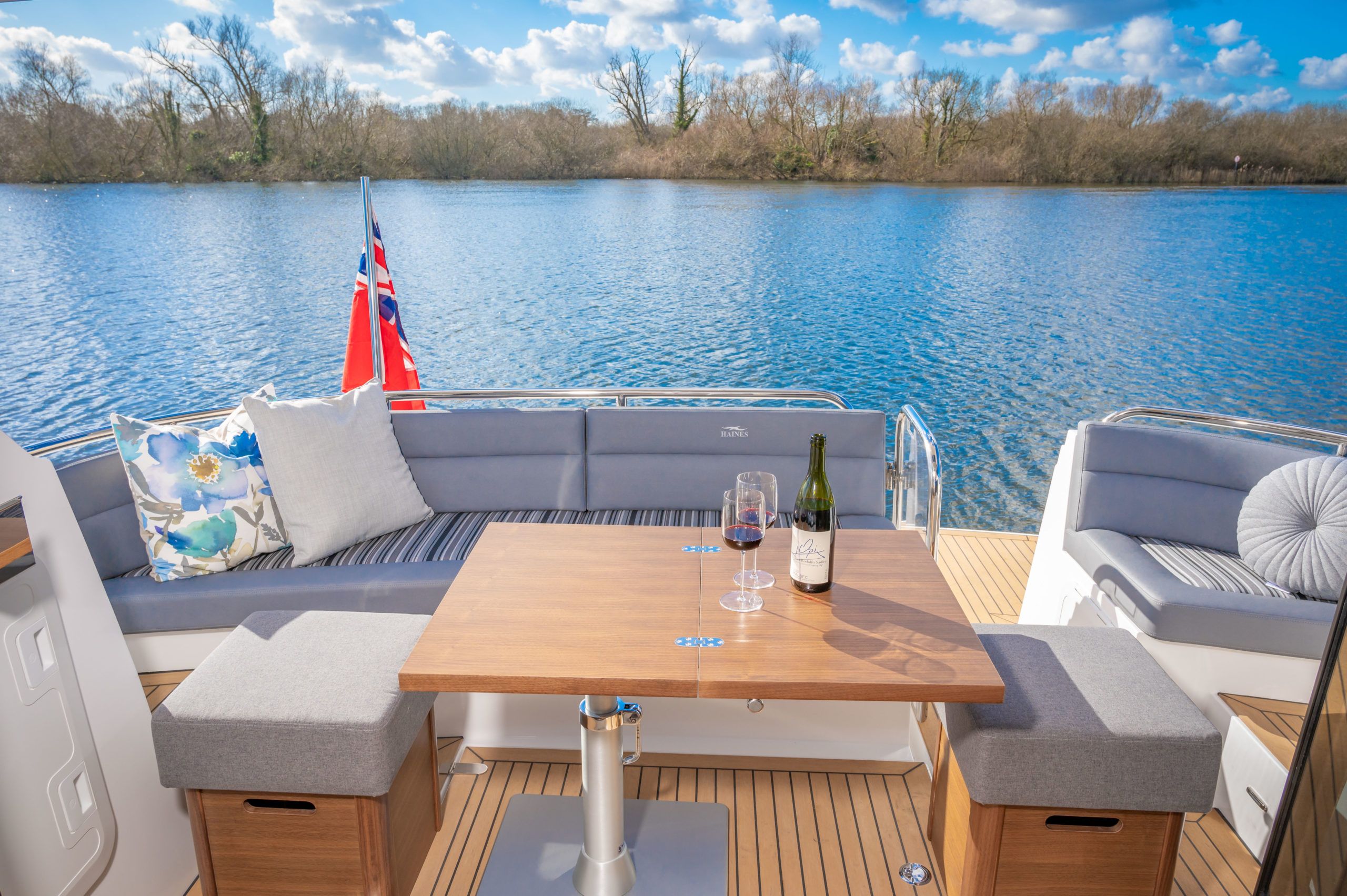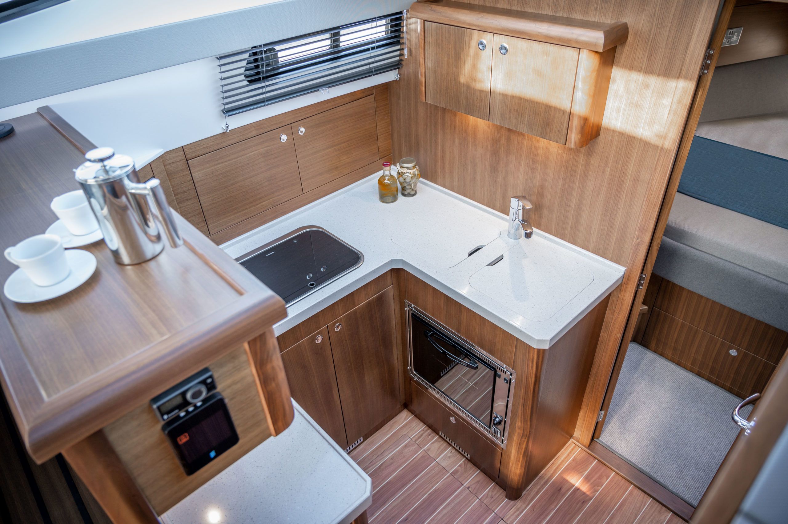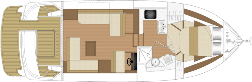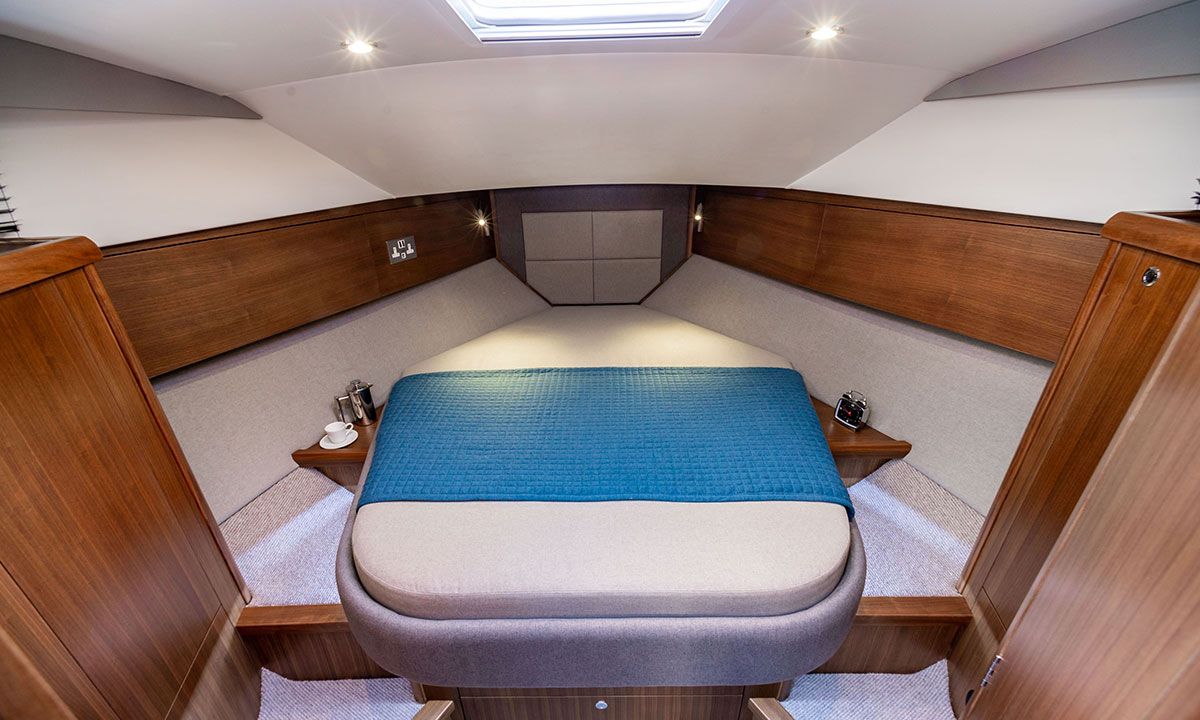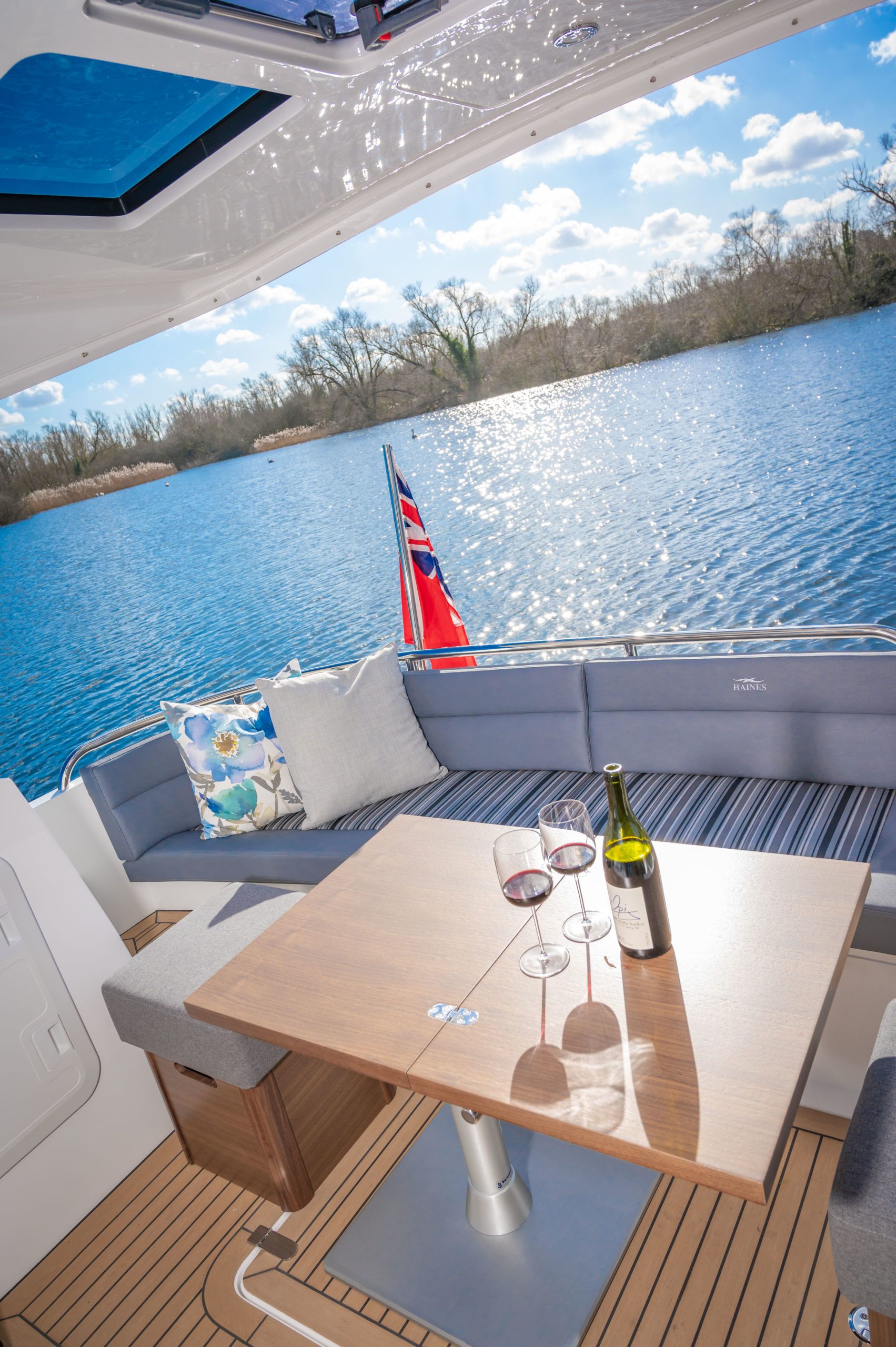 Light and airy throughout, with full opening ‘slide and stack’ patio doors connecting the saloon to the aft deck area. The large island double en-suite cabin forward and the generous open-plan saloon and galley space provides excellent accommodation for those longer stays onboard. The mid cabin option gives extended accommodation for guests, along with a converting saloon settee which provides further additional berths.