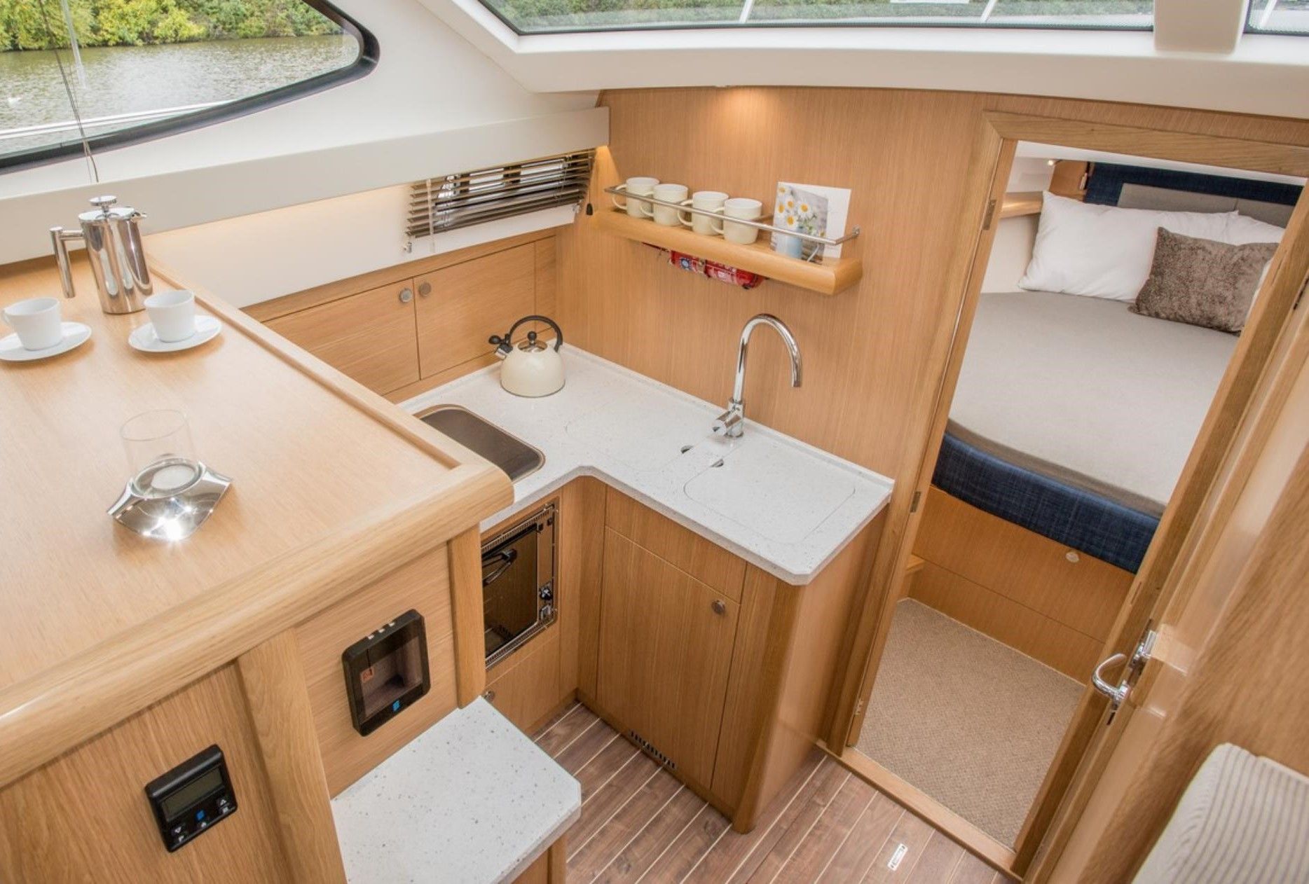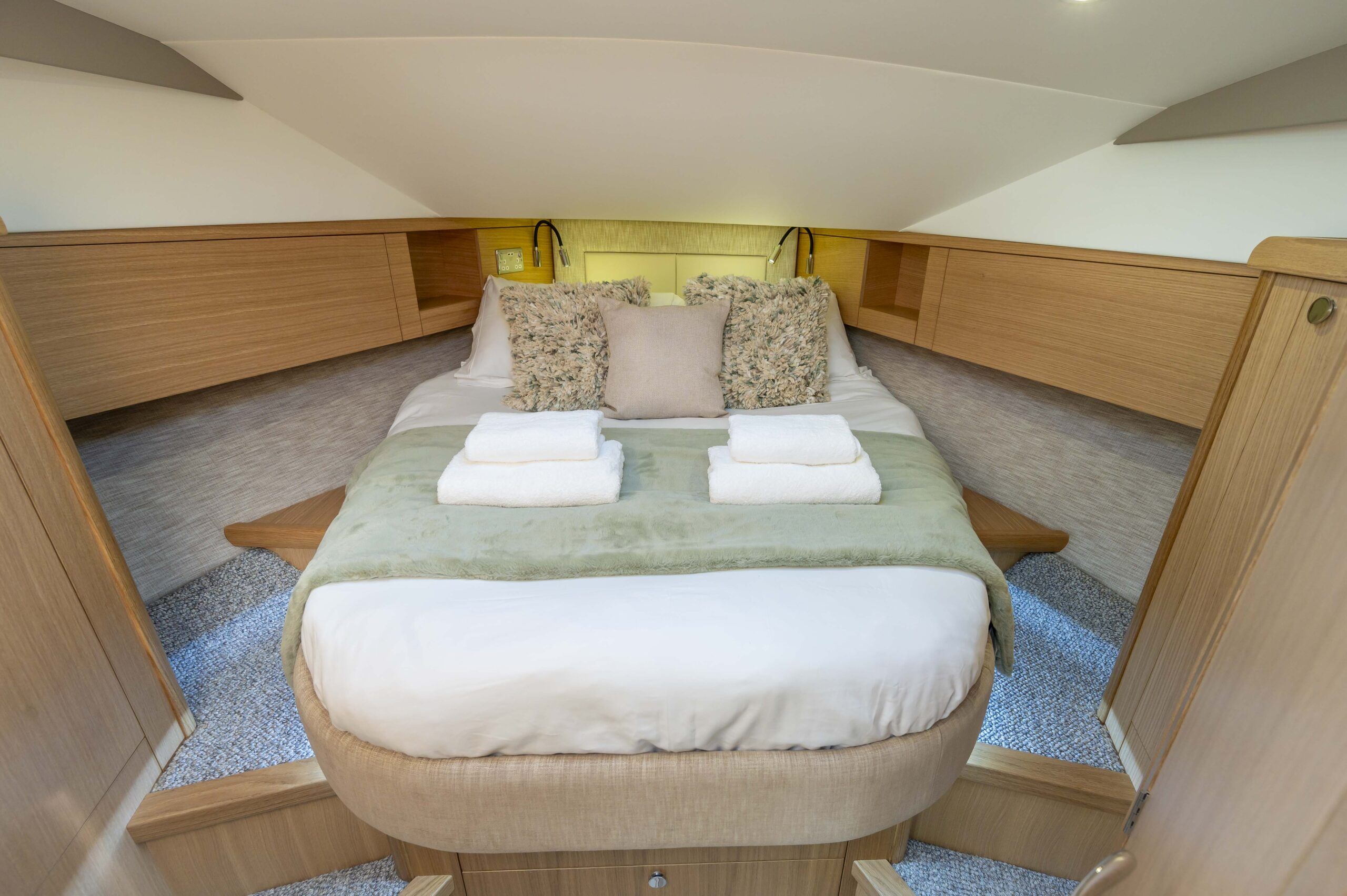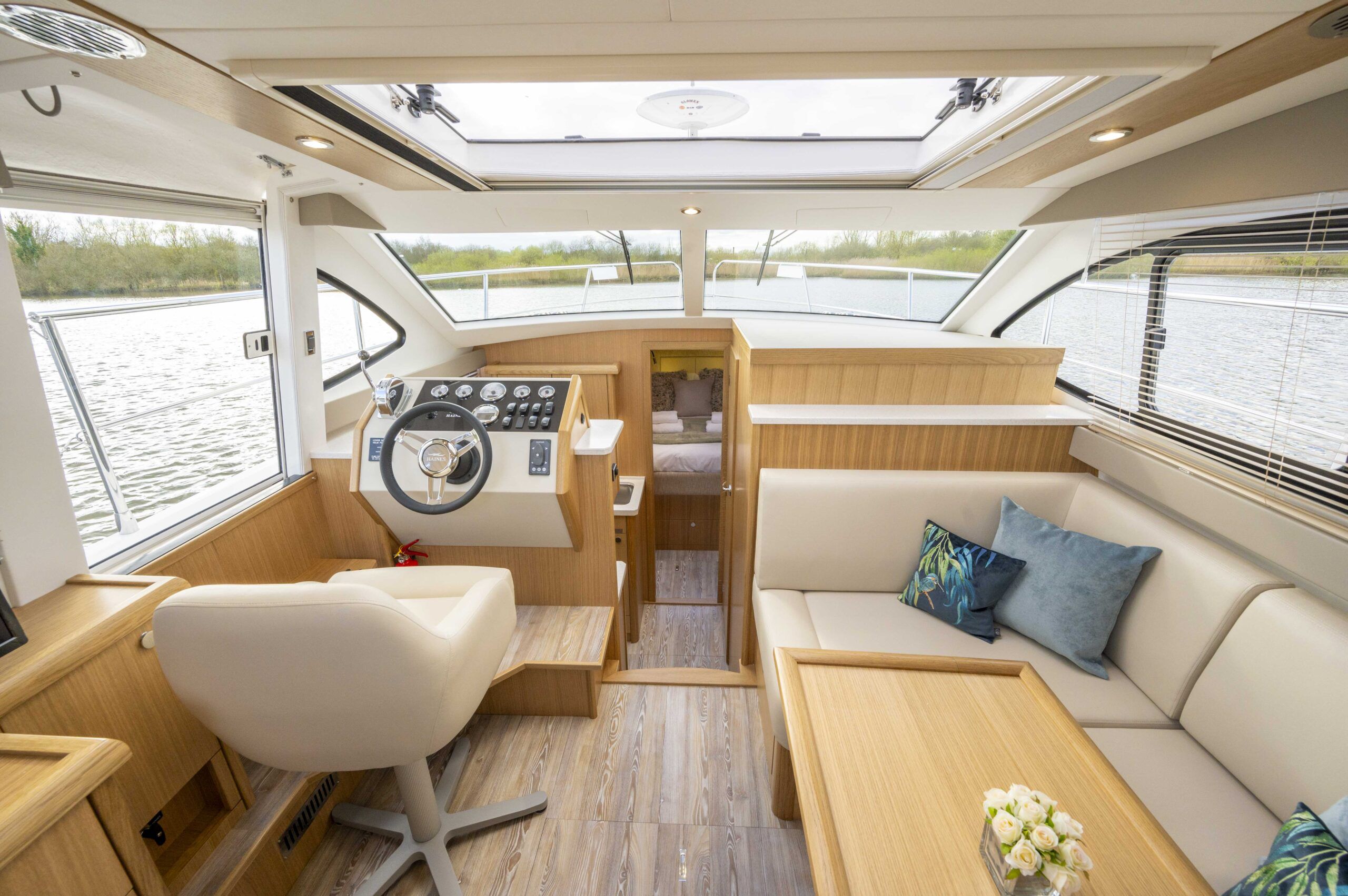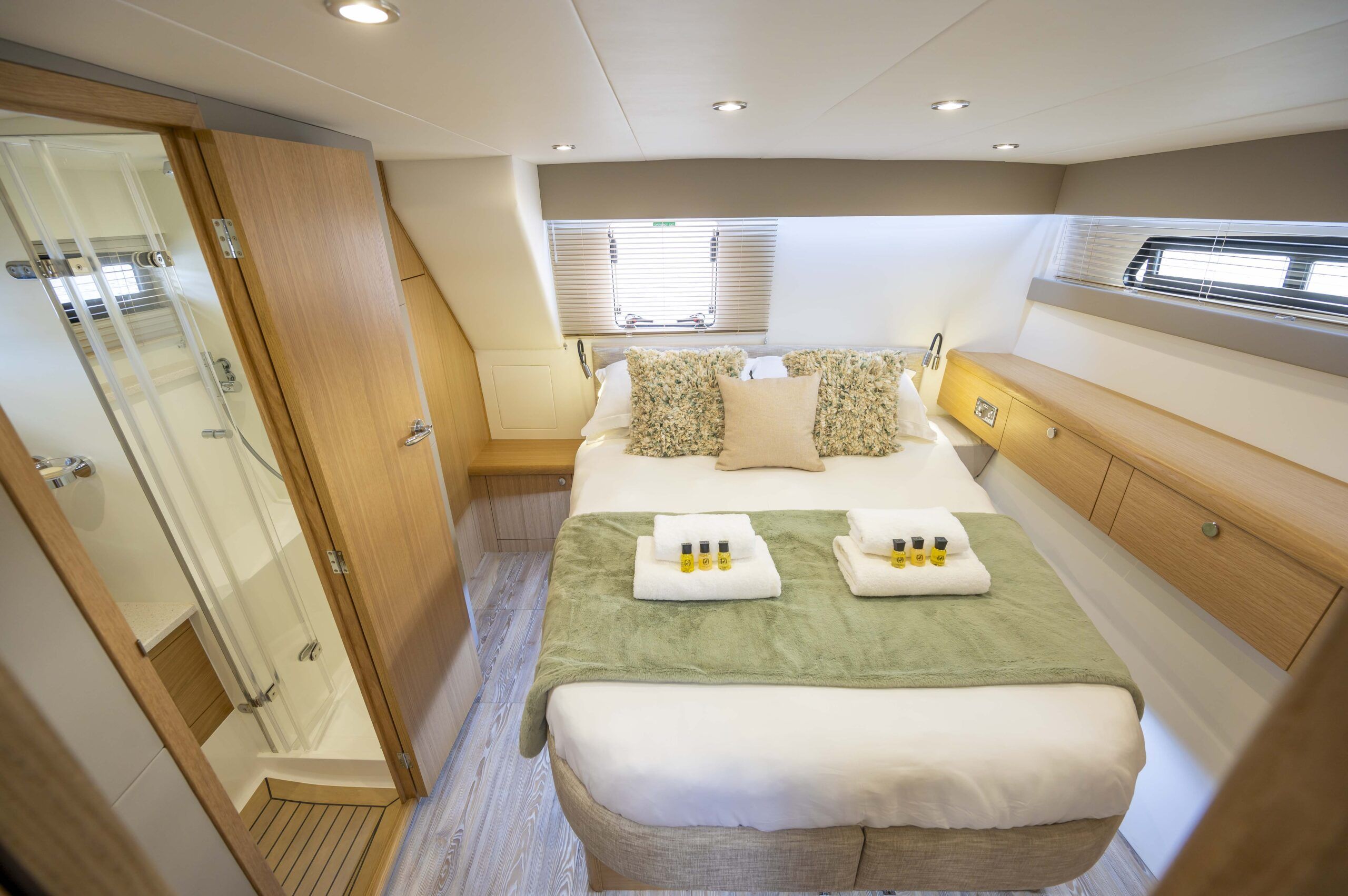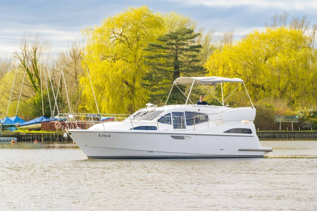 Enya, built by Haines Marine for the NYA Charter Fleet for the 2024 season & offering a contemporary and luxurious cruising experience for four. Featuring two en-suite cabins with island double berths (or one with 2 singles) making her ideal for couples or groups of friends & family. The spacious cushioned flybridge deck with table offers fantastic views across the countryside whilst dining or relaxing under the Bimini sunshade. Her beautifully fitted light Oak interior is both comfortable and stylish with two fridges serving the Saloon and Galley areas. Bow and stern thrusters make her a joy to handle. Experience the highest level of boat ownership with all of the modern comforts on board. For a video walk-through of Enya please CLICK HERE