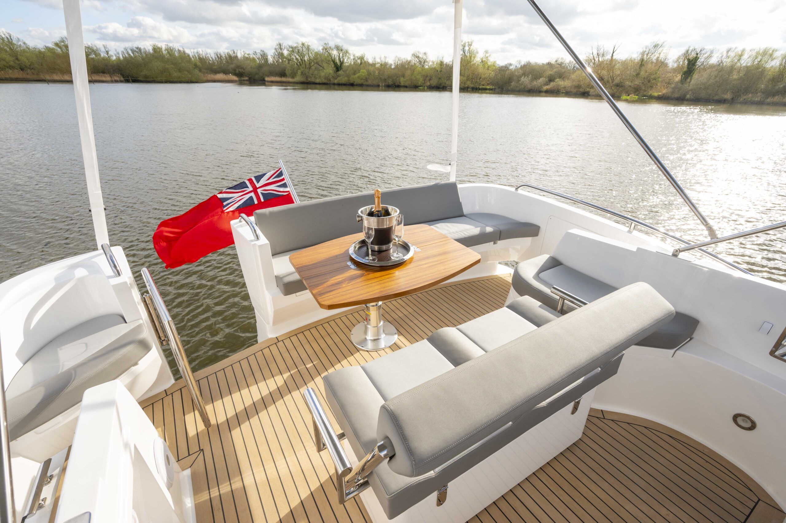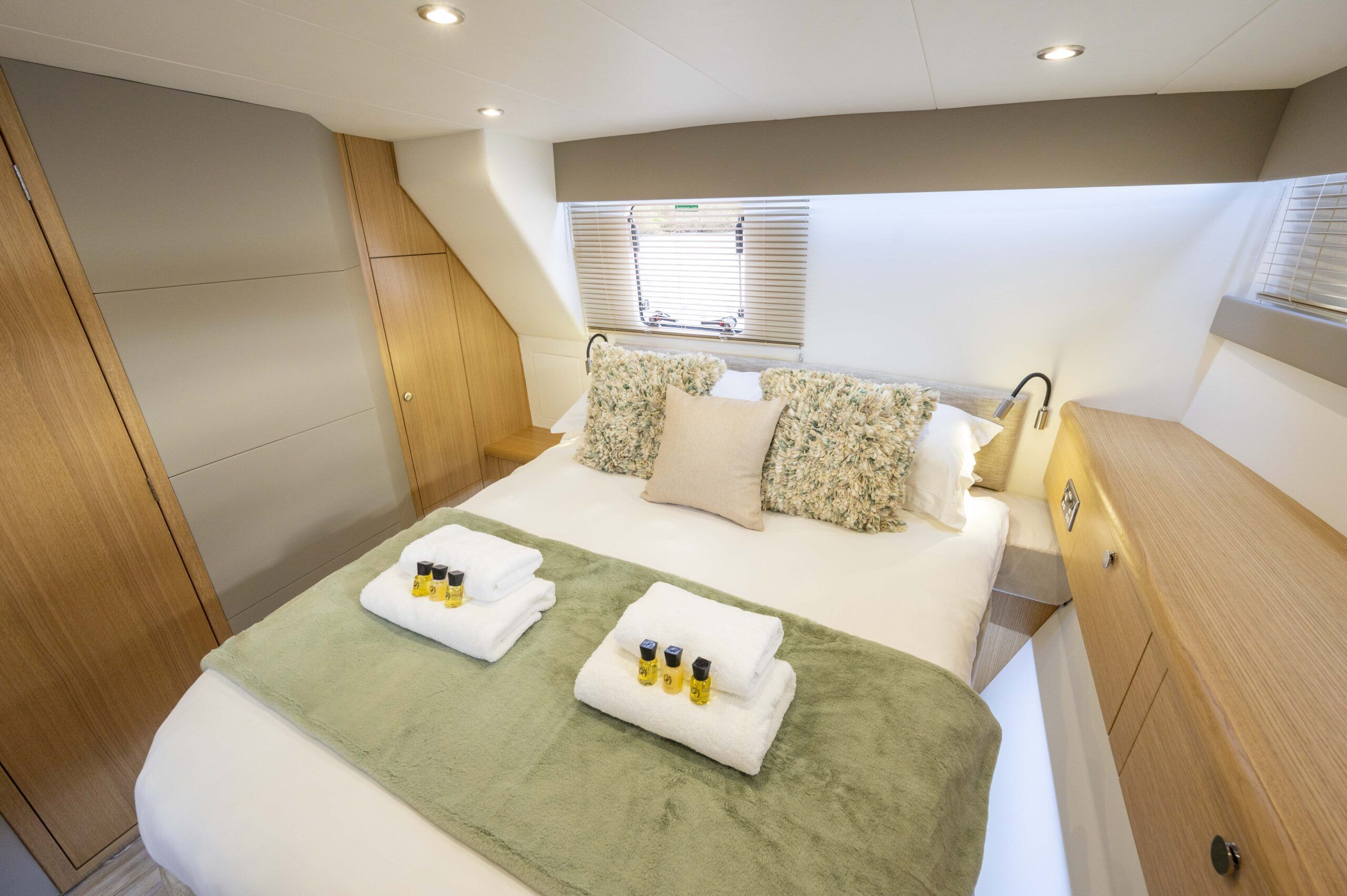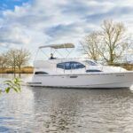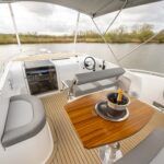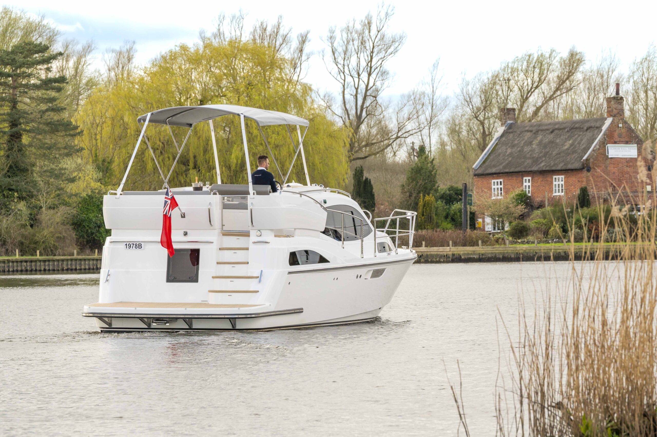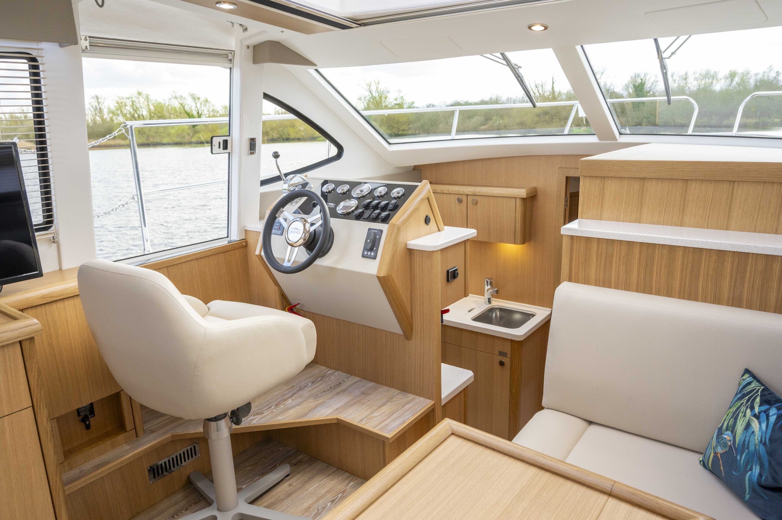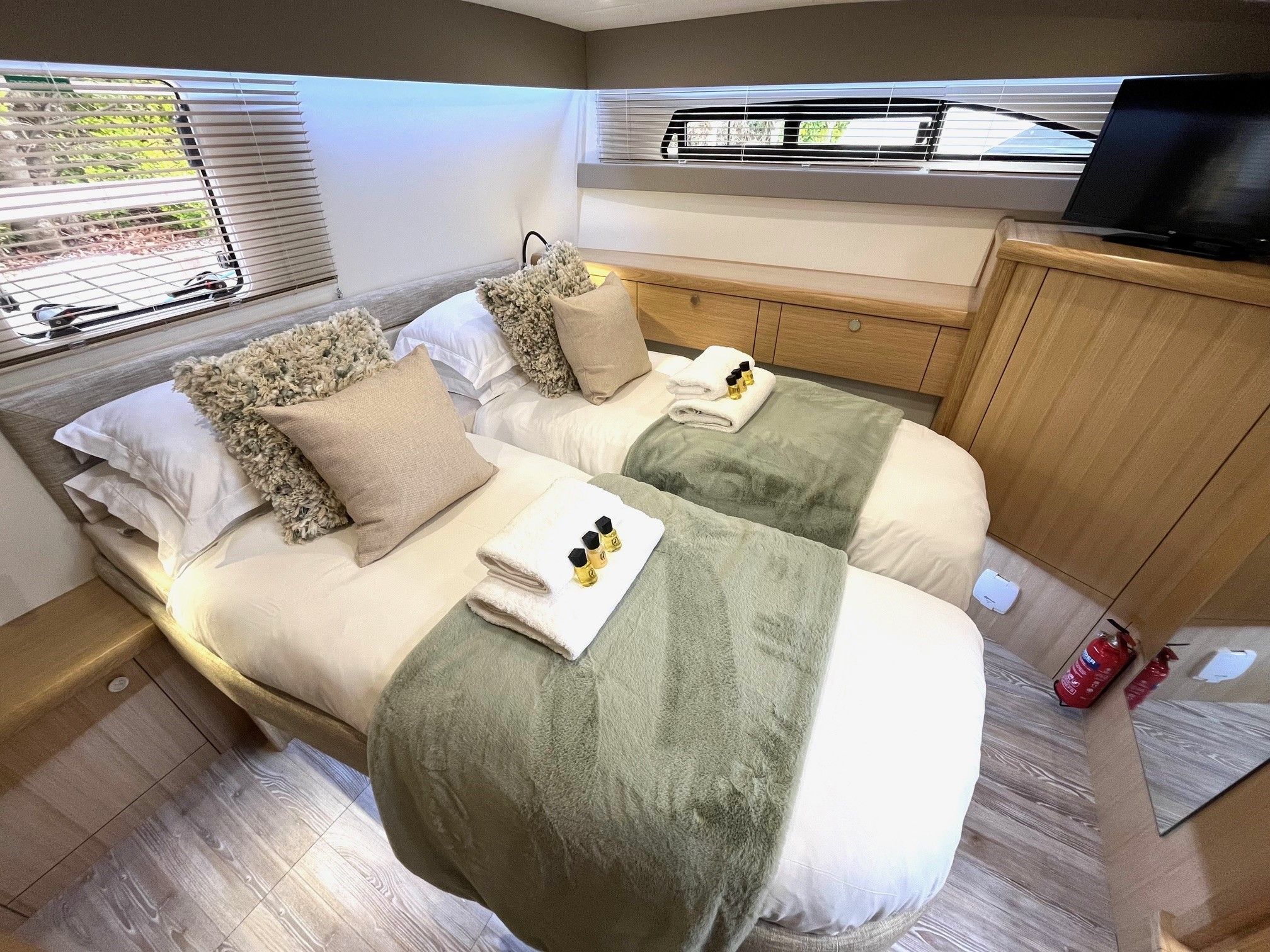 Enya, built by Haines Marine for the NYA Charter Fleet for the 2024 season & offering a contemporary and luxurious cruising experience for four. Featuring two en-suite cabins with island double berths (or one with 2 singles) making her ideal for couples or groups of friends & family. The spacious cushioned flybridge deck with table offers fantastic views across the countryside whilst dining or relaxing under the Bimini sunshade. Her beautifully fitted light Oak interior is both comfortable and stylish with two fridges serving the Saloon and Galley areas. Bow and stern thrusters make her a joy to handle. Experience the highest level of boat ownership with all of the modern comforts on board. For a video walk-through of Enya please CLICK HERE