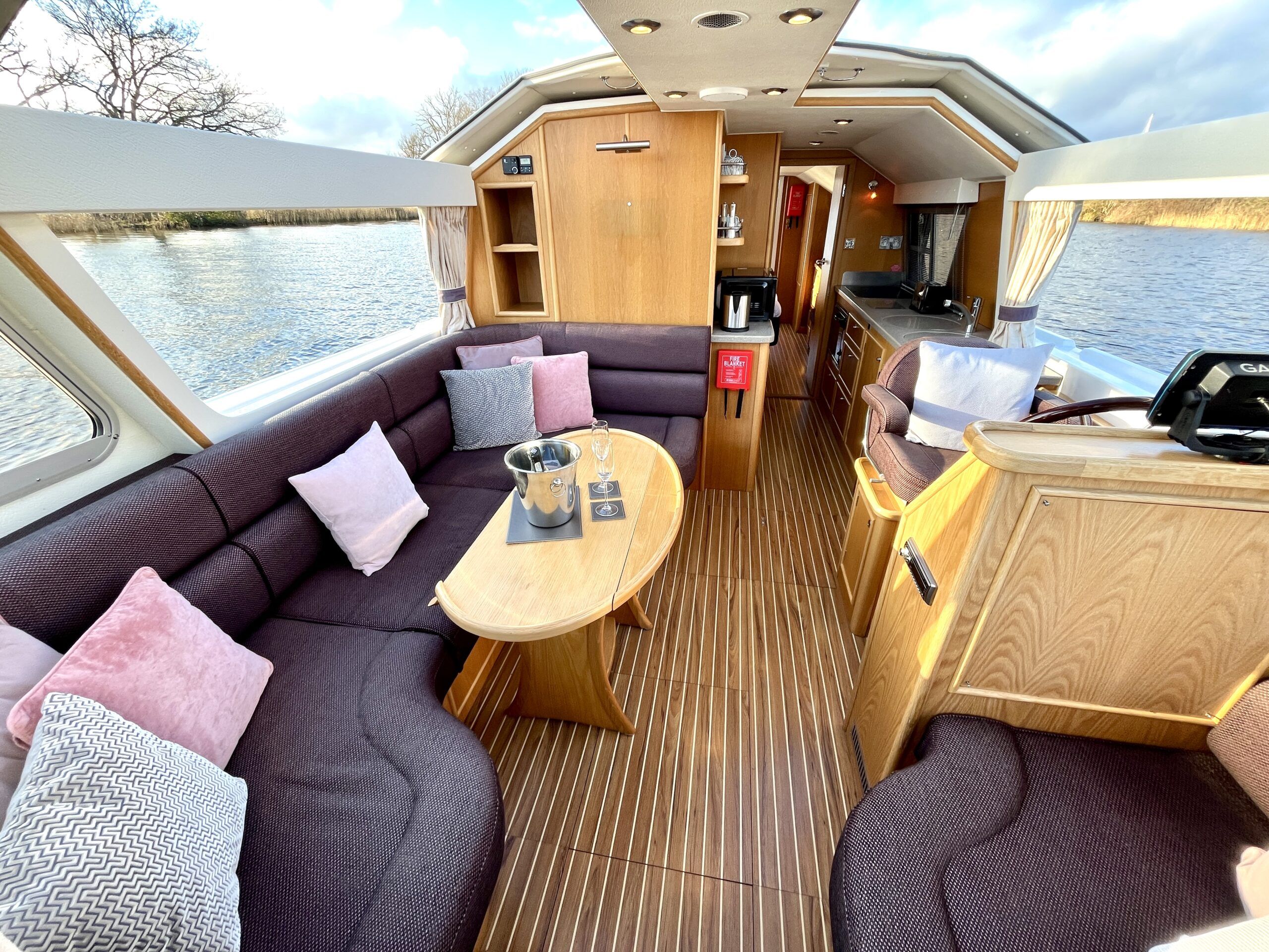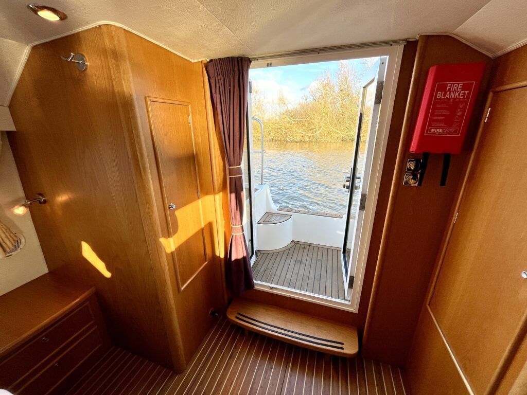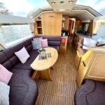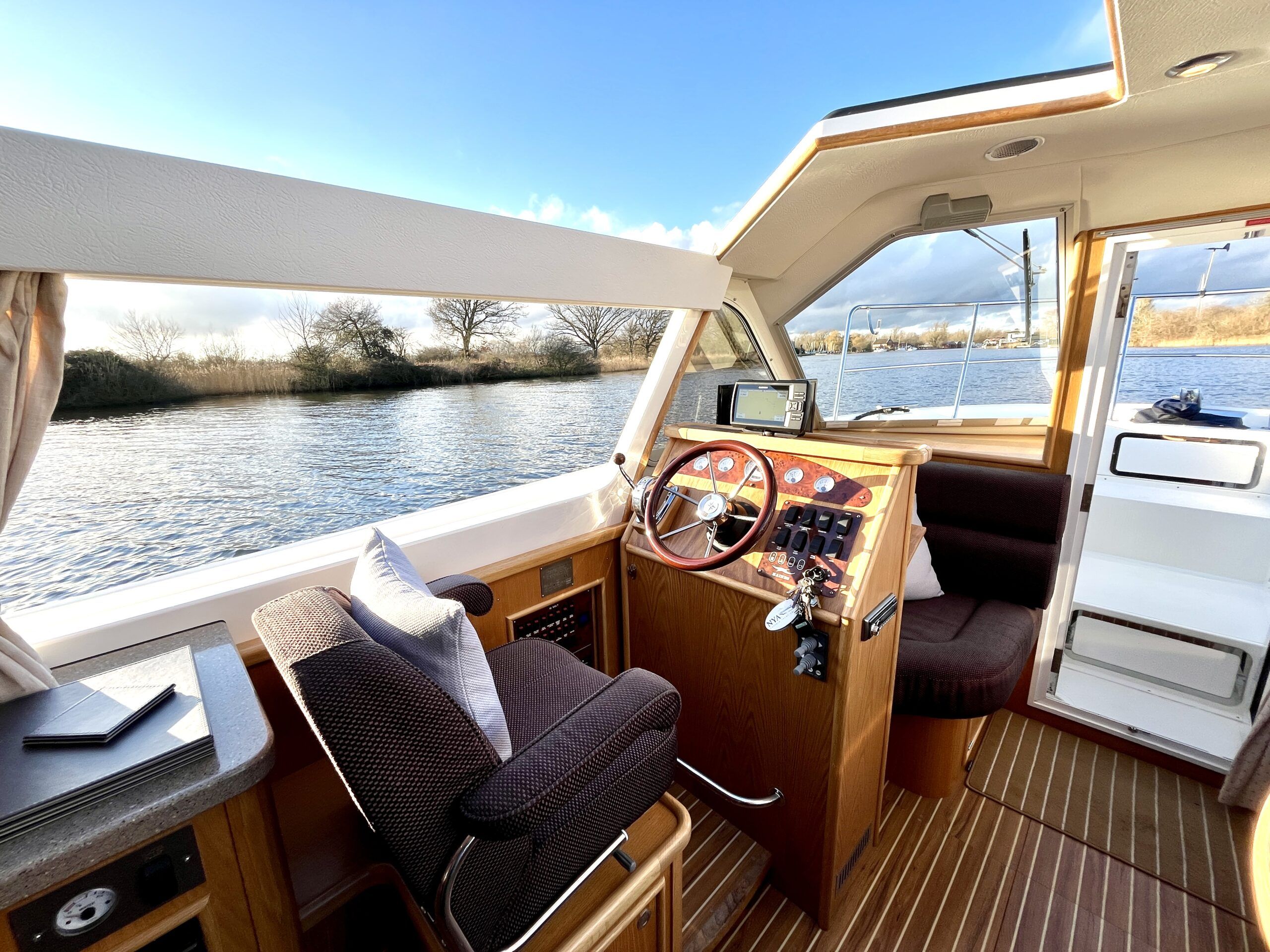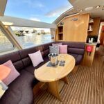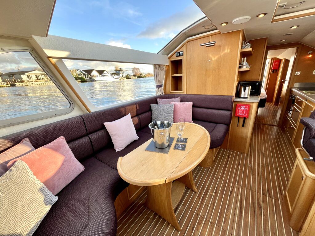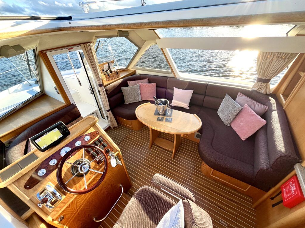 Olivia, a new addition for 2026 to the NYA Charter Fleet offering the ultimate in spacious and stylish accommodation for two. Featuring a light & airy oak interior with large island double cabin complete with ensuite and walk in shower. The spacious saloon & driving position with split sliding roof gives a luxuriously comfortable sun trap & offers fantastic views of the Broads whilst dining or relaxing. The beautifully fitted galley makes catering on board a pleasure. Bow and stern thrusters ensure handling is carefree. Experience the highest level of boat ownership with all of the modern comforts on board. Please contact 01603 713434 or email charter@nya.co.uk for availability and pricing in 2026.